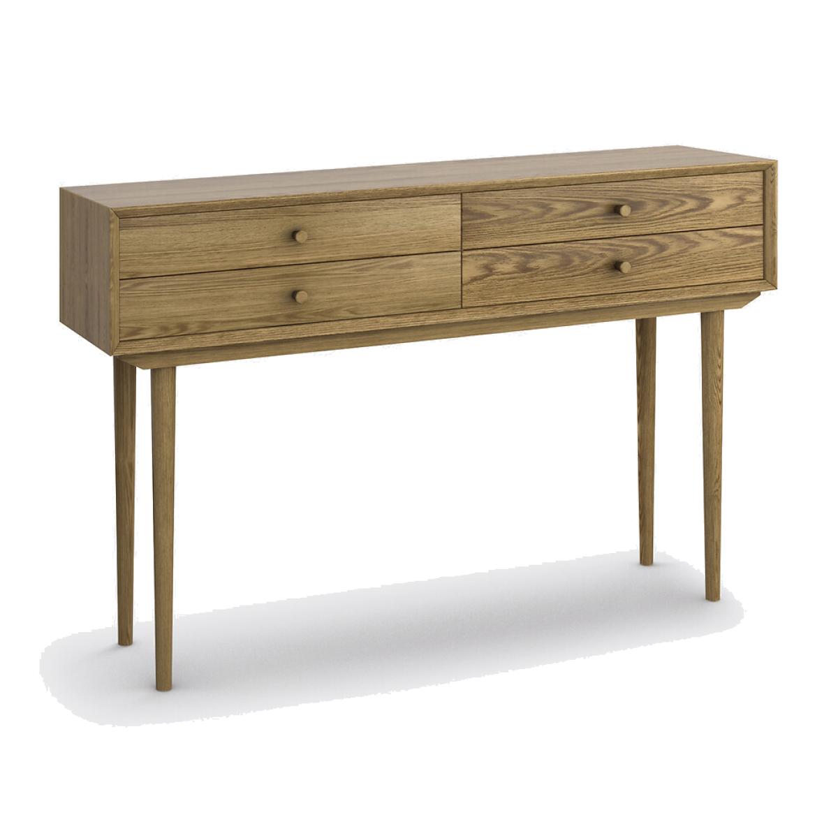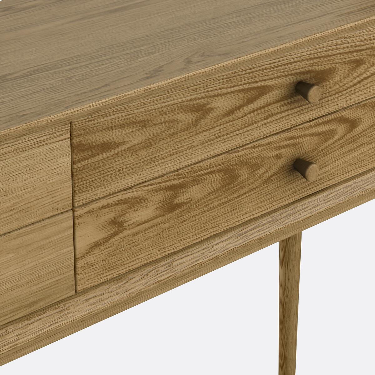 The spirit of Scandinavian design in a console. Quilda is an exclusive creation signed by our in-house designers. This timeless piece of furniture is one of our customers' favourites. Vintage-inspired lines, tapered legs, stained oak... Quilda combines style and functionality. Product Details • Cabinet and drawers in oak and medium oak veneered MDF, nitrocellulose varnish finish • Solid oak legs • 4 drawers • Tapered legs • Legs are self-assembly. Dimensions • Length: 120cm • Height: 76cm • Depth: 30cm • Usable drawer dimensions : L58 x H9.6 x D22cmDelivery:. Sold with feet to be attached. Available for home delivery. Note! Please check that all access points are large enough to accommodate your delivery (doors, stairs, lifts). • WOOD FROM MORE SUSTAINABLY MANAGED FORESTS AND CONTROLLED SOURCES. FSC® Mix wood contains at least 70% FSC® certified and/or recycled wood, the remainder being FSC® controlled wood. Parcel Dimensions:1 parcel • L126.5 x H33.5 x D36.5cm • 26kg