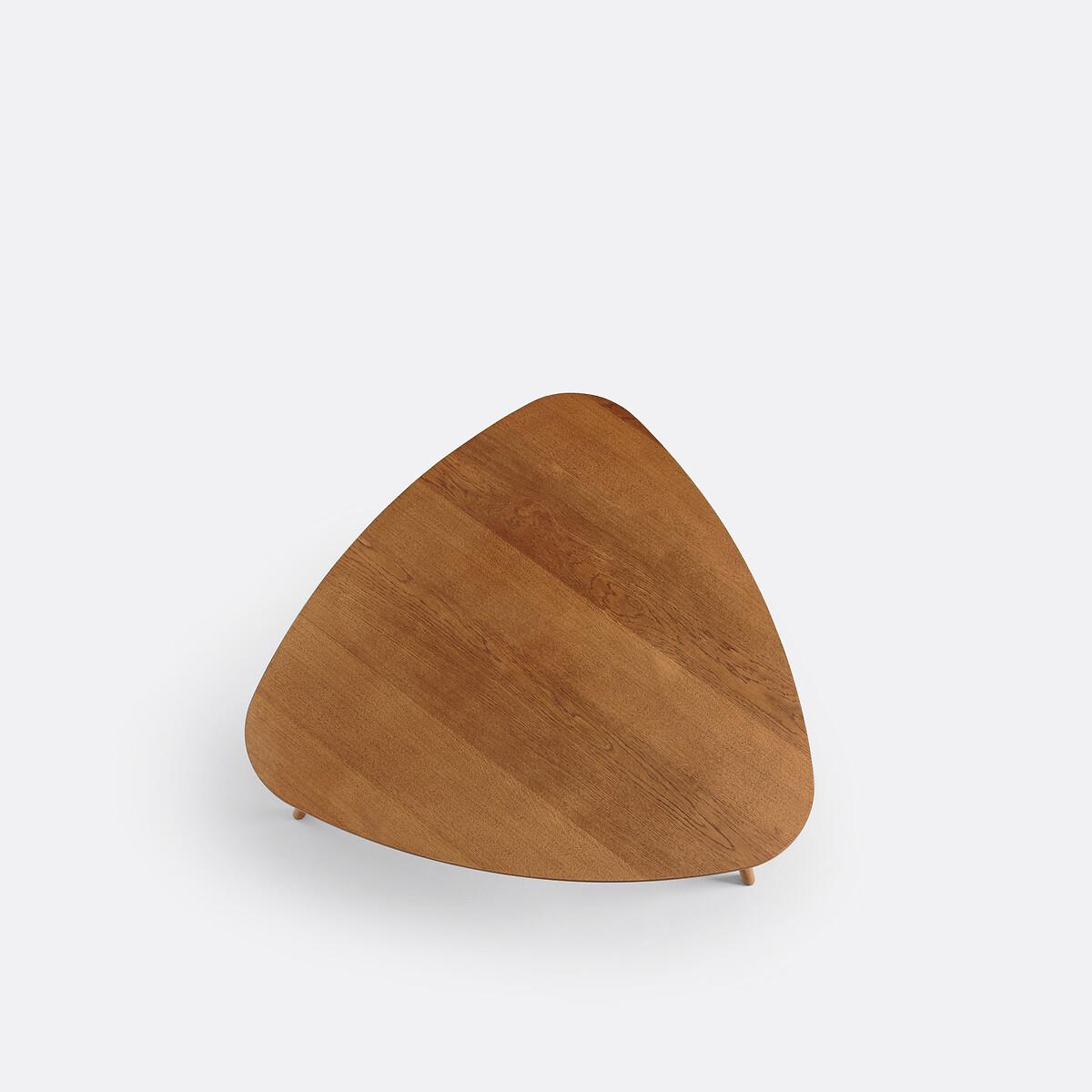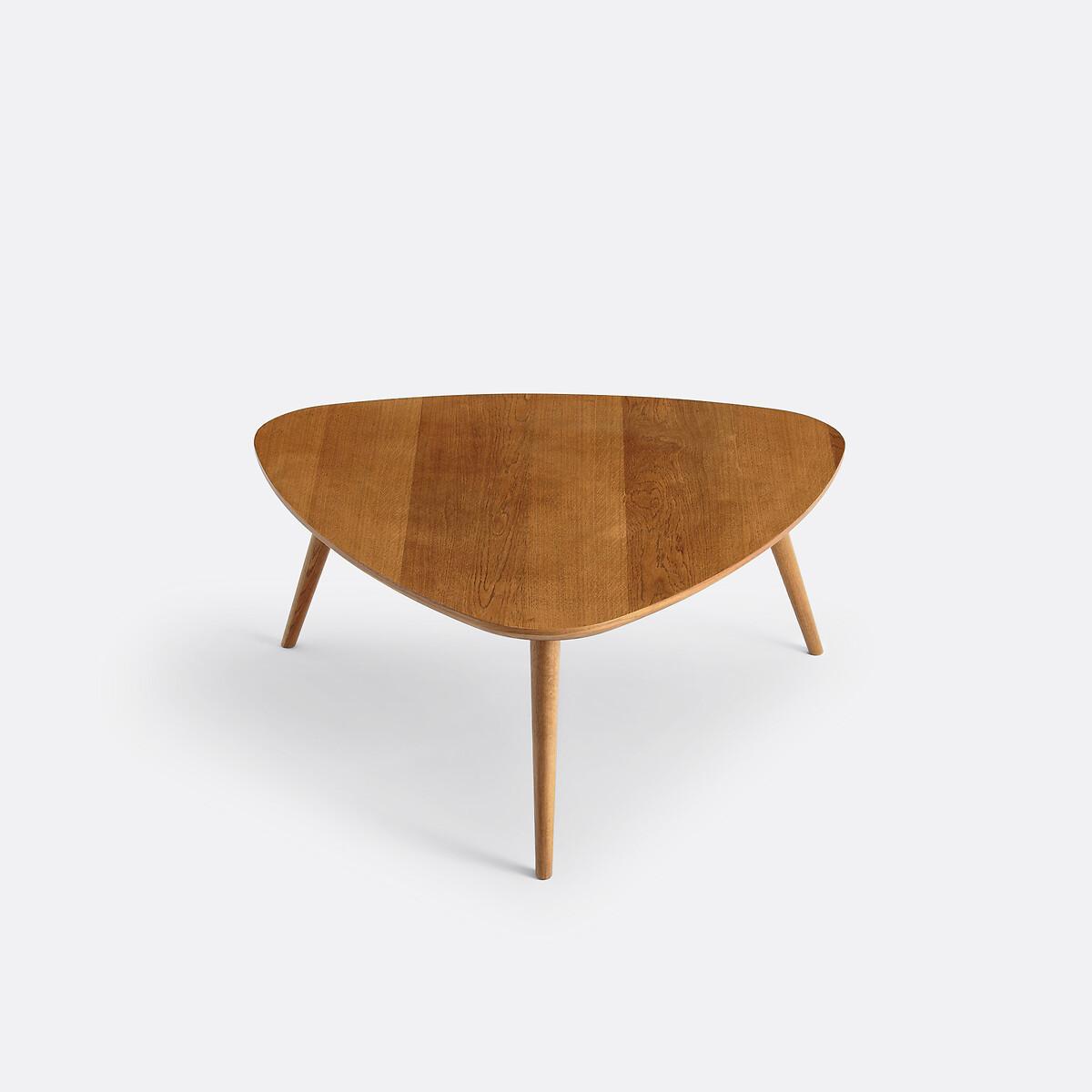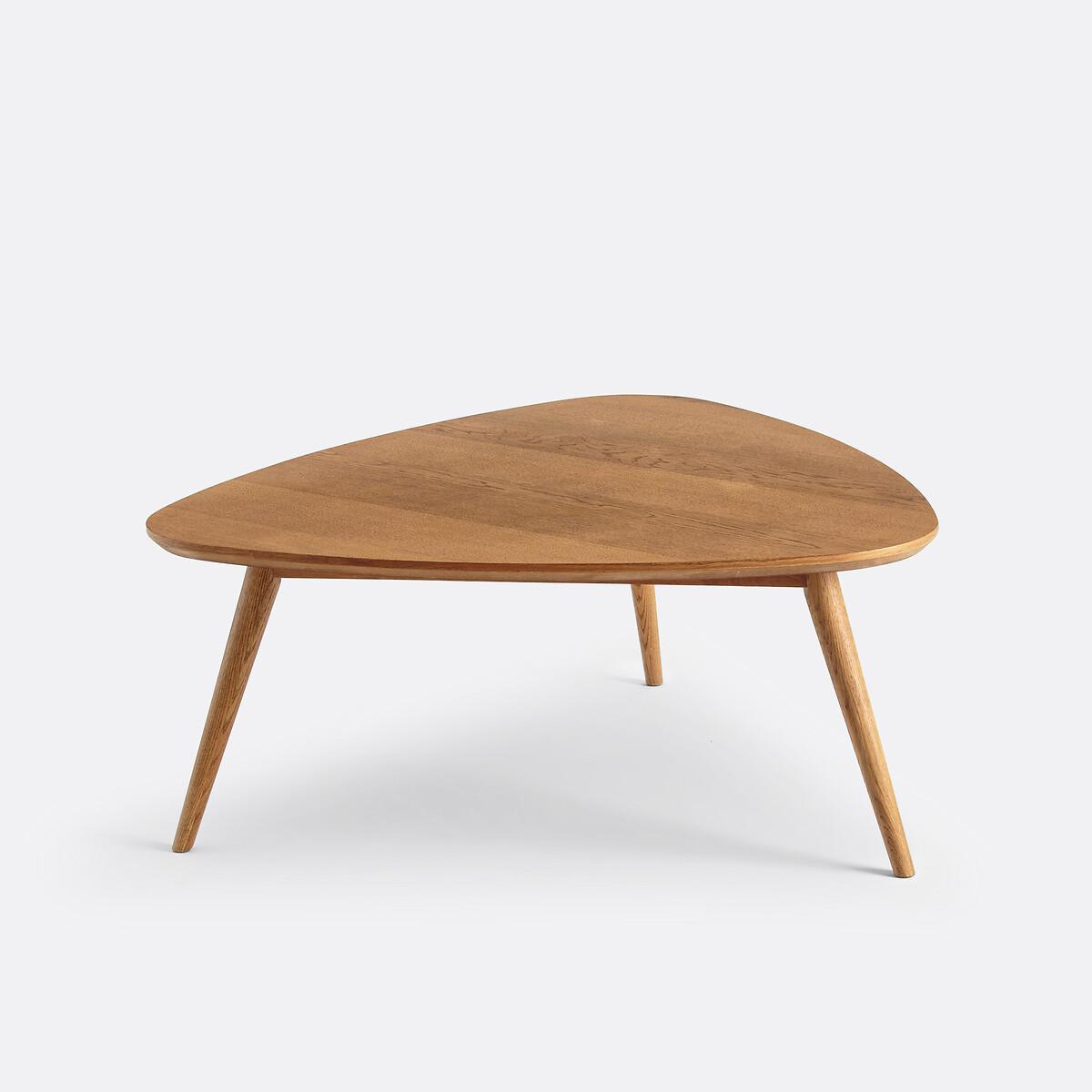 In terms of welcome and conviviality, the Quilda coffee table has only good sides: original top design, warm colours and quality materials. Product Details • Rounded triangle top with bevelled edge. • Tapered legs. • MDF table top with medium oak veneer and nitrocellulose lacquer finish. • Tapered solid oak legs with nitrocellulose lacquer finish. • Felt pads. Dimensions. Overall • Length: 100cm • Height: 42.5cm • Depth: 96.6cmDelivery:. This product is sold for self-assembly. Parcel dimensions and weight:1 parcel • 110 x 15 x 103cm • 23kg
