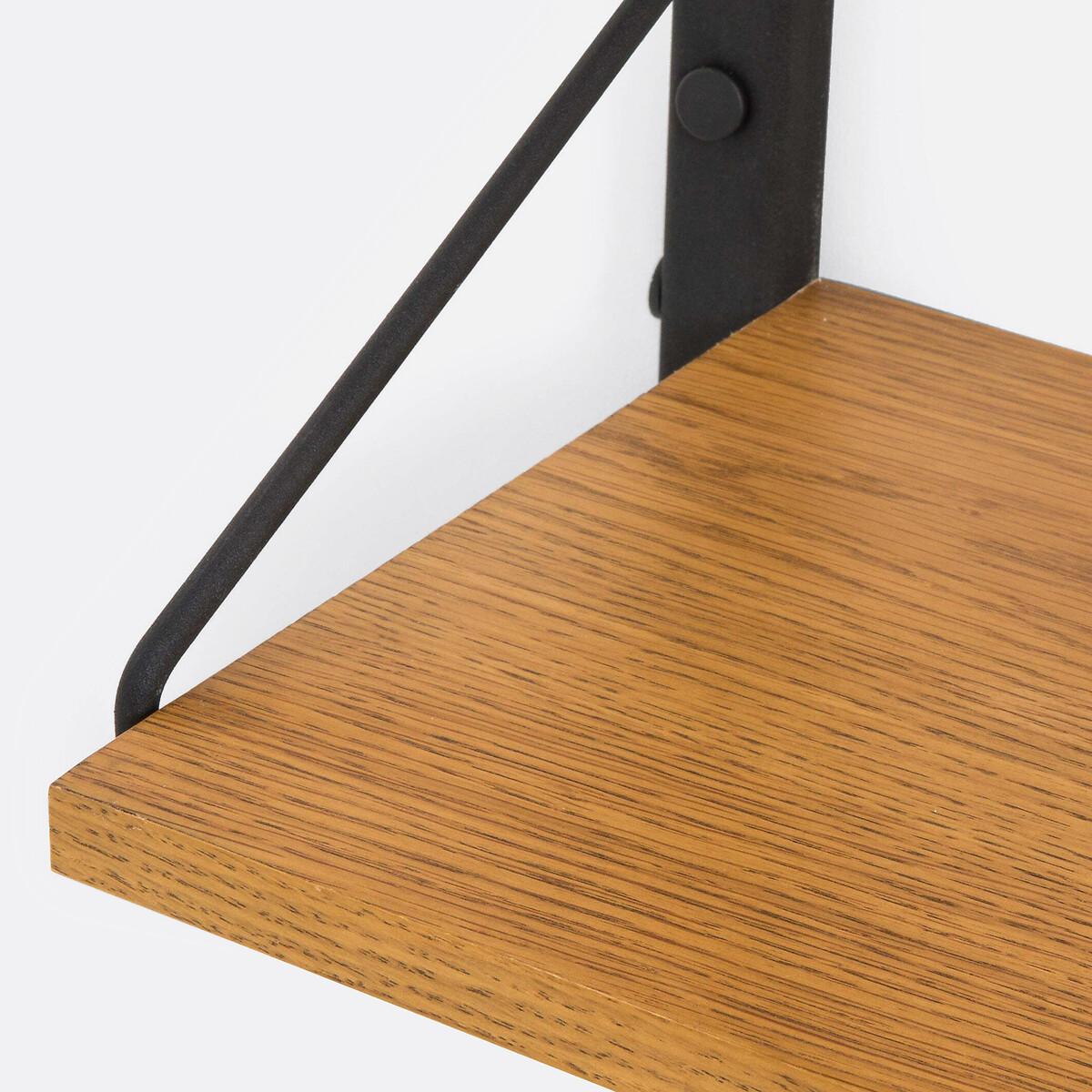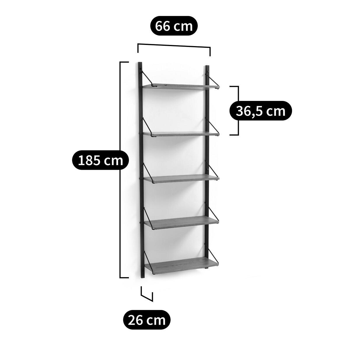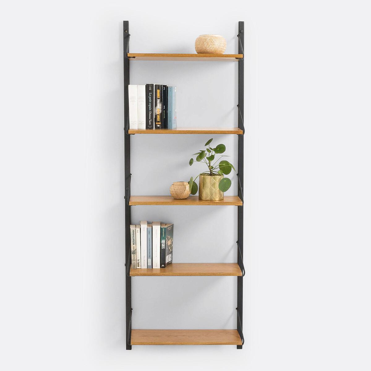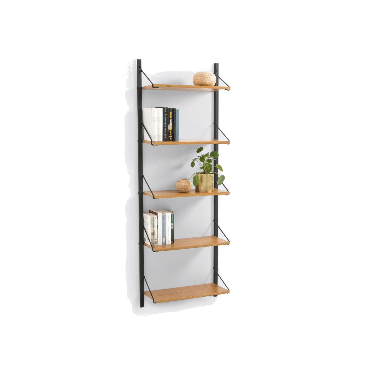 This minimalist wall-mounted bookcase takes its inspiration from vintage trends with a classic mix of wood and metal. Product Details • 5 fixed MDF shelves with oak finish and nitrocellulose varnish • Vertical brackets in black lacquered steel with epoxy paint finish • Fixes to the wall Dimensions • Width 66 cm • Height 185cm • Depth 26 cm • Useable space between each shelf 36.5 cm • Shelf L60 x D26 cmDelivery:. Assembly required. Available for home delivery. Note! Please check that all access points are large enough to accommodate your delivery (doors, stairs, lifts). • WOOD FROM SUSTAINABLY MANAGED FORESTS. FSC® certified wood comes from forests that are environmentally, socially and economically well managed. Dimensions and weight of parcel1 parcel • L 212.5 x H10 x D39 cm • 20kg