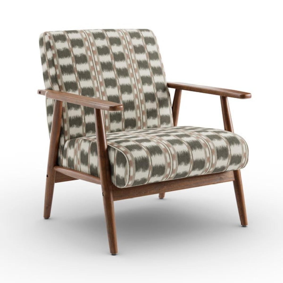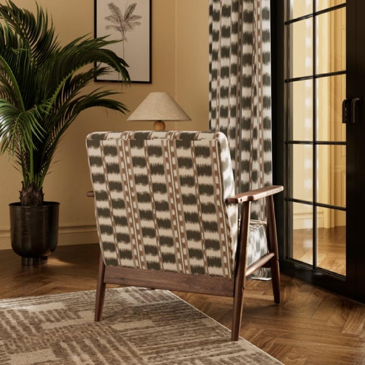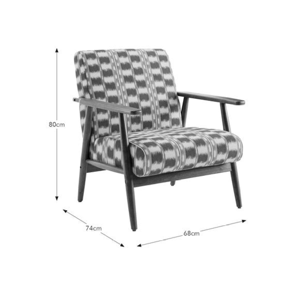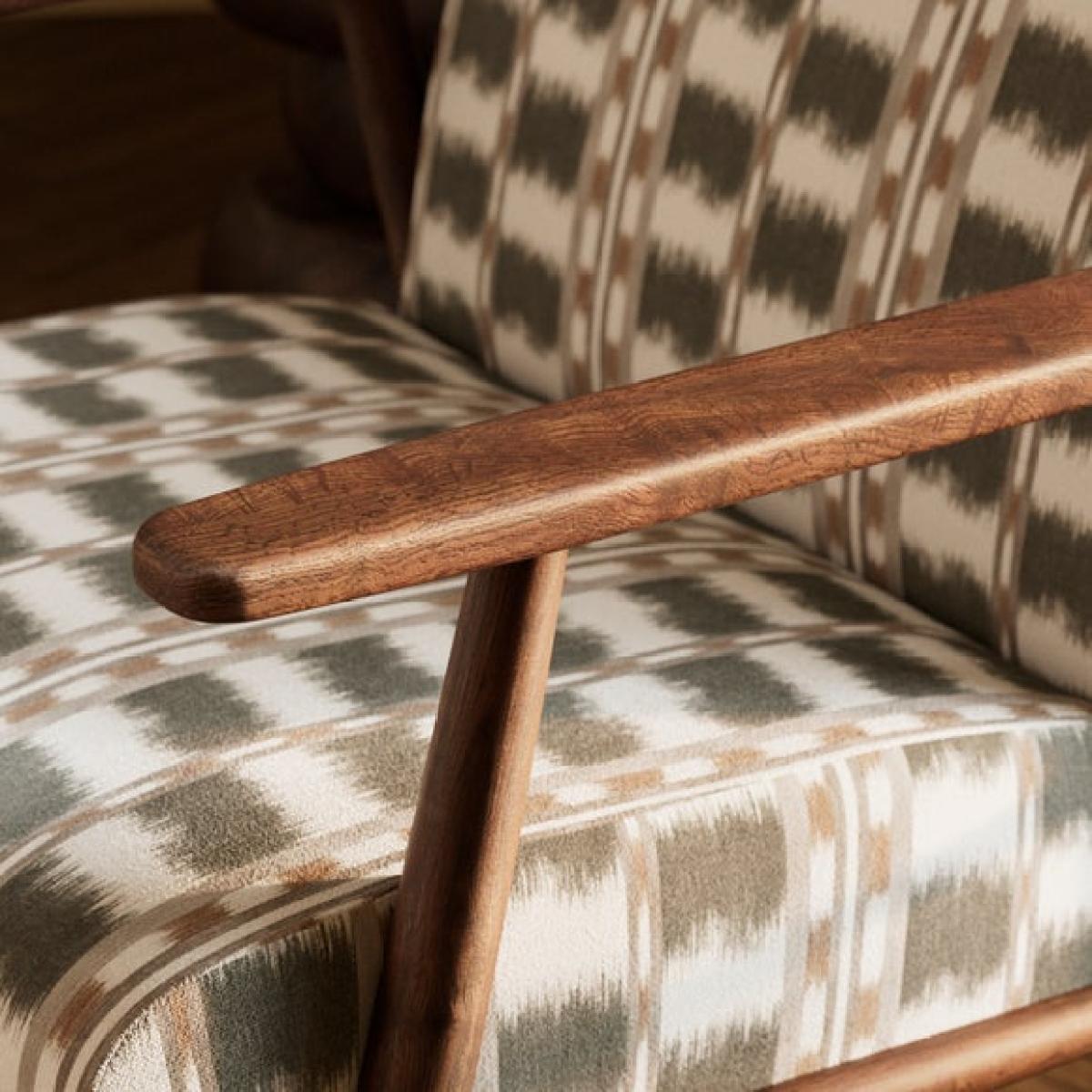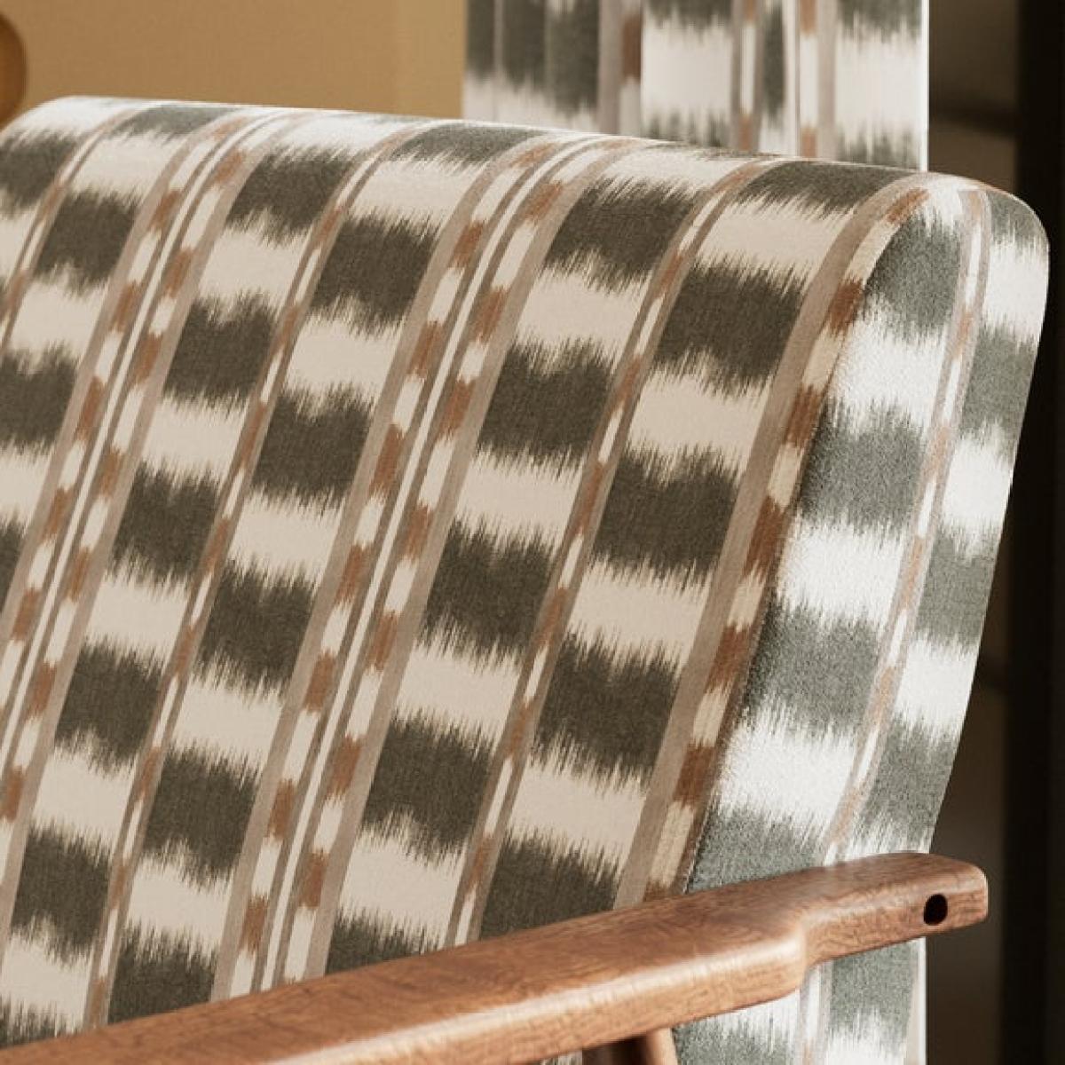 * Wooden frame * Bold upholstery * Curved arms * Foam filled seat This chair is a fresh take on classic design, with its wide paddle arms and solid wooden frame, giving it a grounded, architectural presence, while the striped fabric in soft green tones adds a relaxed, contemporary feel. The foam-filled seat offers lasting comfort, making it ideal for long conversations, quiet reading, or simply unwinding.