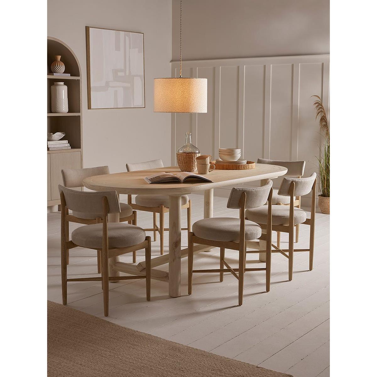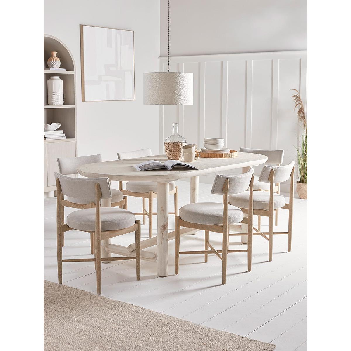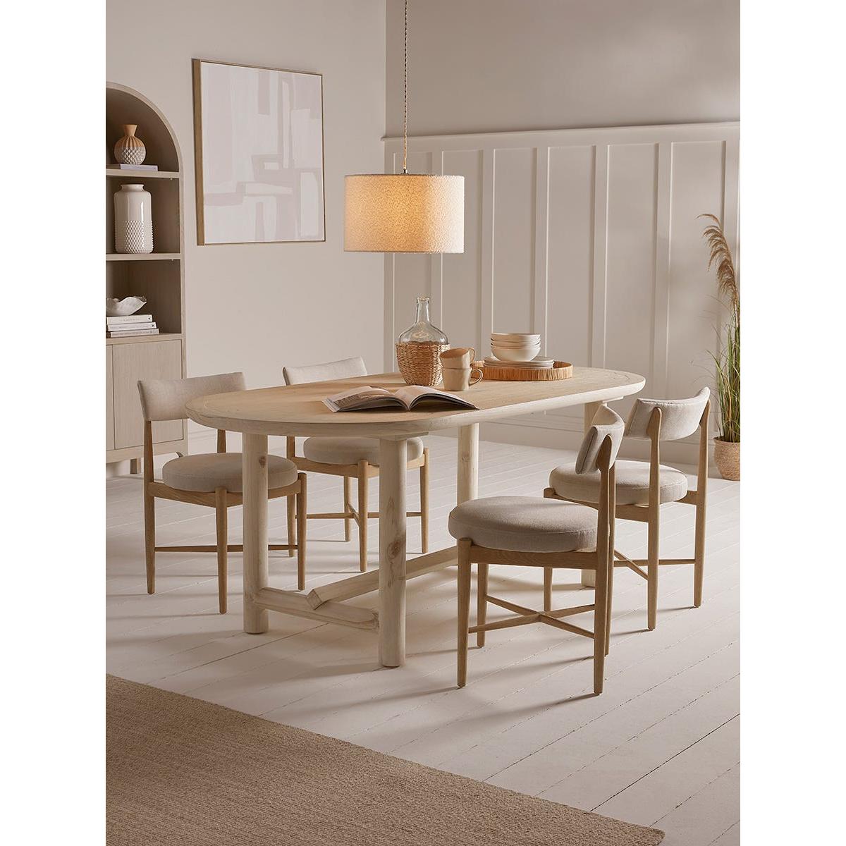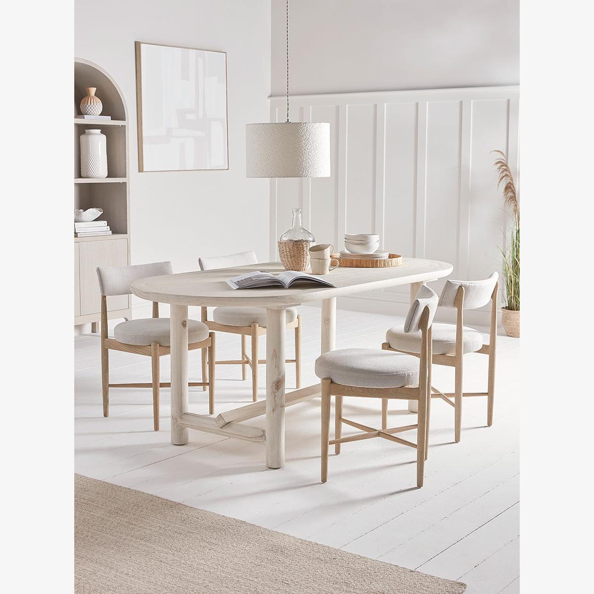 Full of cool Scandi charm, the Quinn Dining Table is defined by the pale limewashed finish which softens the look of the natural pine. The simple oval top pays homage to the beautiful texture of the wood beneath, showcasing the depth of grain and knotting. The rounded legs and stretcher have a wonderful handcrafted look for a cosy log cabin feel. The unusual shape is the perfect choice for those who cant decide between the versatility of a rectangular dining table and the compactness of a round table.