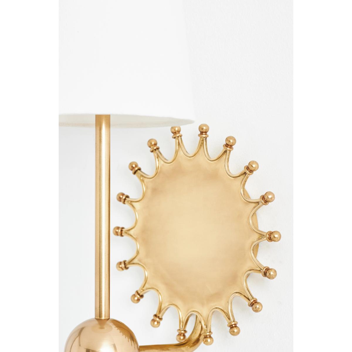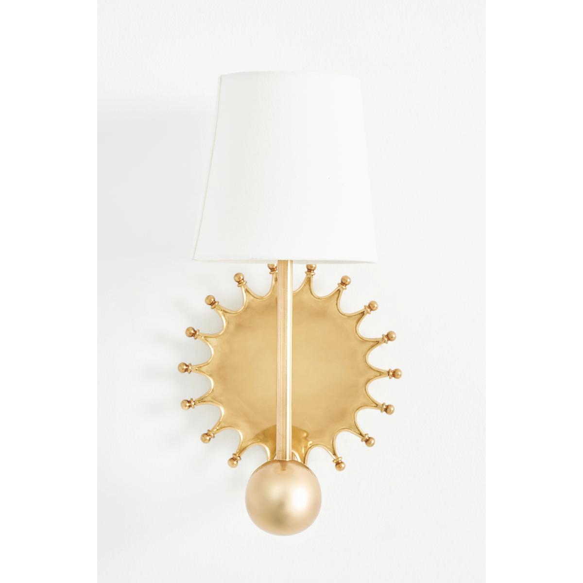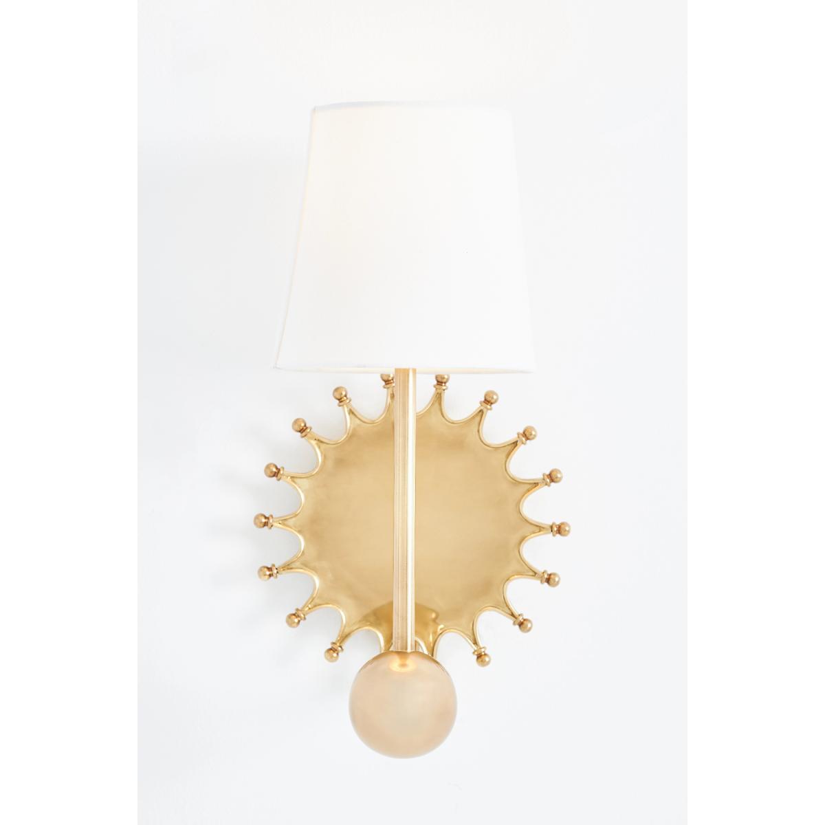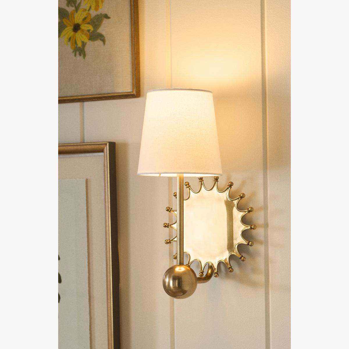 A playful yet sophisticated option for an entryway or bedside light source, this sconce features a sun-inspired mounting plate in gleaming brass paired with a soft textile shade. *This item is CE listed, meaning it has been tested and approved to meet the government-regulated safety standards for the UK. Use with electrical outlets of 230v or lower, as anything higher can cause fire or injury. If you're purchasing this item for use outside of the United Kingdom, employ the adapter and voltage converter suited for your country* * Dry-rated * Brass wall sconce with iron electric fitting * Tapered drum textile shade * Hardwired; professional installation recommended * Cannot be installed with a dimmer * Includes mounting plate * One light socket * 25 watt max * We recommend using type E14 / G Globe LED bulbs * CE listed * Imported