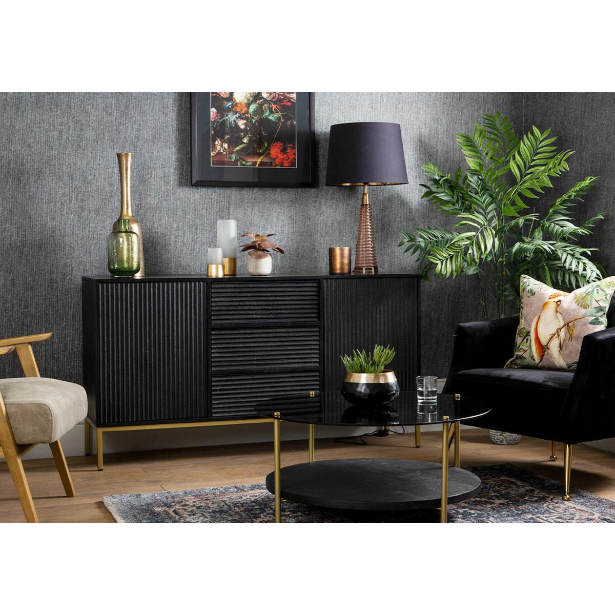 I’m a fan of this fluted sideboard for its clean lines and subtle texture - the slim brass legs give it just enough warmth without overpowering the design. It sits equally well in a modern, mid-century or art-deco-inspired scheme, offering concealed storage that keeps living areas feeling uncluttered. For styling, I’d group items in odd numbers and vary heights: a low plant pot, a tall metal vase and a medium-height lamp, for example. Stick to a restrained palette - think soft neutrals with a couple of metallic accents - and let the sideboard’s texture do the talking.
