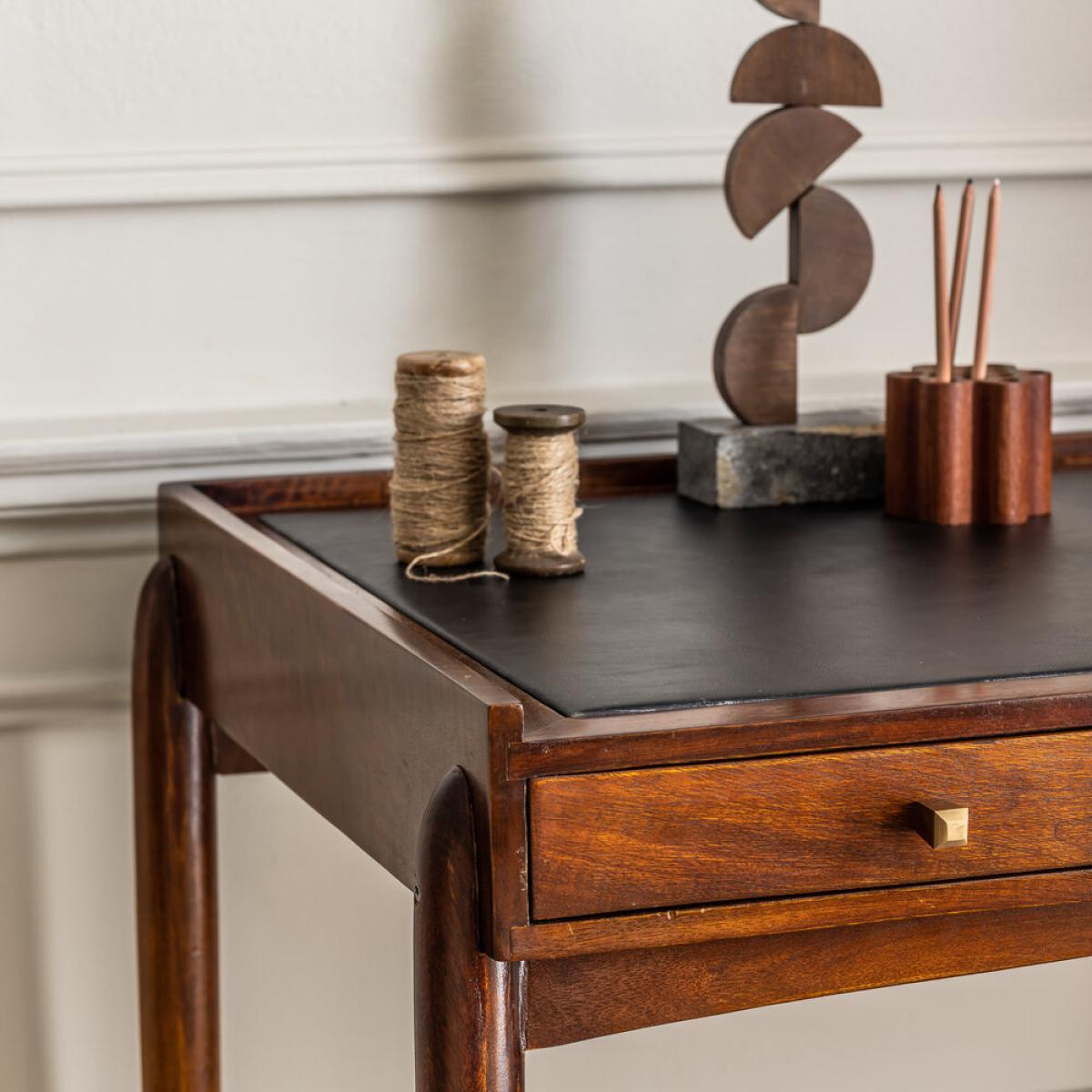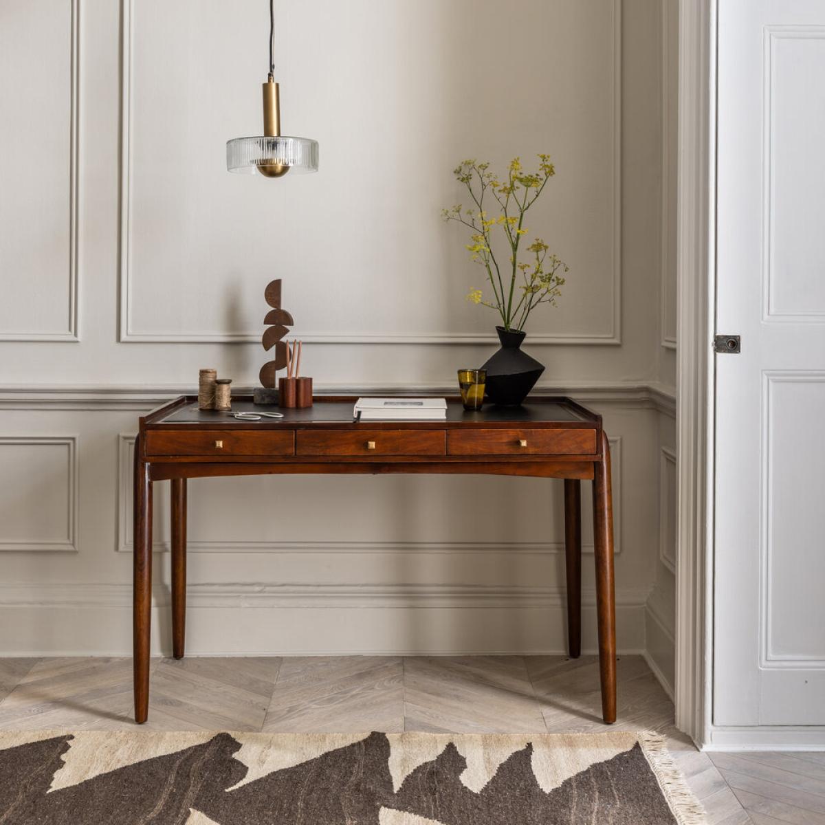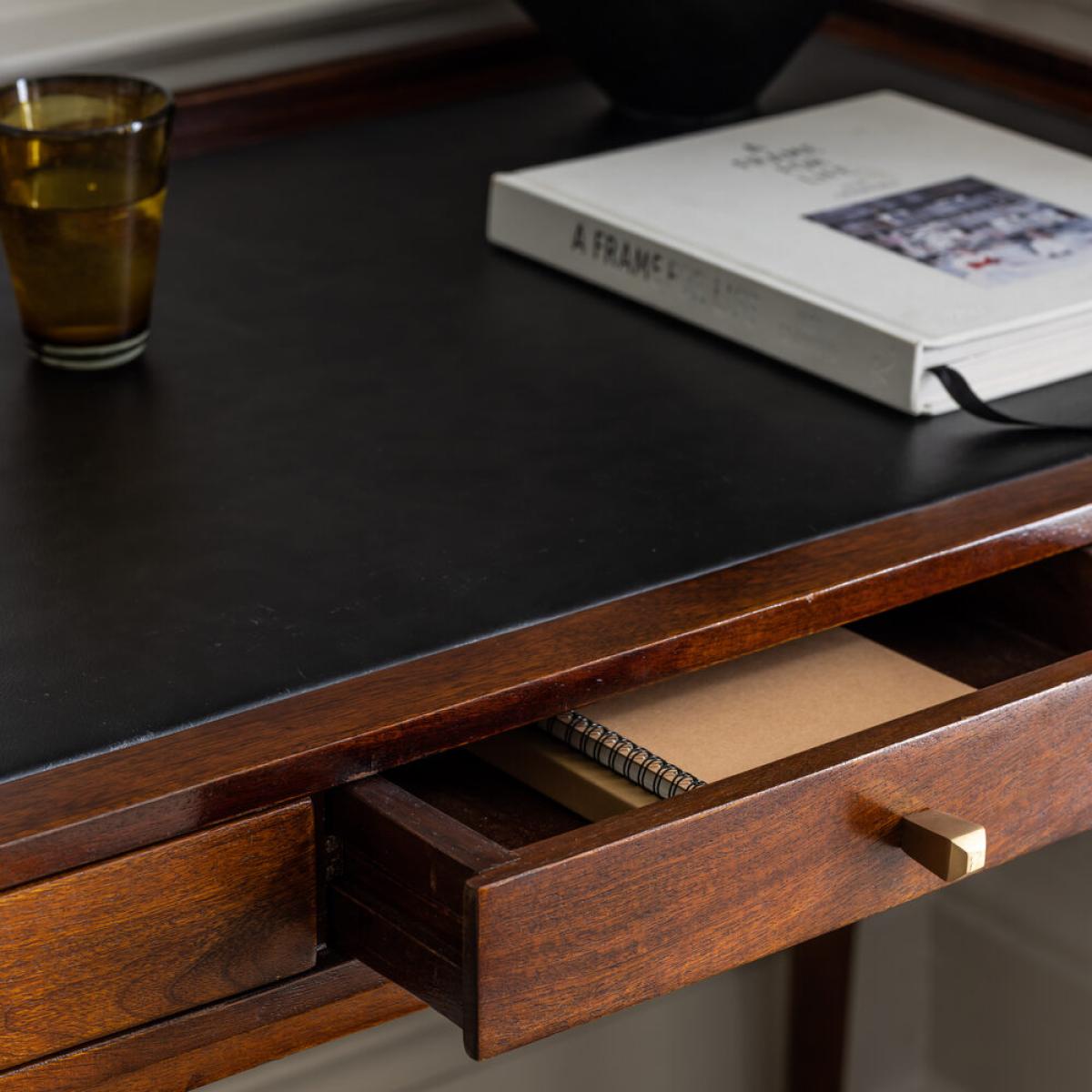 Expertly crafted from sustainable mango wood our Quinn Writing Desk is a perfect spot for studying or working from home. The desk has three drawers for keeping papers and stationery tidy, a gorgeous soft black leather top for that classic desk appeal, and a lovely vintage patina. Inspired by the mid-century modern designs of the period from 1933 to 1965, this is a classic desk that you will own for many years to come. Finish the mid century look with our Quinn range that includes a sideboard, bedside table, drawers, console table, drinks cabinet, coffee table and mirrors.