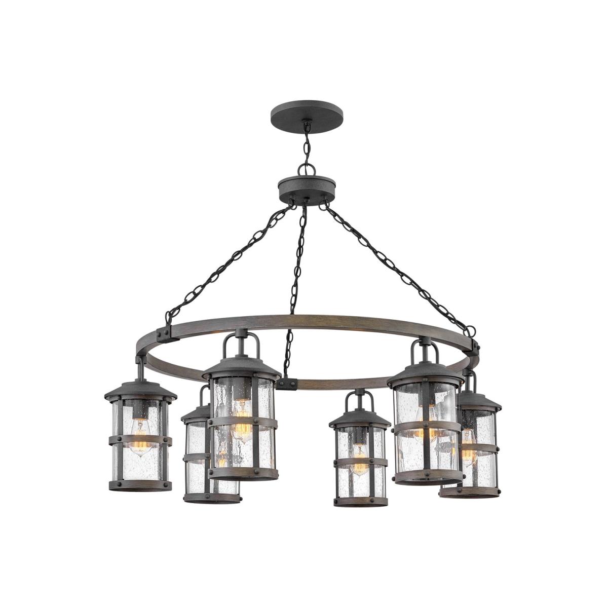 Transform your garden with the Quintiesse Lakehouse 6 Light Outdoor Chandelier in Aged Zinc with Driftwood Grey accents. The relaxed yet satisfying look of Lakehouse brings coastal casual style to your outdoor space. Its distressed Aged Zinc finish paired with Clear Seeded Glass exudes rustic charm, while Driftwood Grey finish rings add a touch of warmth and authenticity. Crafted from cast aluminum, Lakehouse ensures longevity, promising years of enjoyment. Simple yet memorable, Lakehouse captures the essence of coastal living, making it an ideal addition to your garden or outdoor area. Trust in Elstead's commitment to quality and design to elevate your outdoor ambiance with the blissful simplicity of the Lakehouse Outdoor Chandelier. Additional Information: Product Finish: Aged Zinc with Driftwood Grey Shade Colour:Clear Seeded Assembly Required?:Yes - Electrican installation advised Bulb Included: No Bulb Quantity: 6 Bulb Type: E27 Max Wattage: 60W . Height Adjustable:On Installation Power Source: Mains Voltage Dimmable: N/A IP Rating: IP44 Minimum Drop Length: 927mm Maximum Drop Length: 2487mm Dimensions: H: 37.3 cm x W: N/A cm x D: N/A cm x Dia: 94.9 cm