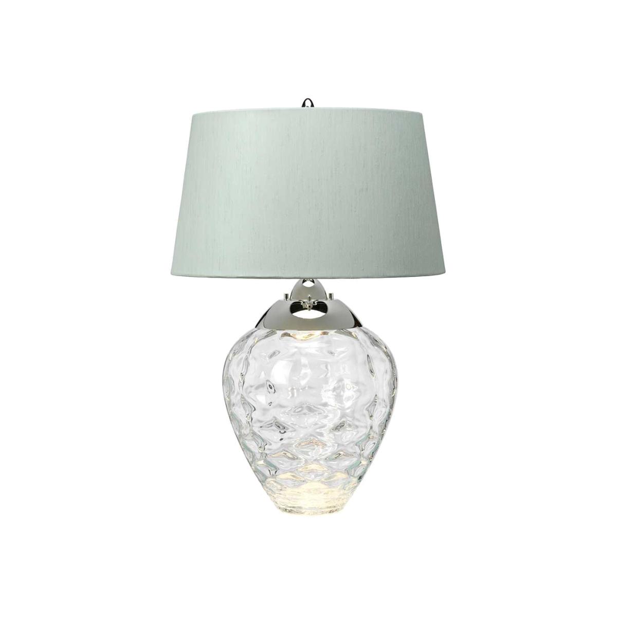 The Quintiesse Samara Table Lamp in Clear combines classic design with modern elegance. Featuring textured blown glass and polished nickel metal-work, this table lamp is both arresting and gorgeous. The hand-made fabric shade adds a touch of sophistication, while the 4-way switch offers independent light sources for the shade and the glass, providing versatile lighting options. Crafted from high-quality steel, clear glass, and faux silk, the Samara Table Lamp ensures durability and style. Its clear finish complements various interior décor styles, making it a perfect addition to living rooms, bedrooms, or offices. Whether used as a reading light or a decorative piece, the Samara Table Lamp adds a refined touch to any space. The included GU10 bulb ensures bright and efficient lighting, enhancing the ambiance of your home with its elegant design and practical functionality. Additional Information: Product Finish: Polished Nickel Shade Colour: Chateau (duck egg) Assembly Required?:Yes - Electrican installation advised Bulb Included: 1 x 7W LED GU10 Bulb Quantity: 1 Bulb Type: E27 Max Wattage: 60W . Height Adjustable:No Power Source: plug Dimmable: Not Dimmable IP Rating: N/A Minimum Drop Length: N/A Maximum Drop Length: N/A Dimensions: H: 71.5 cm x W: N/A cm x D: N/A cm x Dia: 45.7 cm