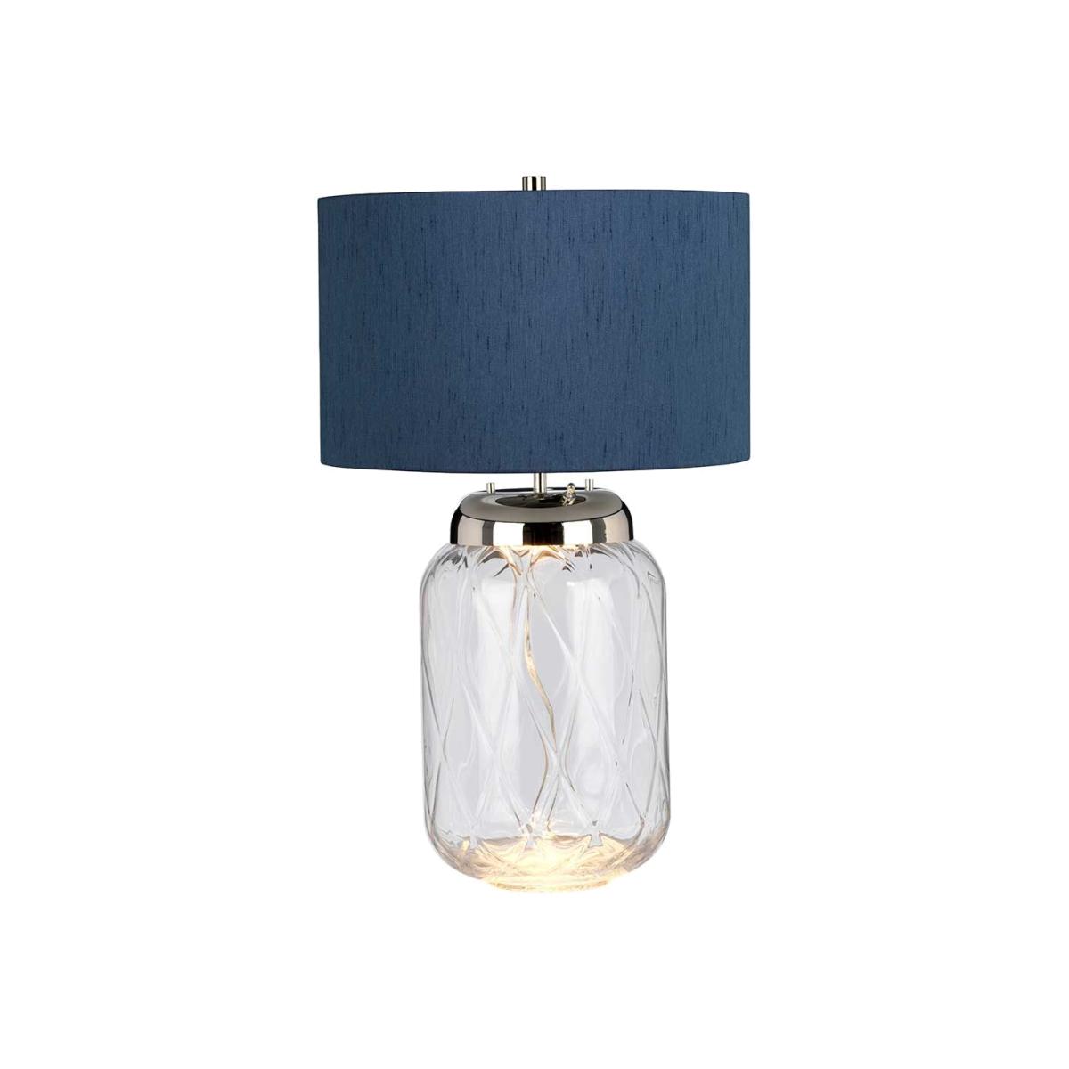 Quintiesse Sola 2lt Table Lamp - Breton Shade: The Quintiesse Sola 2lt Table Lamp with a Breton Shade is a masterclass in modern elegance. Featuring a diamond-patterned hand-blown glass base, this lamp brings a touch of refined detail to your contemporary decor. The polished nickel finish pairs beautifully with the clear glass, creating a striking visual contrast that enhances its sophisticated look. With a 4-way switch, this lamp offers independent control of the light sources for the shade and the glass base, providing versatile lighting options to suit any setting. The included GX53 bulb ensures you can start enjoying this stunning piece right away. Ideal for living rooms, this table lamp is not only a functional lighting solution but also a decorative element that elevates the ambiance of any space. The Sola 2lt Table Lamp combines high-quality materials and meticulous craftsmanship, making it a premium choice for those who appreciate both beauty and functionality in their home decor. Additional Information: Product Finish: Polished Nickel Shade Colour: Breton (blue) Assembly Required?:Yes - Electrican installation advised Bulb Included: 1 x 9W LED GX53 Bulb Quantity: 1 Bulb Type: E27 Max Wattage: 60W . Height Adjustable:No Power Source: plug Dimmable: Not Dimmable IP Rating: N/A Minimum Drop Length: N/A Maximum Drop Length: N/A Dimensions: H: 67.5 cm x W: N/A cm x D: N/A cm x Dia: 41 cm