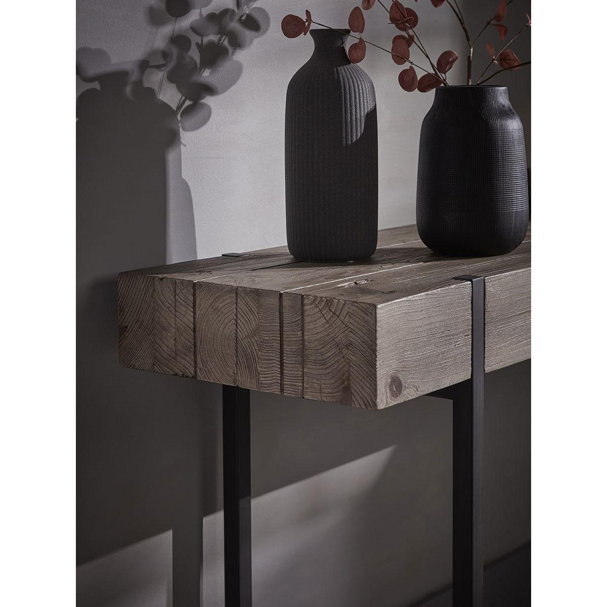 Crafted from recycled pine, our Quito collection has a sharp and angular design, ideal for an industrial style home. Its dark wood boxy table top pairs wonderfully with black metal legs creating a structural quality. Place this console table in your hallway for a place to rest your keys, or decorate with vases and lamps to fill your home with a modern and stylish piece.