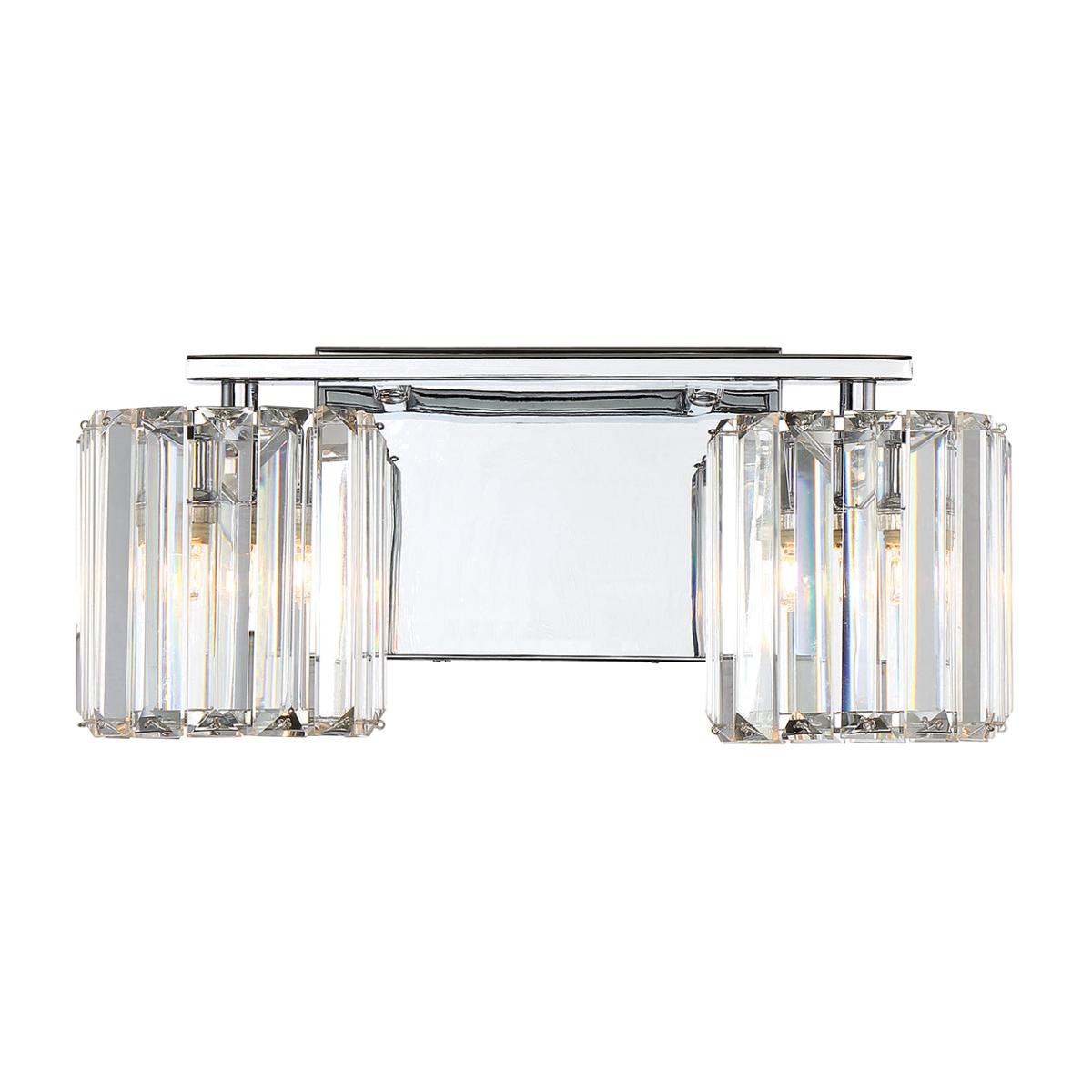 The Divine 2lt Wall light, is exquisite sophistication, the simple backplate gleams in Polished Chrome and reflects every cut and sparkle of the crystal-glass. The refractive glass is arranged in slats pinned top and bottom to form a shade around the LED bulb. IP44 bathroom rated.