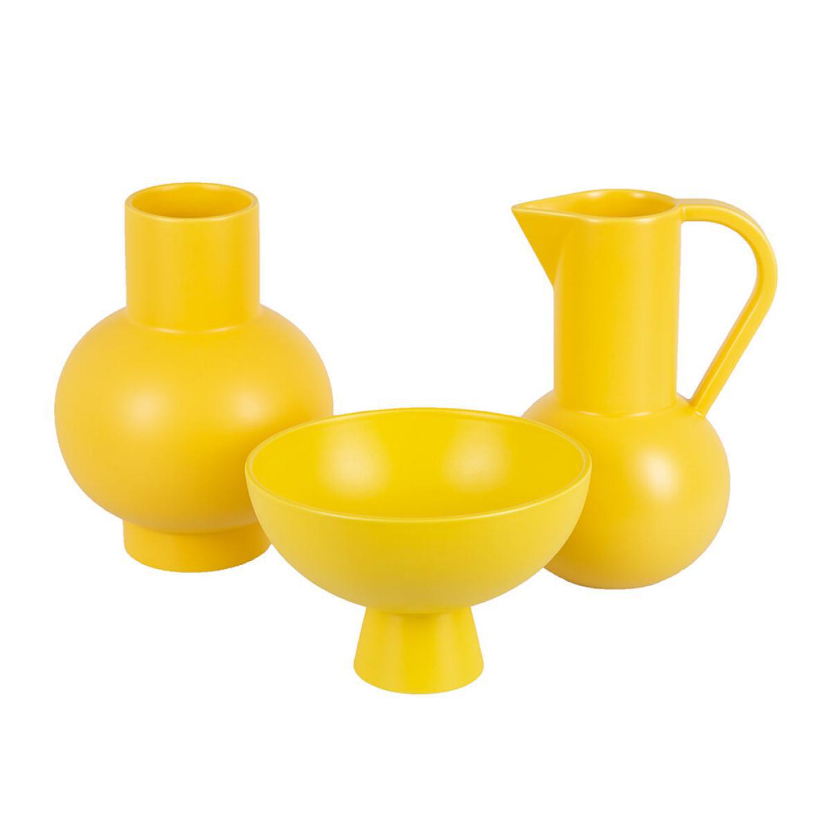 I love this piece for its bold, modern shape and cheerful yellow hue, making it a versatile statement in various interiors. It works particularly well in minimalist or Scandinavian spaces where its clean lines can shine, but it also adds a pop of colour to more muted colour schemes. For styling tips, try pairing it with simple, monochrome florals or greenery to let the vase’s shape and colour stand out. It looks great as a standalone accent on a side table or bookshelf, and because of its size, it also acts as a striking centrepiece on a dining table or console. Its sturdy form makes it suitable for both practical and decorative use, creating a fresh, contemporary feel in any room.