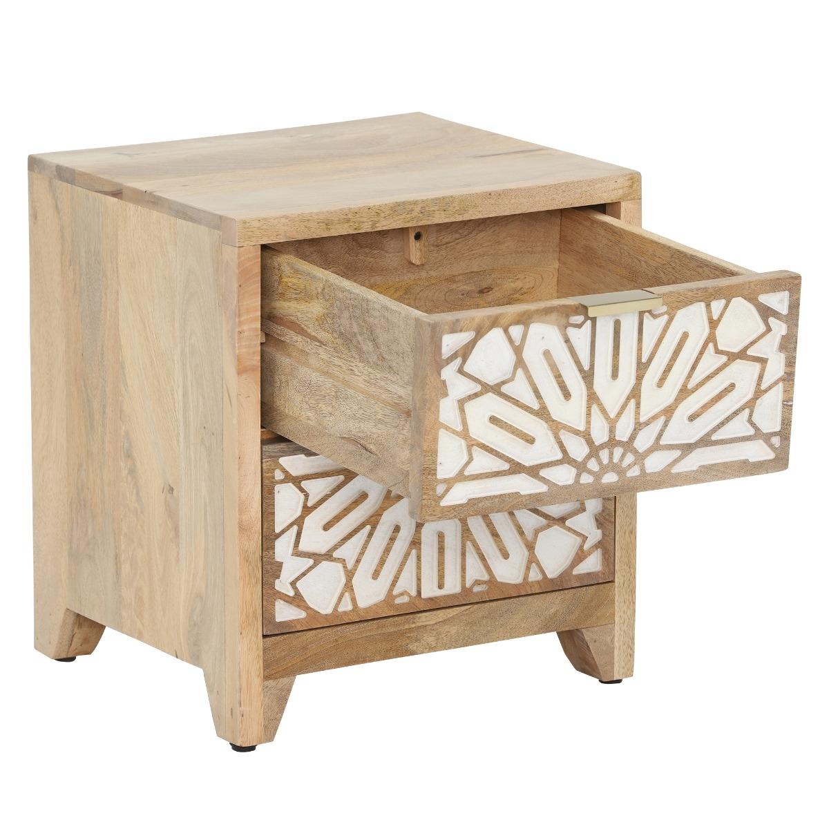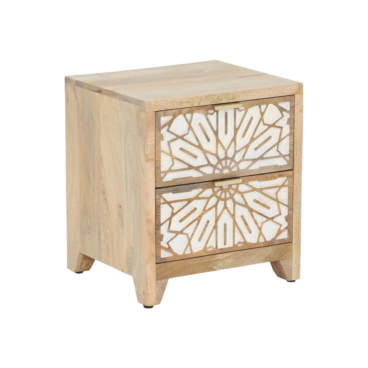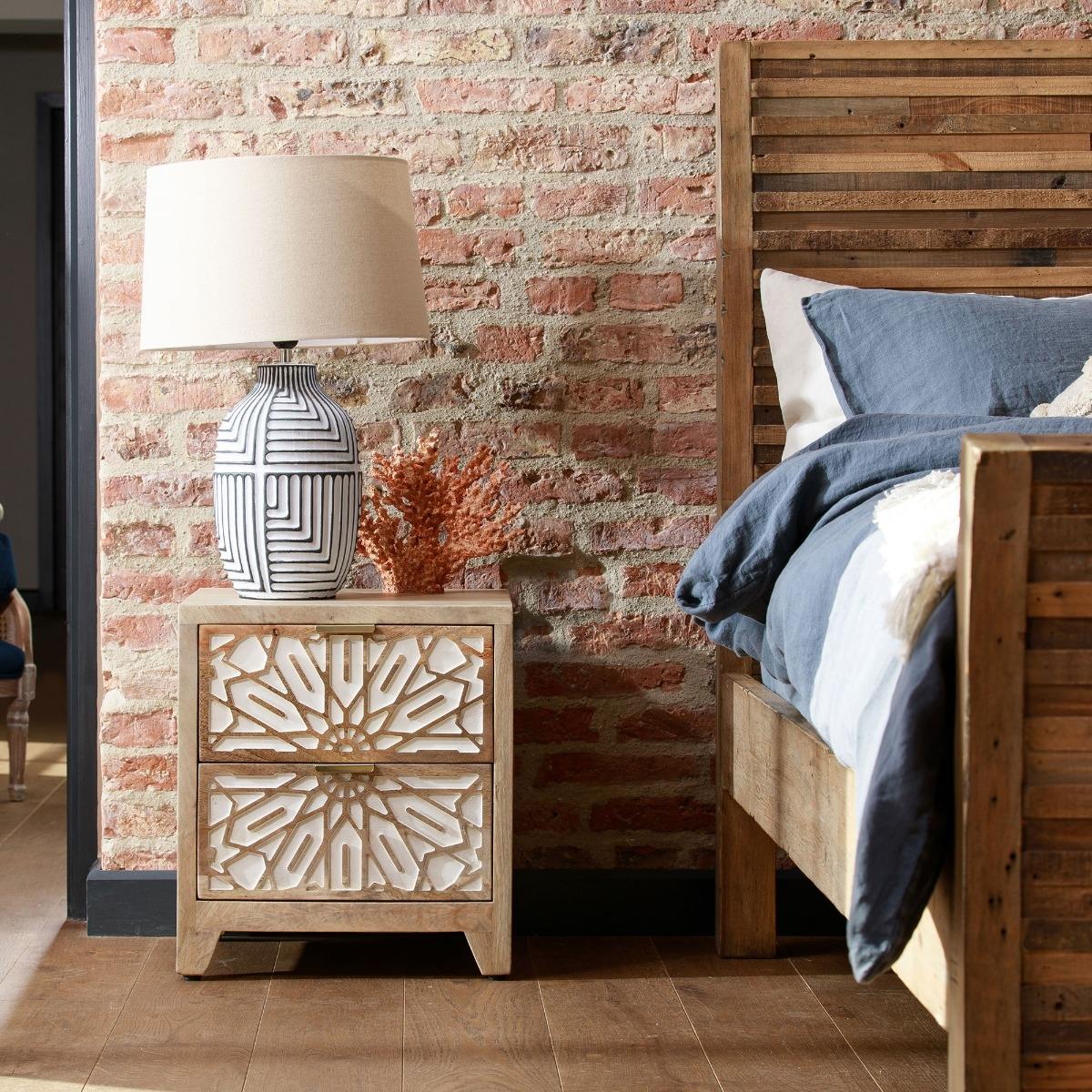 Design. This stylish piece is a gorgeous option for anyone who is a wander luster at heart. Created from beautiful mango wood and hand carved to present a unique and tactile design which nods to bohemian inspiration, the Rabat 2 Drawer Bedside is practical and aesthetic, creating the perfect setting in your bedroom. Two drawers provide just enough space to store handy trinkets and personalpossessions, and the bedside unit is compact enough to create an understated look which will slide perfectly into position next to your bed. For a coordinated look, pair with the. Rabat King Size Bed. And turn your bedroom into a bohemian haven of relaxation.