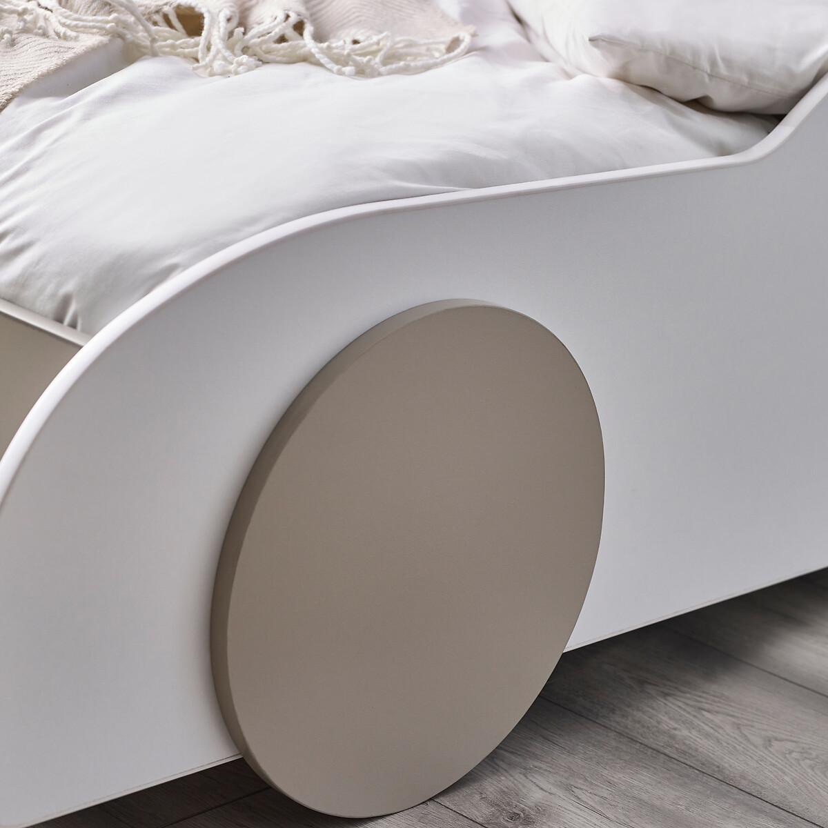 Embark on a thrilling bedtime journey with the Racer Car Bed - a captivating addition to your child's room, meticulously crafted to ignite the imagination of young adventurers. With a sleek white finish that adds a touch of modernity, this car bed is equipped with wheels for an extra dose of fun. Your little one can cruise into dreamy adventures right from the comfort of their bed. Designed with safety in mind, this car bed ensures a secure and sturdy sleep environment, sparking creativity and turning bedtime into an imaginative experience that your child will cherish. Product details• Lacquered finish• Wheel detail• Upper shelf on headboard perfect for storing bedside items• Assembly required• Fixings included• Max weight capacity - 8 stone• Mattress not included• Compatible with UK Cotbed mattress - 70 x 140cm• Maximum mattress height - 23 cm• 12 Month product guarantee. Suitable for use with a 70 x 140cm cot bed mattress Composition - 100% Particleboard Overall Dimensions 196.6 cm x 141.1 cm x 178 cm , Weight - 123.8 KGShelf dimensions - W 72cm x D 17cm. Package Dimensions:Parcel 1 Packaged Dimensions - 177 cm x 64 cm x 13 cm, Weight 33 KGPlease note: this product cannot be be delivered to all Offshore Islands Northern Ireland or Republic of Ireland. This product will be dispatched by one of our trusted suppliers. You’ll be contacted by their selected courier about your delivery.