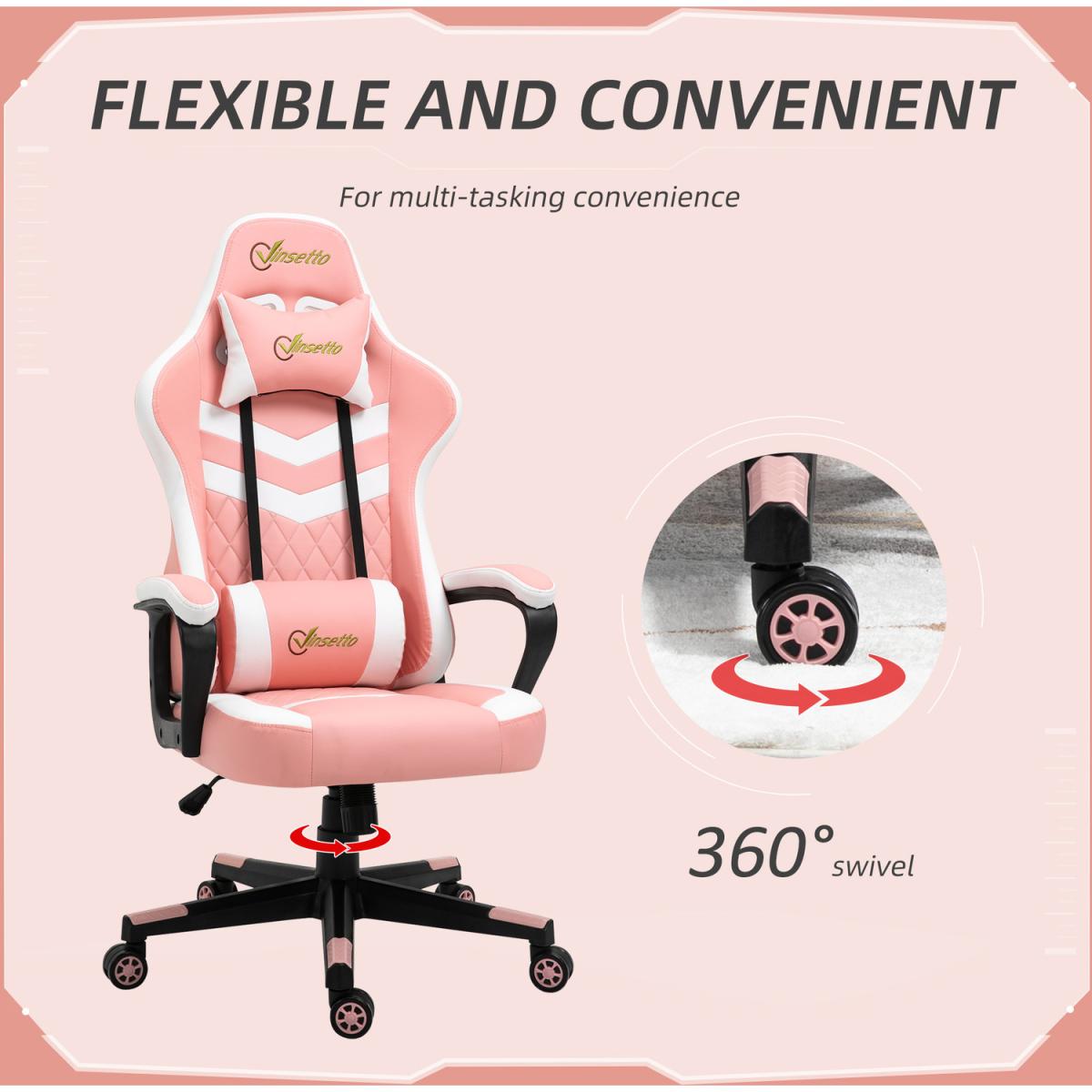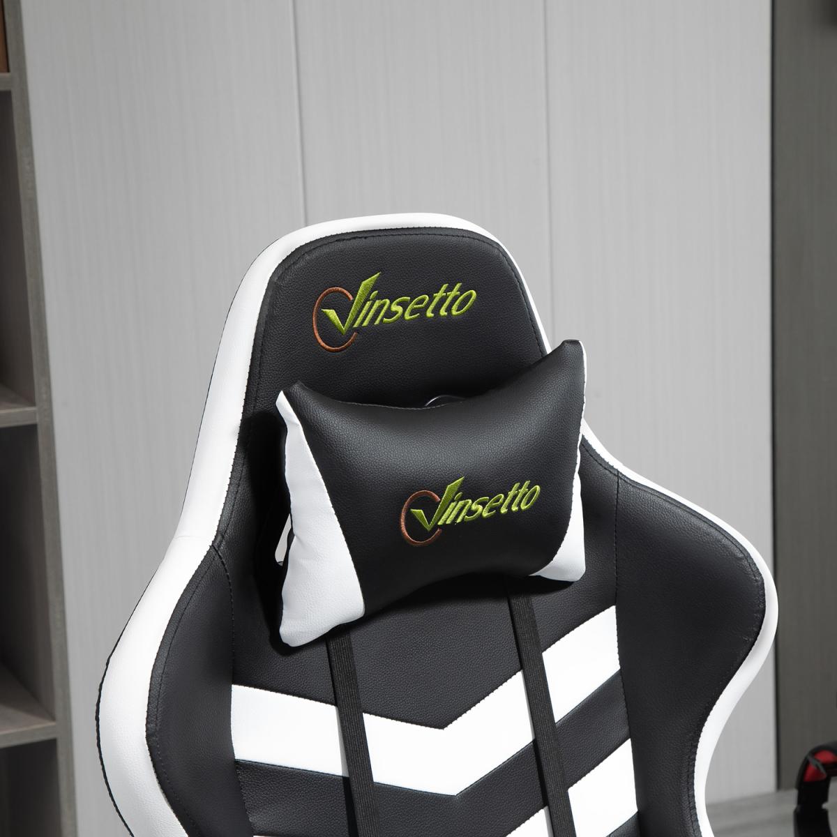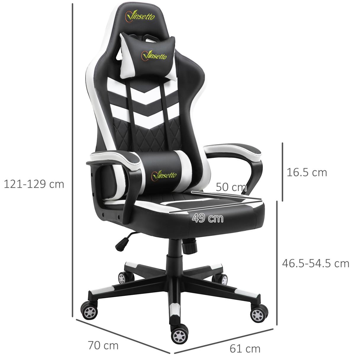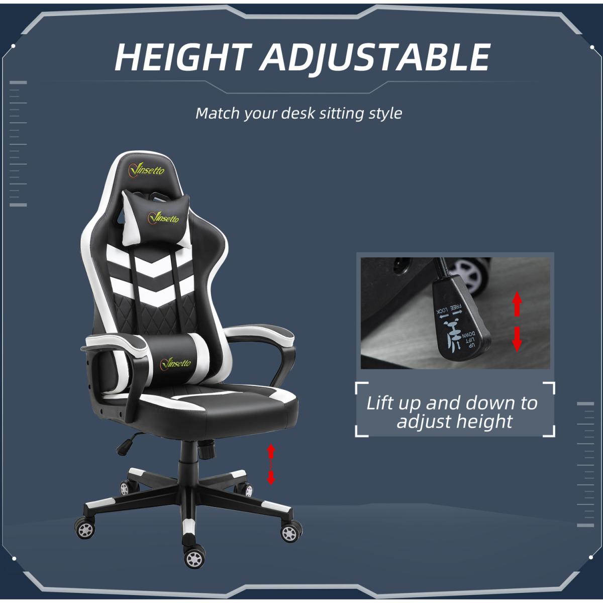 Be bold in your gaming comfort and style, thanks to this chair from Vinsetto. Its uber-cool design is formed of PU leather upholstery, in a block colour pattern design, with a wing-shaped back for extra impact. Ergonomic design is formed of a large swivel seat to move around easily, a high back and fixed armrests, with thick padding all over to keep you comfortable. Chair also rocks if you want to relax. Finished with five wheels and also comes with a lumbar and neck pillow, with our signature branding stitched in.