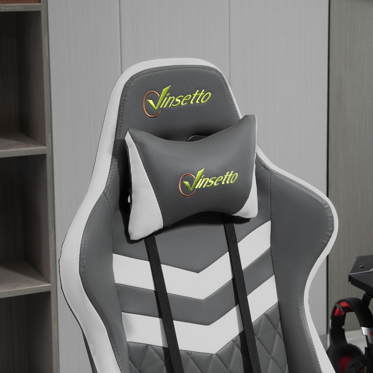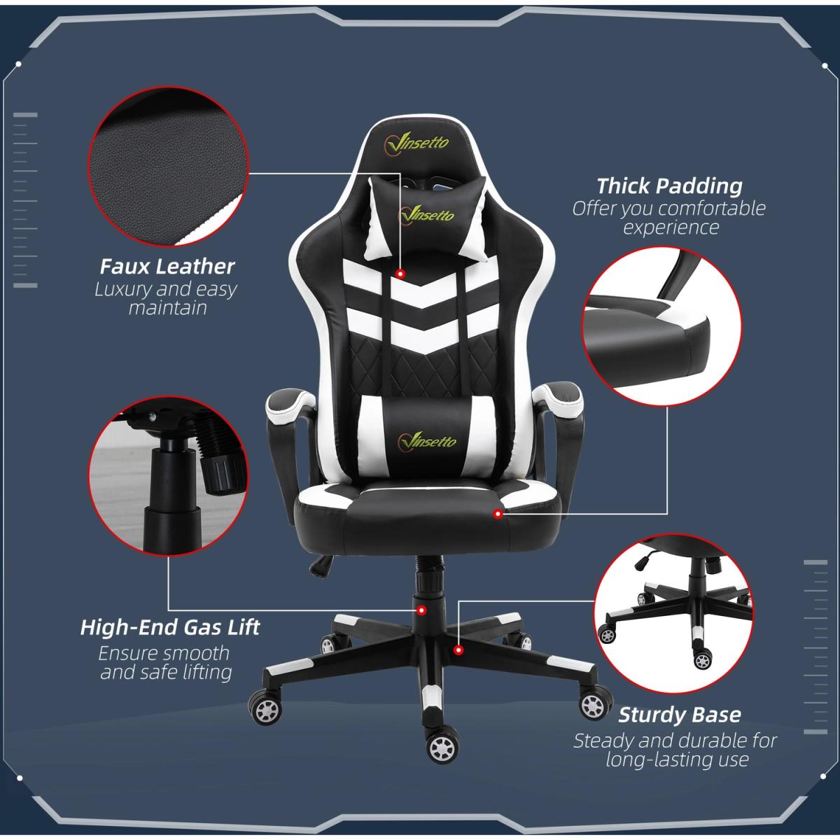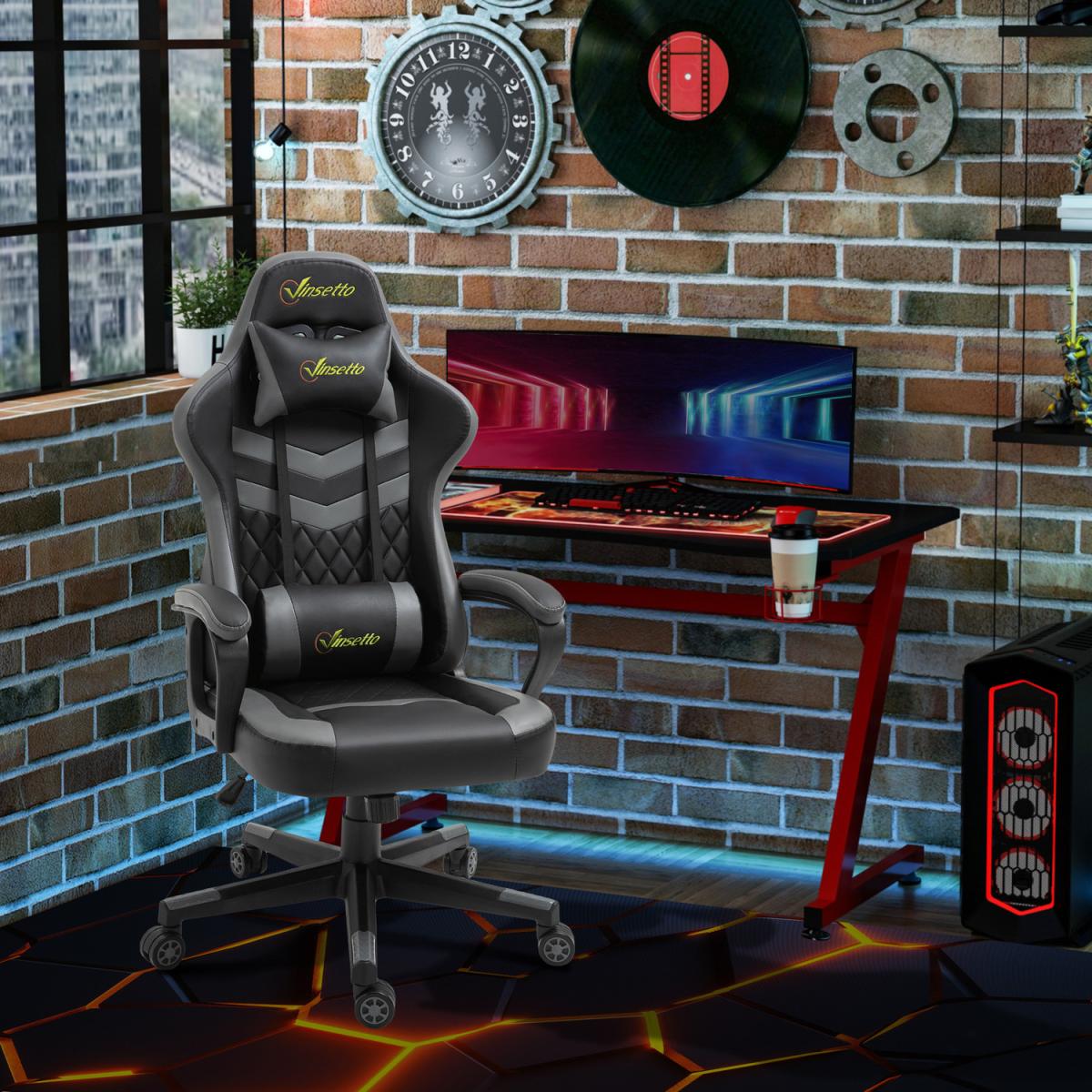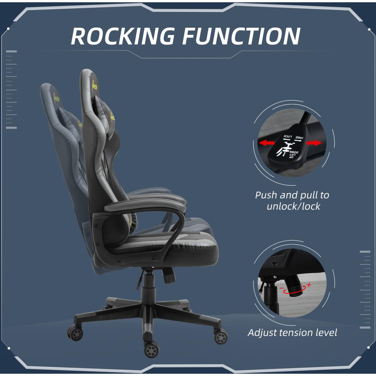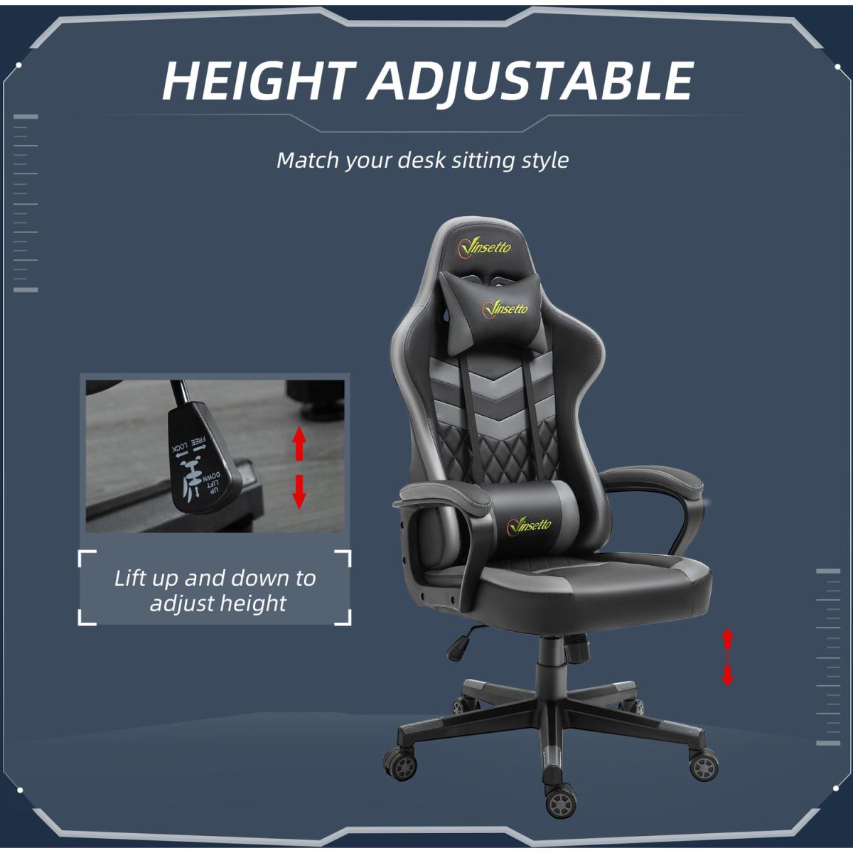 Be bold in your gaming comfort and style, thanks to this chair from Vinsetto. Its uber-cool design is formed of PU leather upholstery, in a block colour pattern design, with a wing-shaped back for extra impact. Ergonomic design is formed of a large swivel seat to move around easily, a high back and fixed armrests, with thick padding all over to keep you comfortable. Chair also rocks if you want to relax. Finished with five wheels and also comes with a lumbar and neck pillow, with our signature branding stitched in.