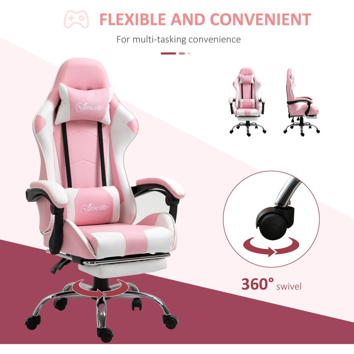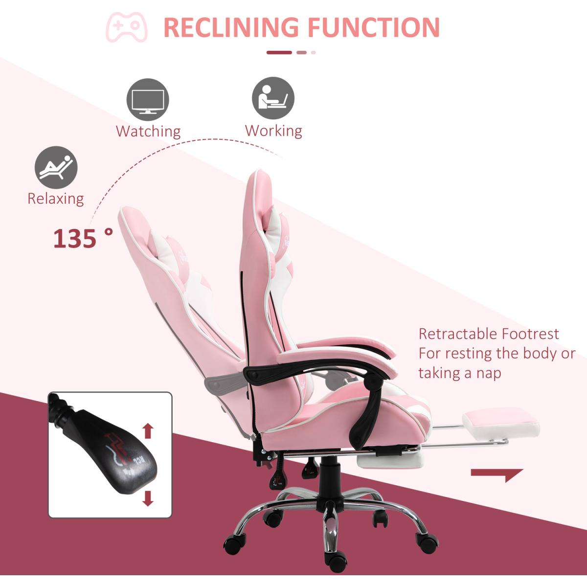 Thinking of pink for your games room? This cute gamer chair for adults and teenagers from Vinsetto is the answer. PVC leather upholstery in a pink and white colour design makes it different to look at, as well as smooth to sit on. This gaming computer chair comes with a lumbar back and top neck cushion for extra support. Height is adjustable so you can work at a level best for you. For ultimate relaxation points, it features a 135 reclining back, with a pull-out footrest.