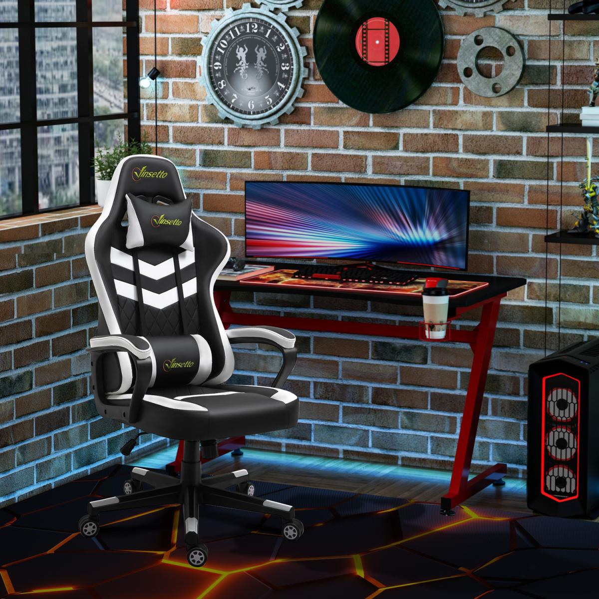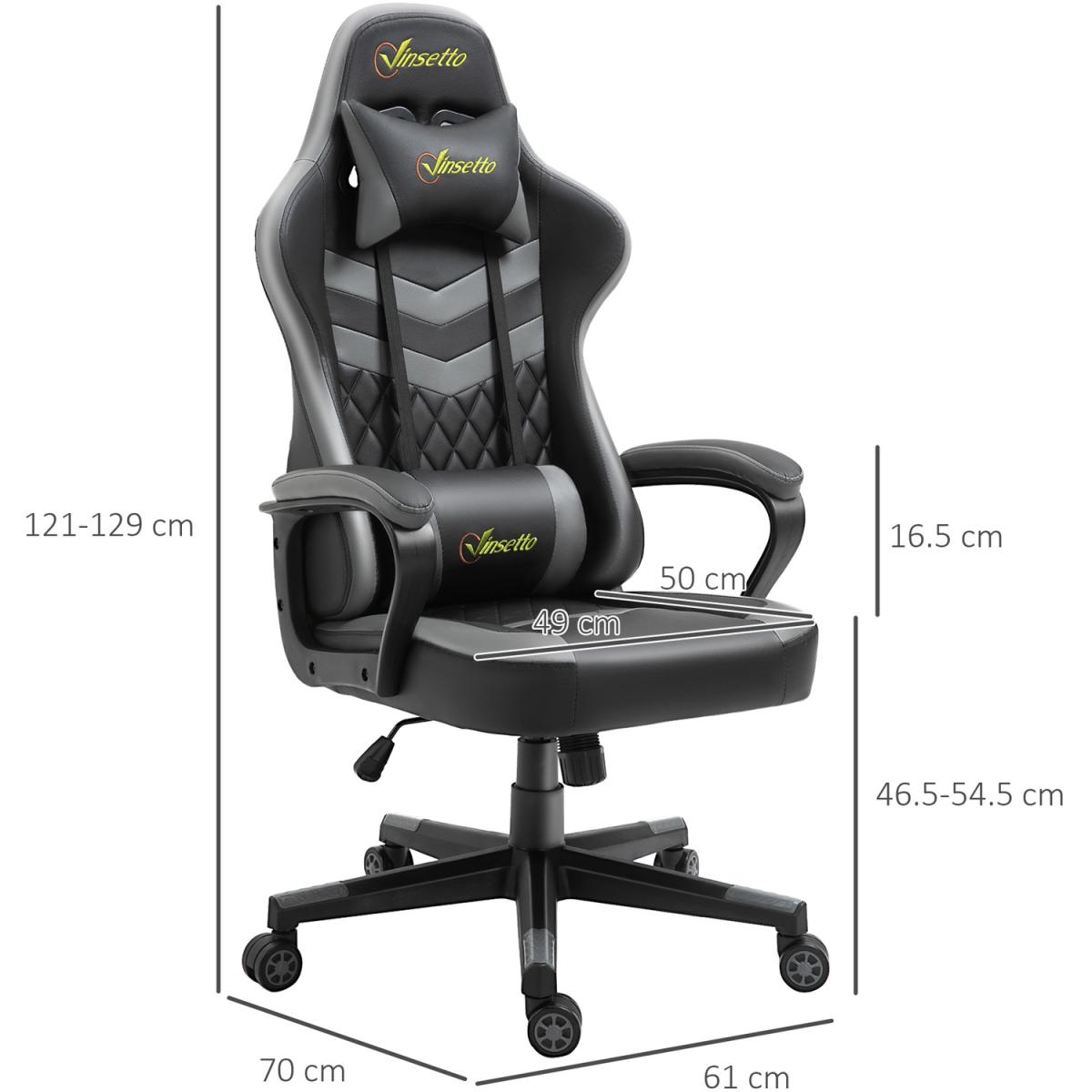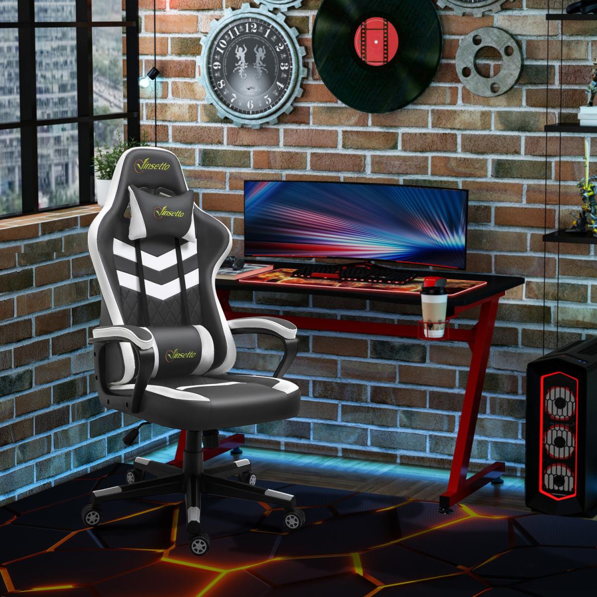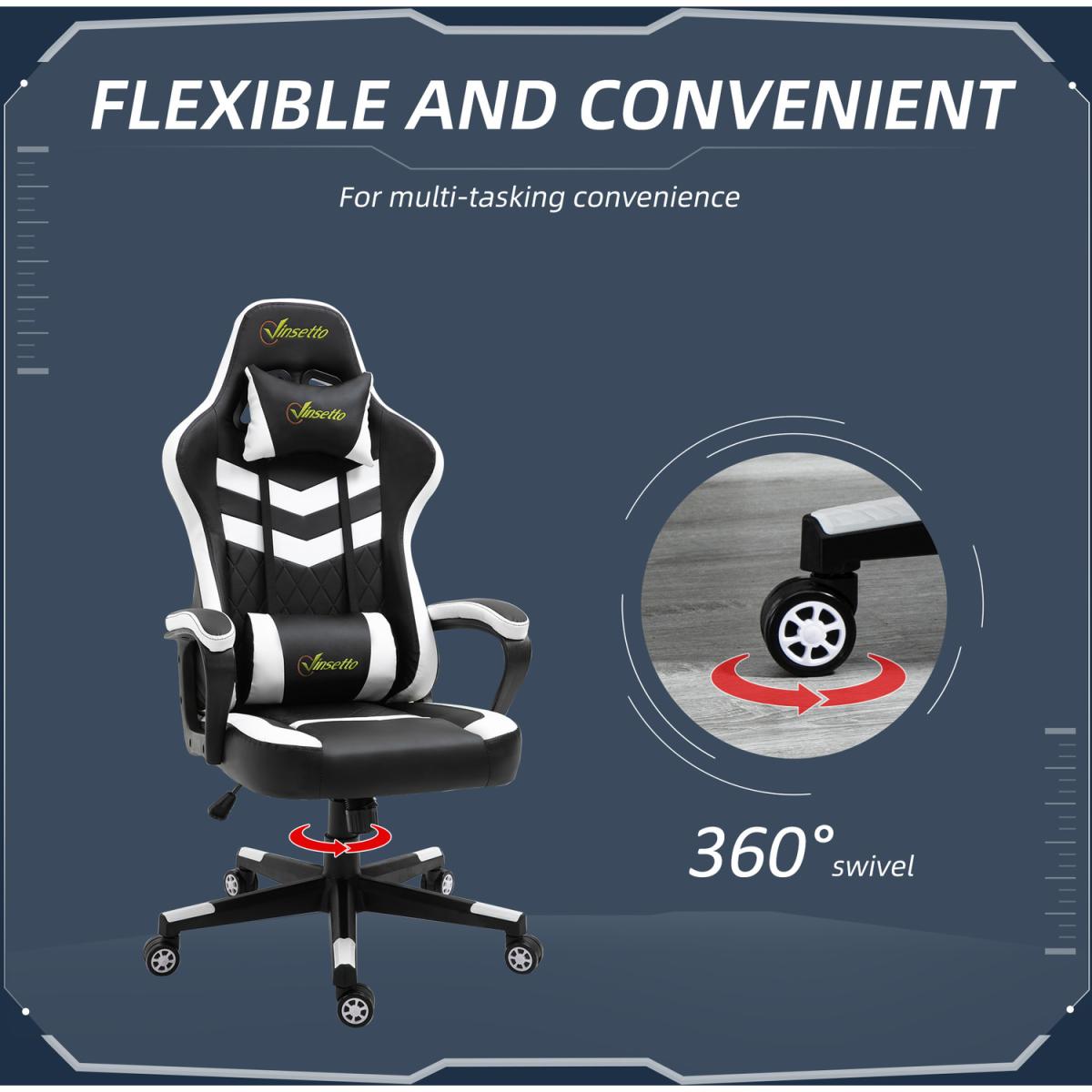 Be bold in your gaming comfort and style, thanks to this chair from Vinsetto. Its uber-cool design is formed of PU leather upholstery, in a block colour pattern design, with a wing-shaped back for extra impact. Ergonomic design is formed of a large swivel seat to move around easily, a high back and fixed armrests, with thick padding all over to keep you comfortable. Chair also rocks if you want to relax. Finished with five wheels and also comes with a lumbar and neck pillow, with our signature branding stitched in.