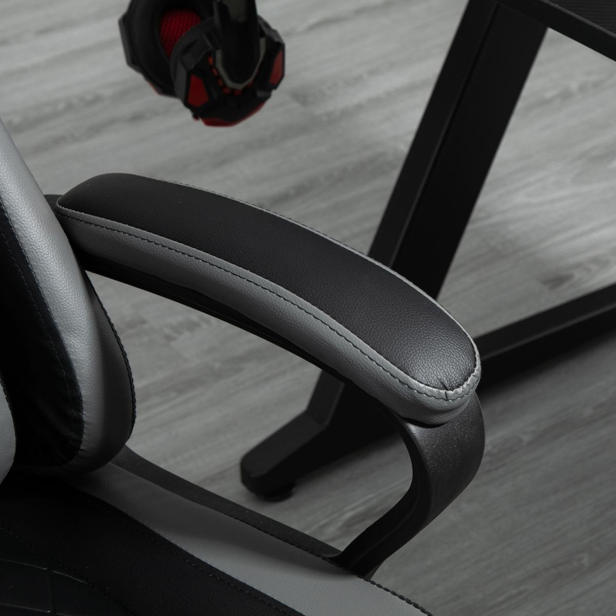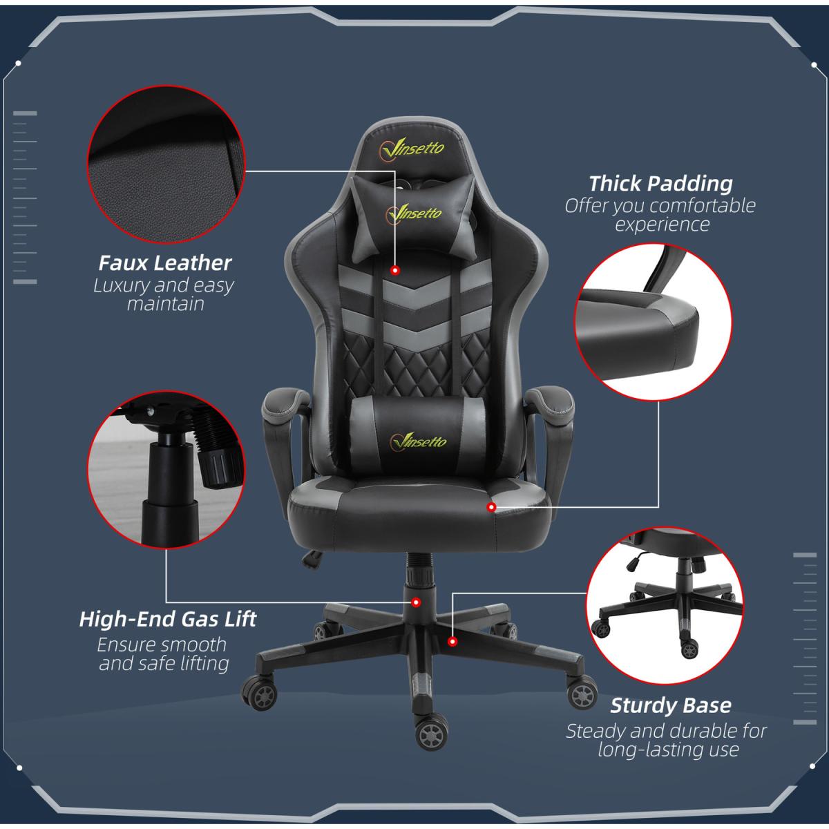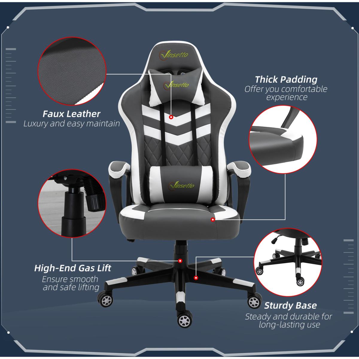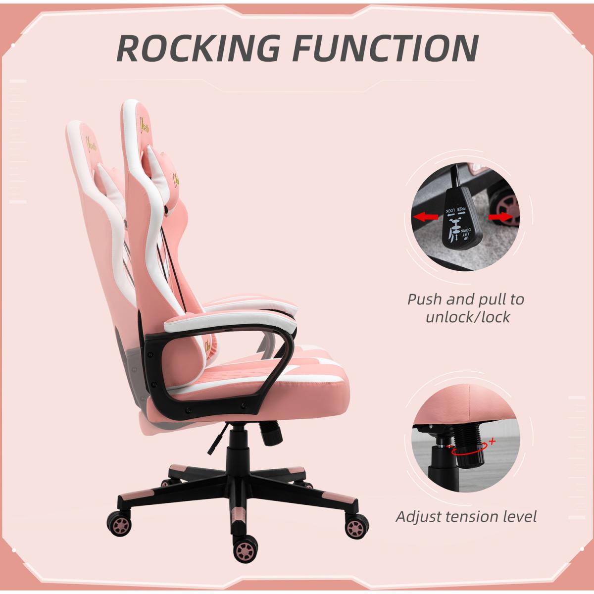Be bold in your gaming comfort and style, thanks to this chair from Vinsetto. Its uber-cool design is formed of PU leather upholstery, in a block colour pattern design, with a wing-shaped back for extra impact. Ergonomic design is formed of a large swivel seat to move around easily, a high back and fixed armrests, with thick padding all over to keep you comfortable. Chair also rocks if you want to relax. Finished with five wheels and also comes with a lumbar and neck pillow, with our signature branding stitched in.