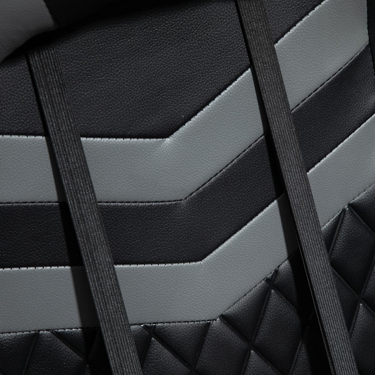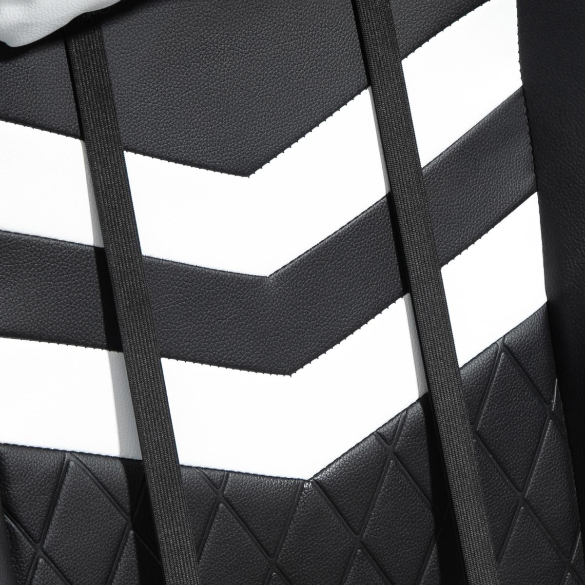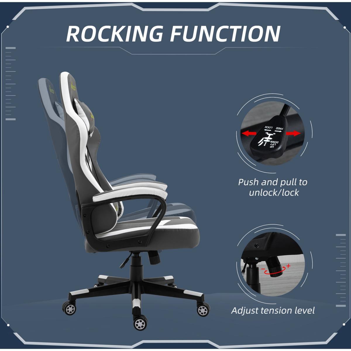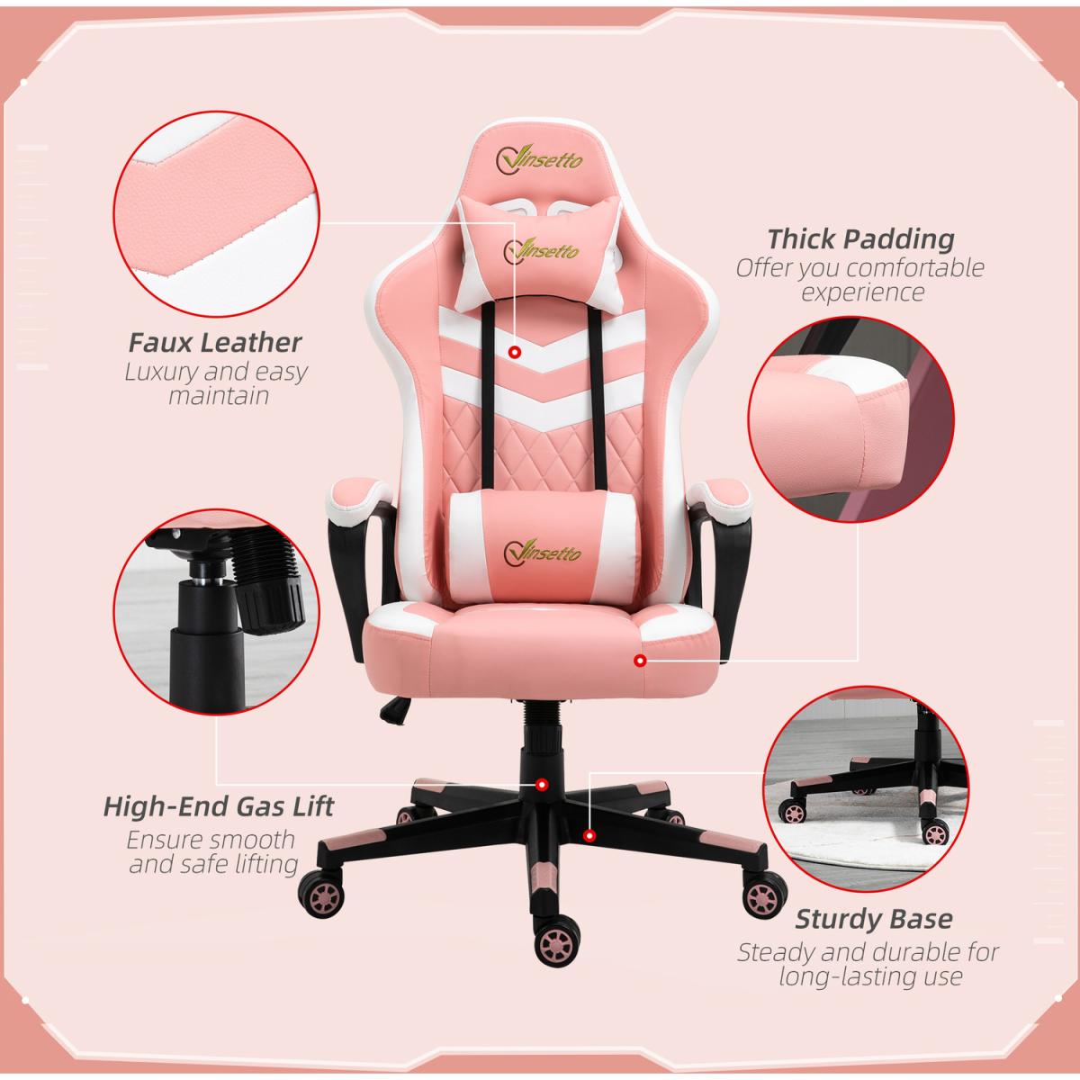 Be bold in your gaming comfort and style, thanks to this chair from Vinsetto. Its uber-cool design is formed of PU leather upholstery, in a block colour pattern design, with a wing-shaped back for extra impact. Ergonomic design is formed of a large swivel seat to move around easily, a high back and fixed armrests, with thick padding all over to keep you comfortable. Chair also rocks if you want to relax. Finished with five wheels and also comes with a lumbar and neck pillow, with our signature branding stitched in.