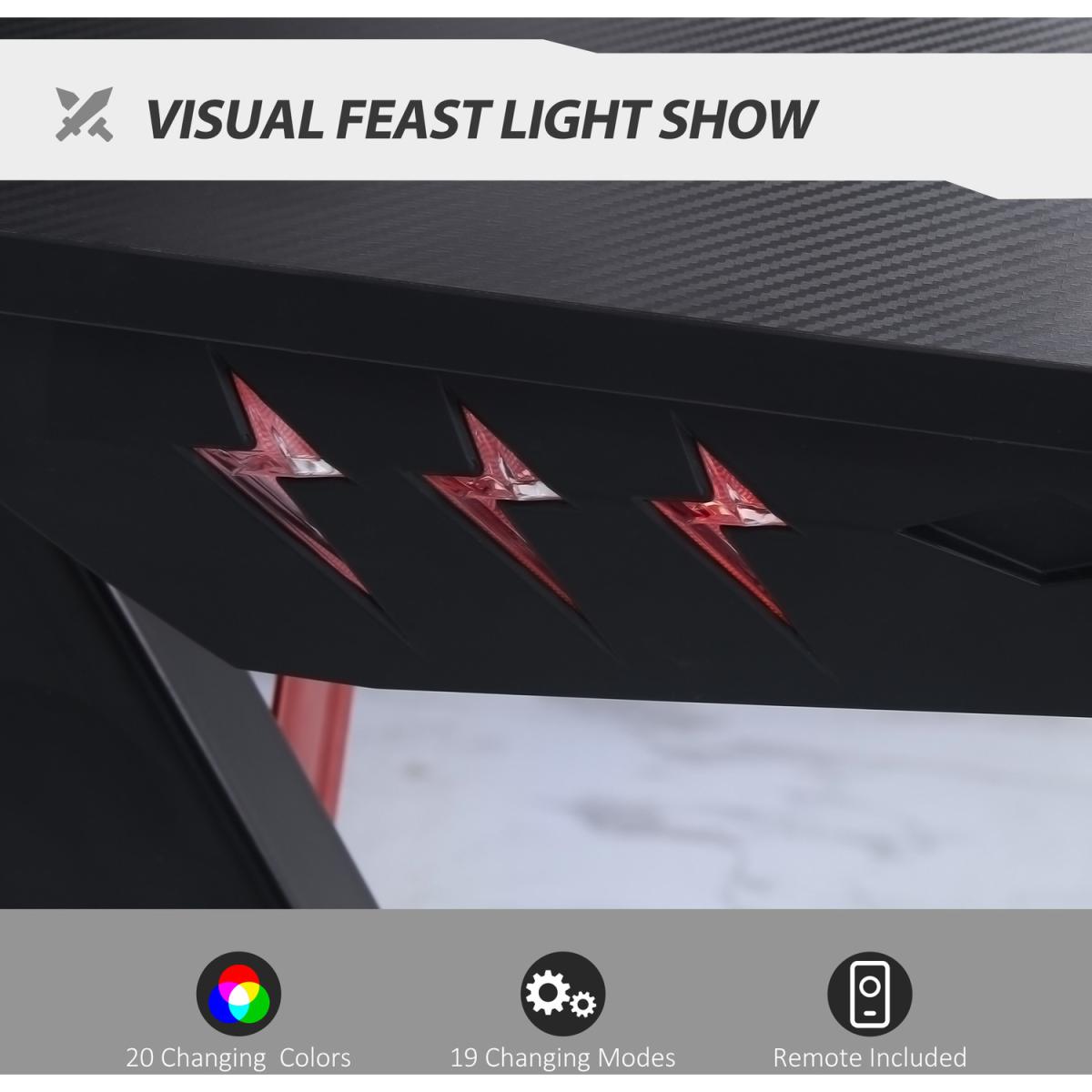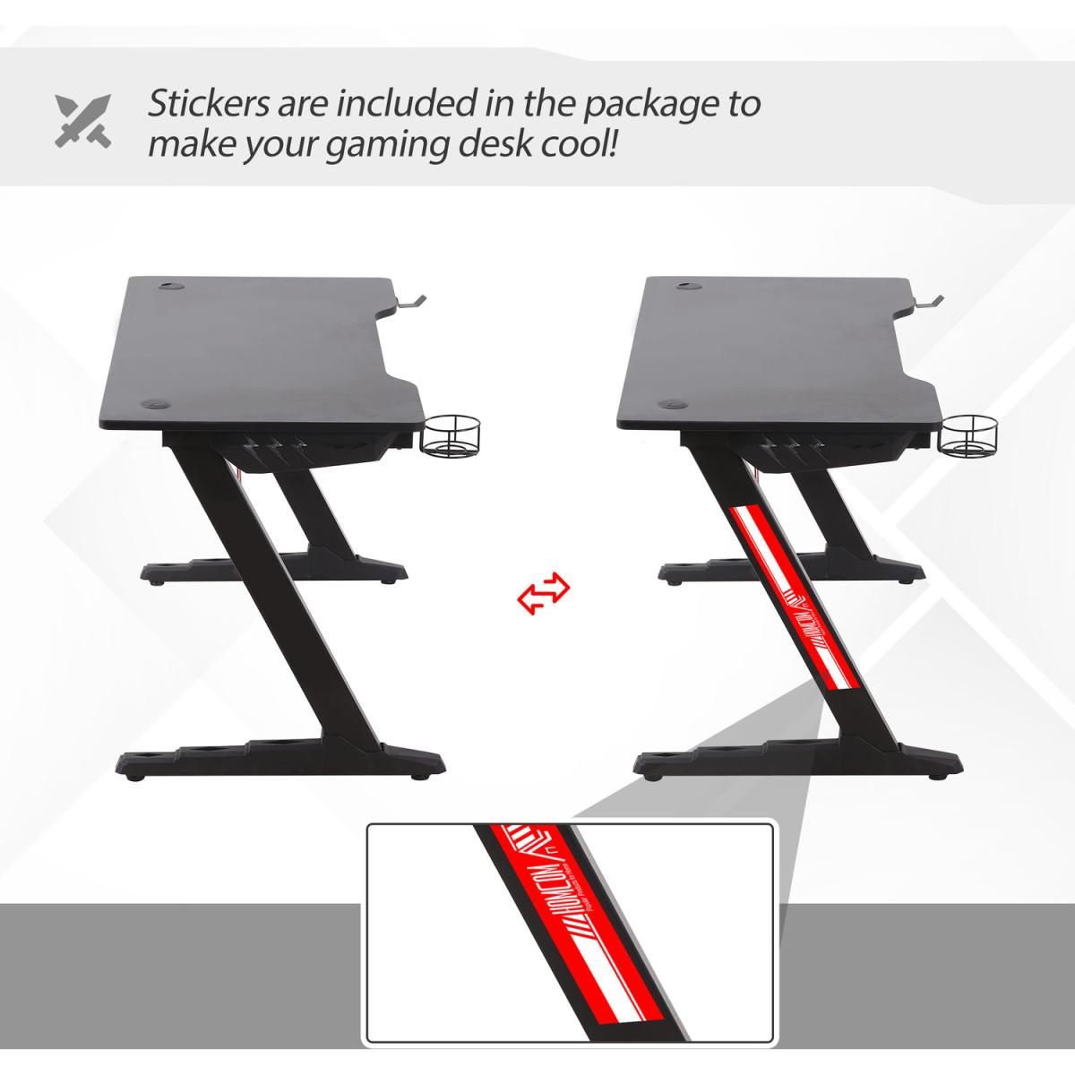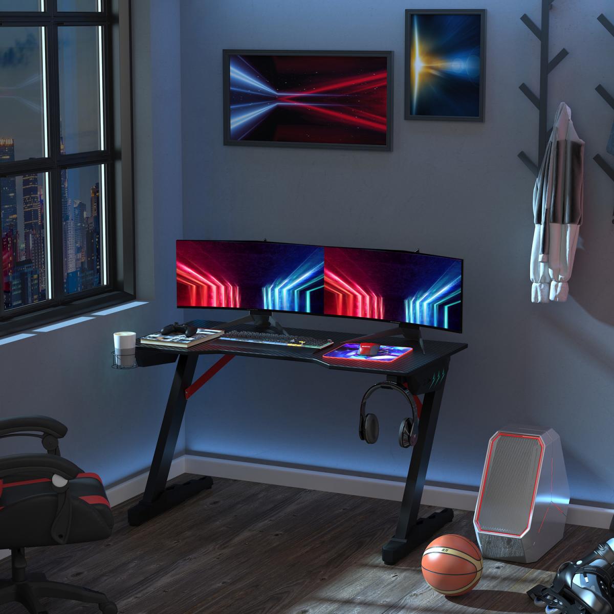 The HOMCOM racing style computer desk features a large desktop to place your electronic devices and with chic side LED strips, keeping you fully engaged in the game. It is designed with useful add-ons to hold your cup and headphone, 2 cable management holes to help organize the cable. Z-shaped design makes the simplest style look and space-saving feature. This gamer desk can seamlessly take you from a work station to a battle station.