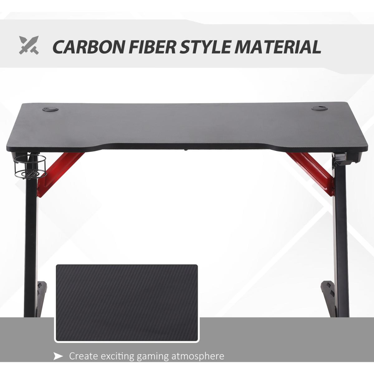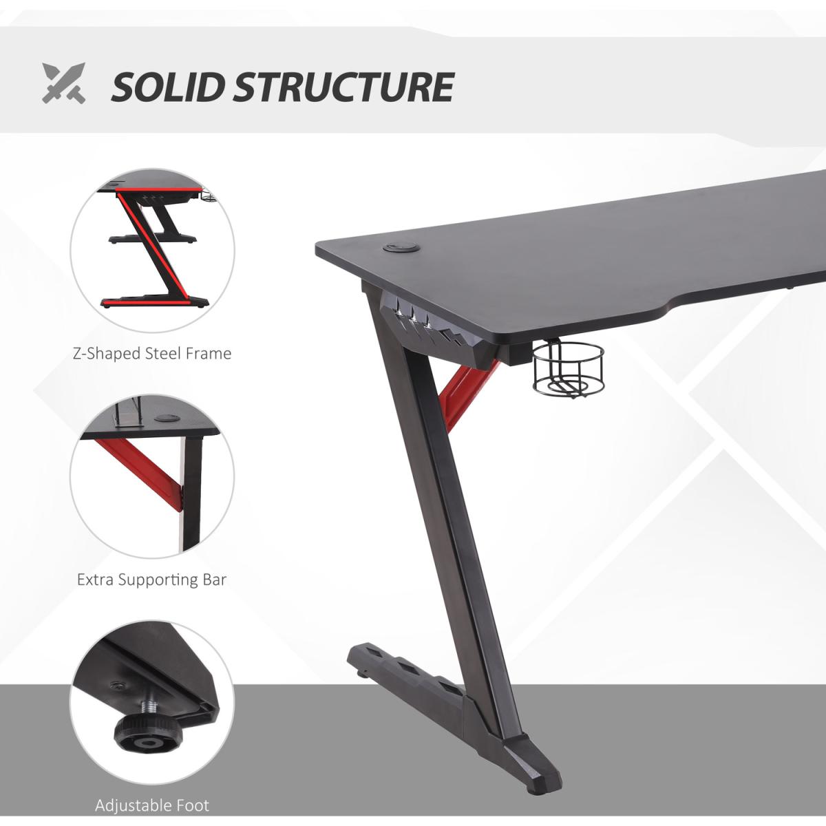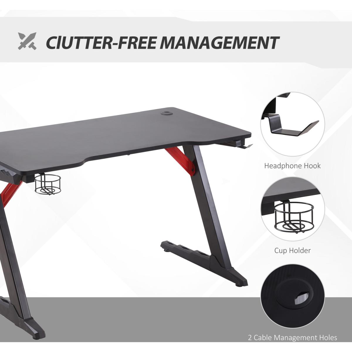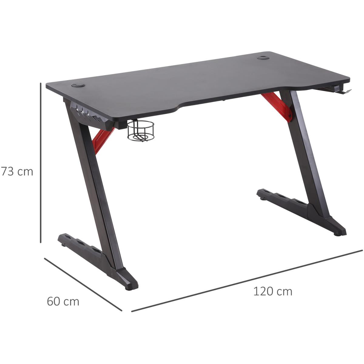 The HOMCOM racing style computer desk features a large desktop to place your electronic devices and with chic side LED strips, keeping you fully engaged in the game. It is designed with useful add-ons to hold your cup and headphone, 2 cable management holes to help organize the cable. Z-shaped design makes the simplest style look and space-saving feature. This gamer desk can seamlessly take you from a work station to a battle station.