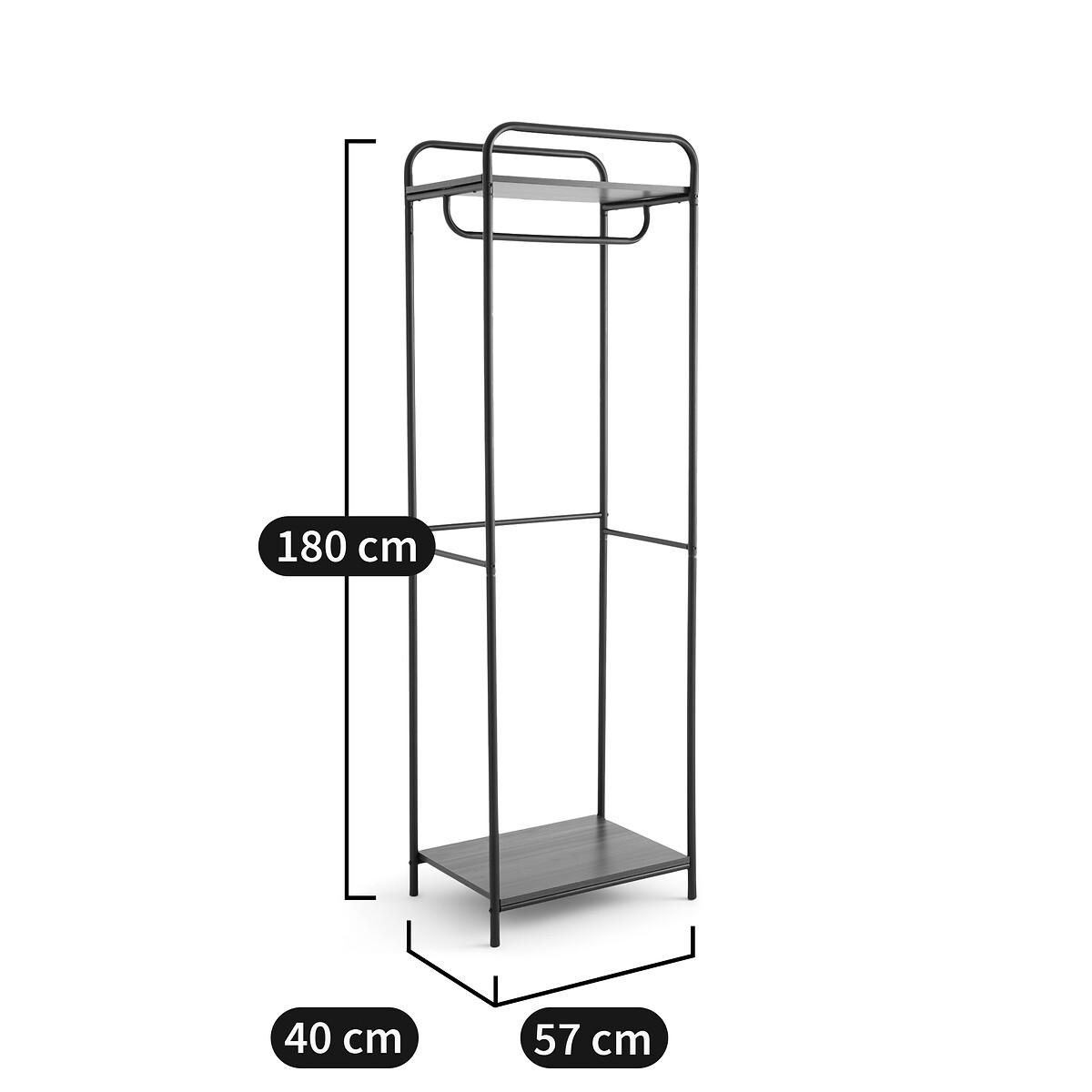 Optimise your space. With its rack and 2 shelves, Rackel is THE ingenious storage solution for an organised interior. Product Details • Black tinted iron structure with epoxy finish • 2 shelves in MDF and melamine • 1 hanging rail. Dimensions • Width: 57cm • Height: 180cm • Depth: 40cm • Height between the 2 shelves: 155cm • Weight: 9.5kg Parcel dimensions and weight:1 parcel • L96 x H12.5 x D45.5cm. 11kg.