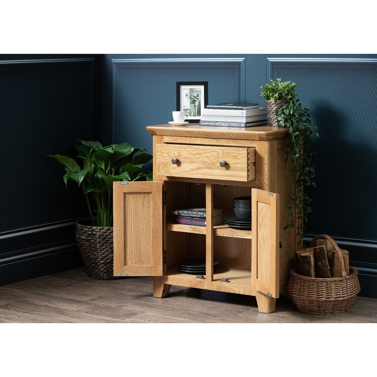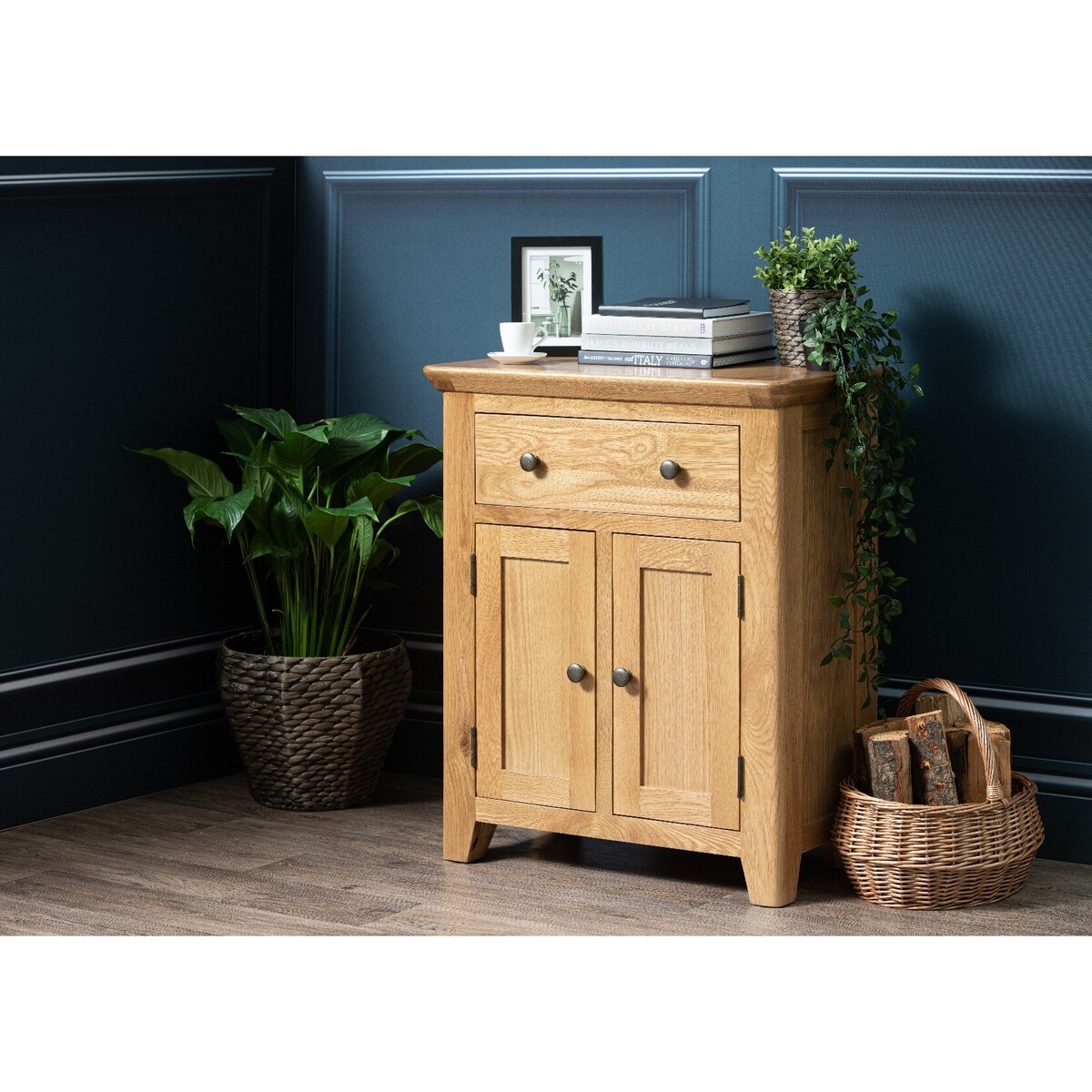 The Radcliffe 2 Door Sideboard is stylish, compact and practical. Featuring a solid oak frame and top, the small sideboard features a handy upper drawer and 2 door cupboard with an inbuilt shelf. Stylish and practical sideboard. Rustic design with a modern twist. Solid oak frame and top for maximum durability and a stunning look. Natural finish flatters any interior. Dovetailed drawer and fully finished back. Brass effect knobs complete the look. Fully assembled.