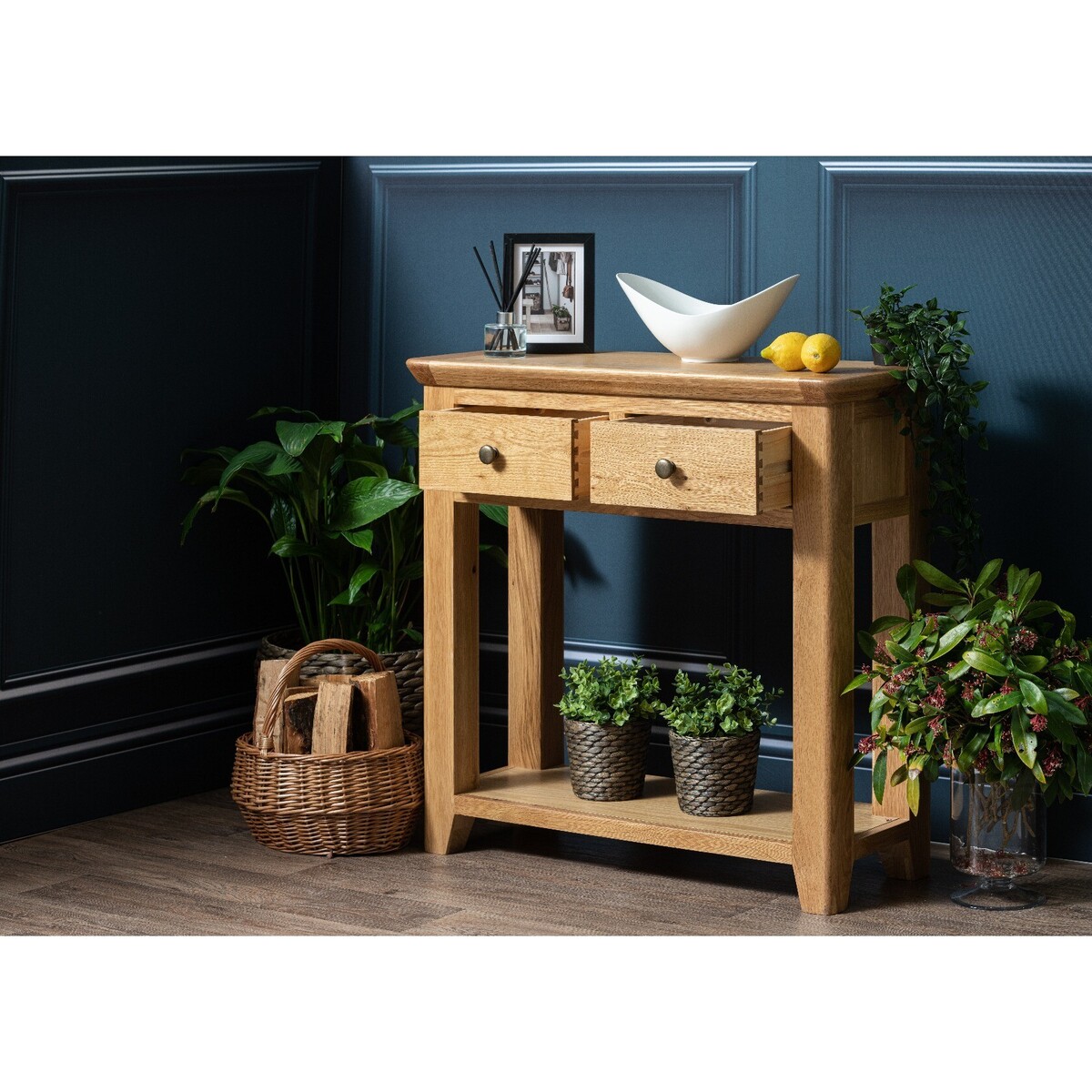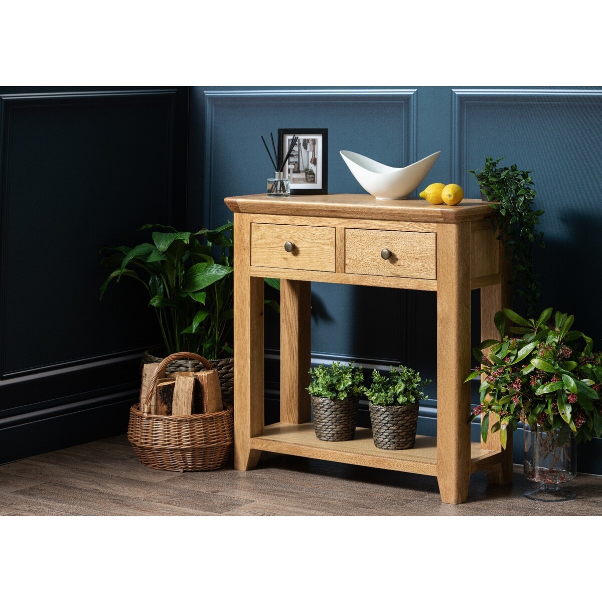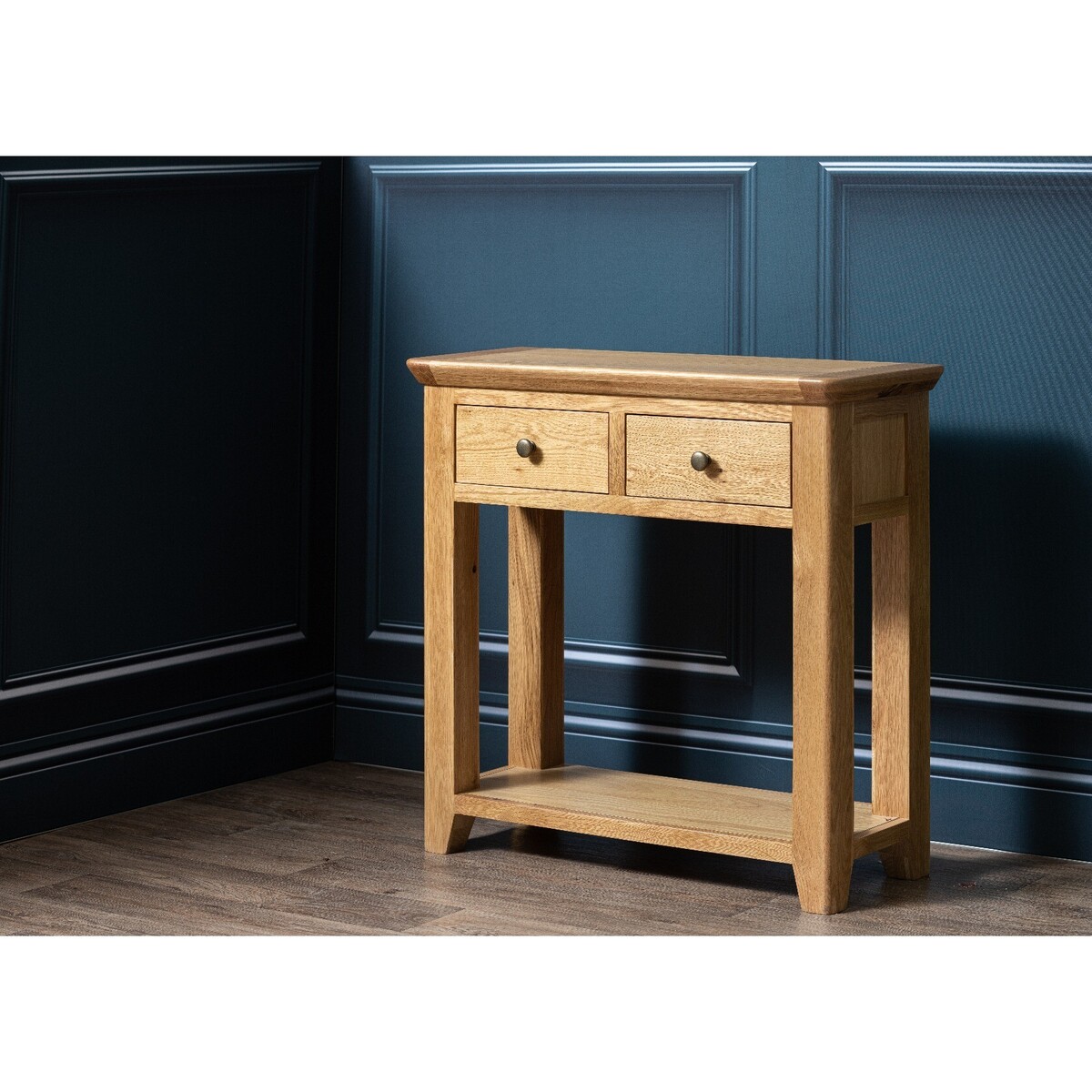 The Radcliffe Large 2 Drawer Console Table offers up classic country style with a modern twist. Crafted from naturally durable solid oak with a medium finish, the stylish large console table features 2 upper drawers with brass effect knobs. Large Console Table in classic oak suits any interior Durable 100% solid oak top and frame Natural finish highlights the wood grain Curved design with rounded corners adds a modern touch Upper drawers offer handy storage Dovetailed drawers and fully finished back Crafted using mortise and tenon joints for maximum durability Brass effect knobs finish the style Complete the look with matching items from the Radcliffe range