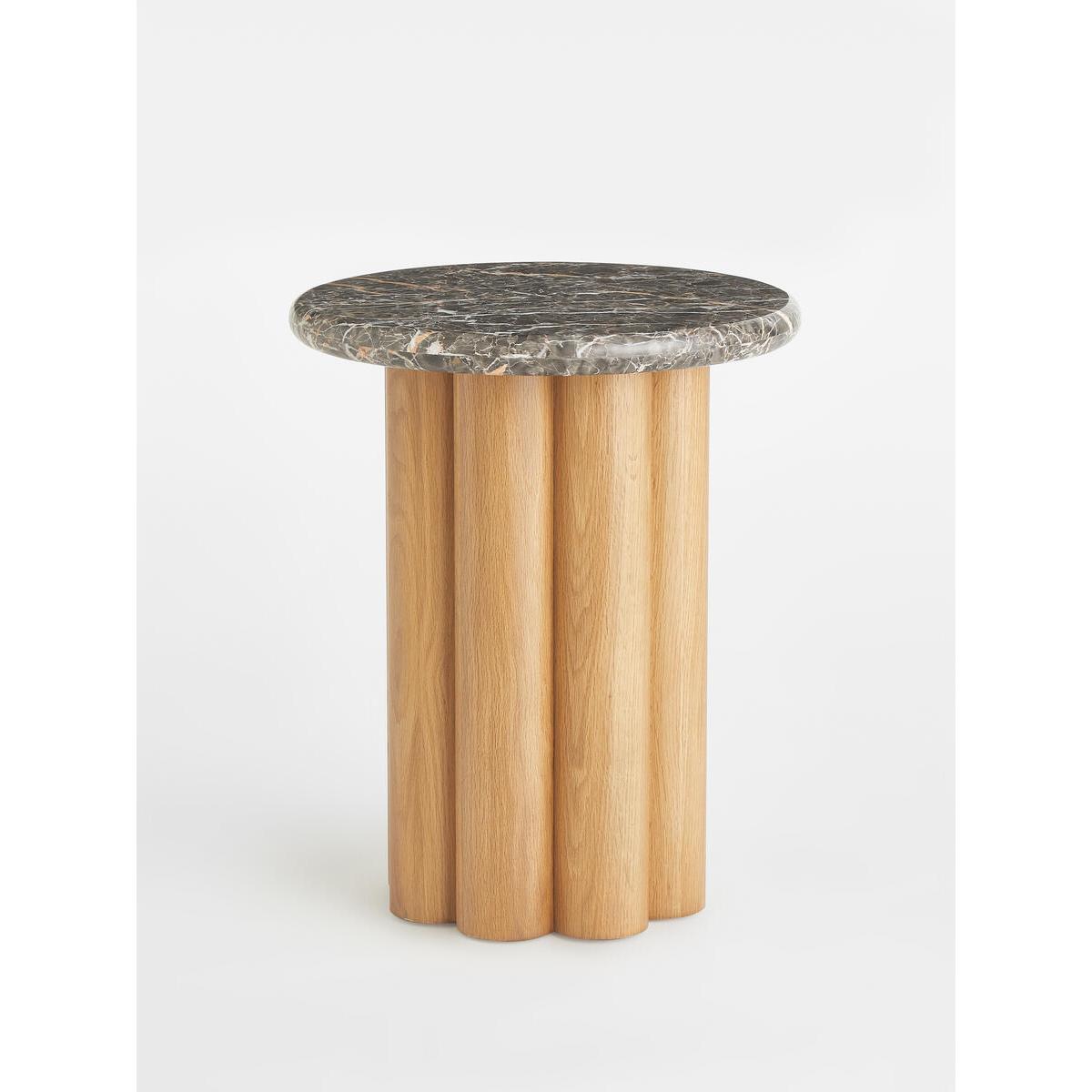 The Radcott side table mirrors the seating styles seen in 180. House. Formed into a sturdy barrel shape with scalloped edges, theside table is crafted from natural oak. It's contrasted by aheavily veined marble top with a smooth bullnose edge. Place it byyour sofa to display books, candles, and coasters. Solid oak side table. Scalloped edges. Barrel shape. Turkish marble top. Smooth bullnose edge. Inspired by 180 House.