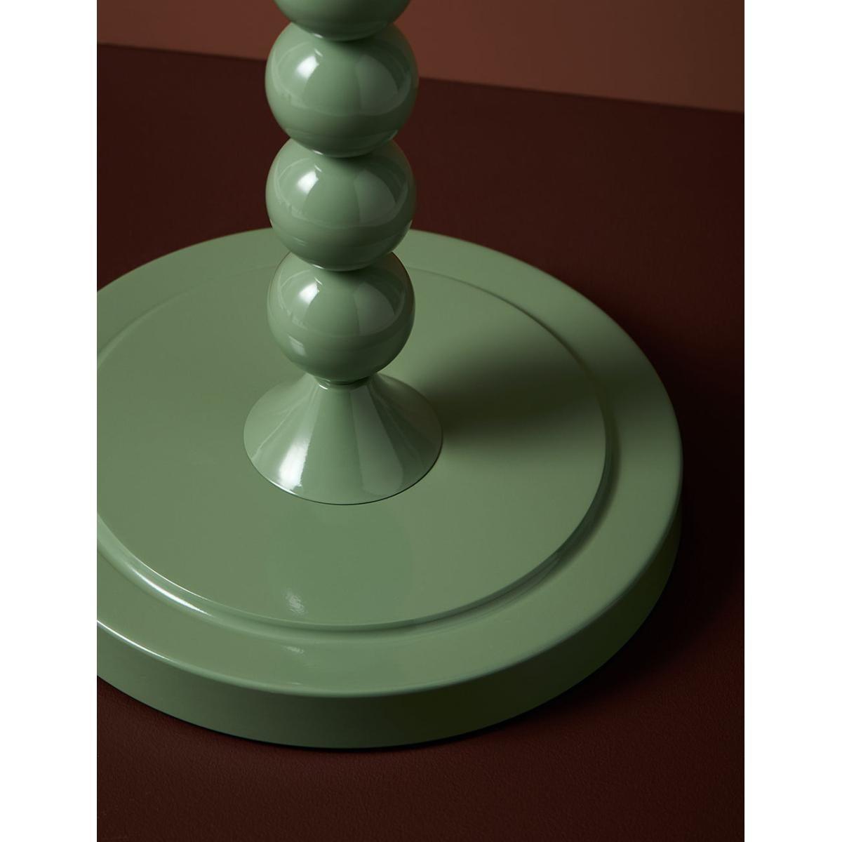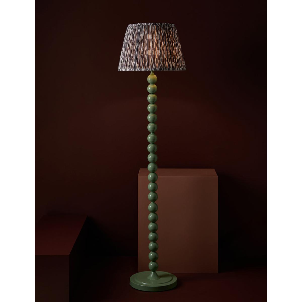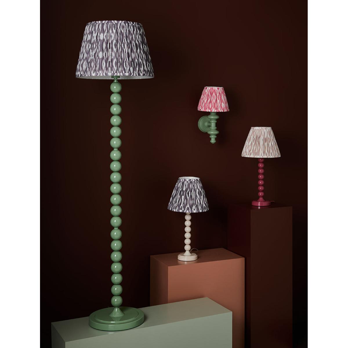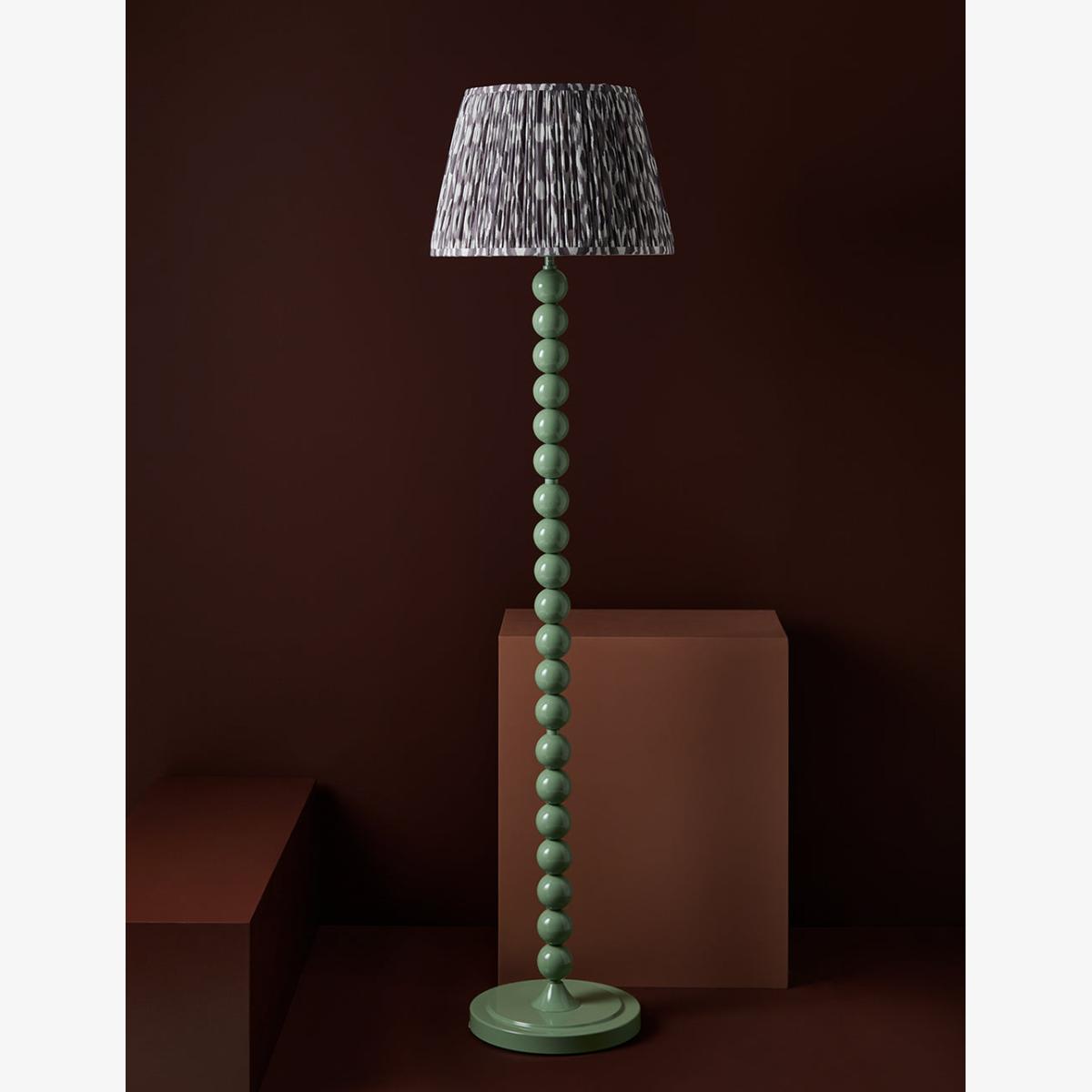 A painted metal bobbin lamp in a Moss Green. It's coordinating cable and glossy finish makes this a really charming piece. Lovely with a matching OR contrast shade and will bring a cosy overhead glow wherever you position it. This piece will arrive in 3 sections, simply screw them together and let there be light. Also available in Cherry and Chalky White. Styled here with our Large Ida Ikat Print Shade in Pearl Grey. A painted metal bobbin floor lamp in Moss Green.