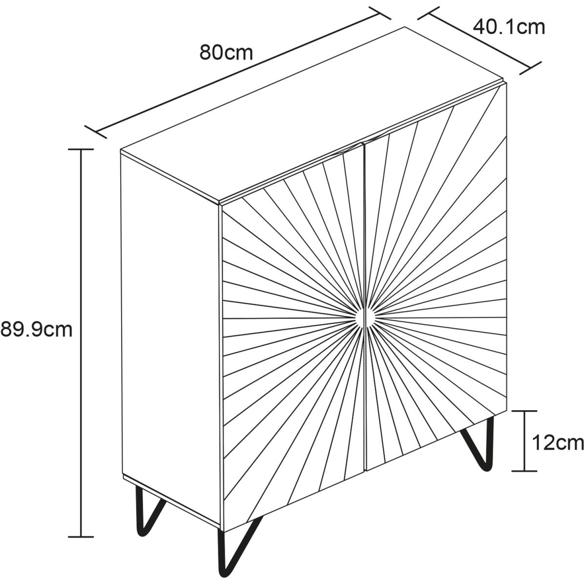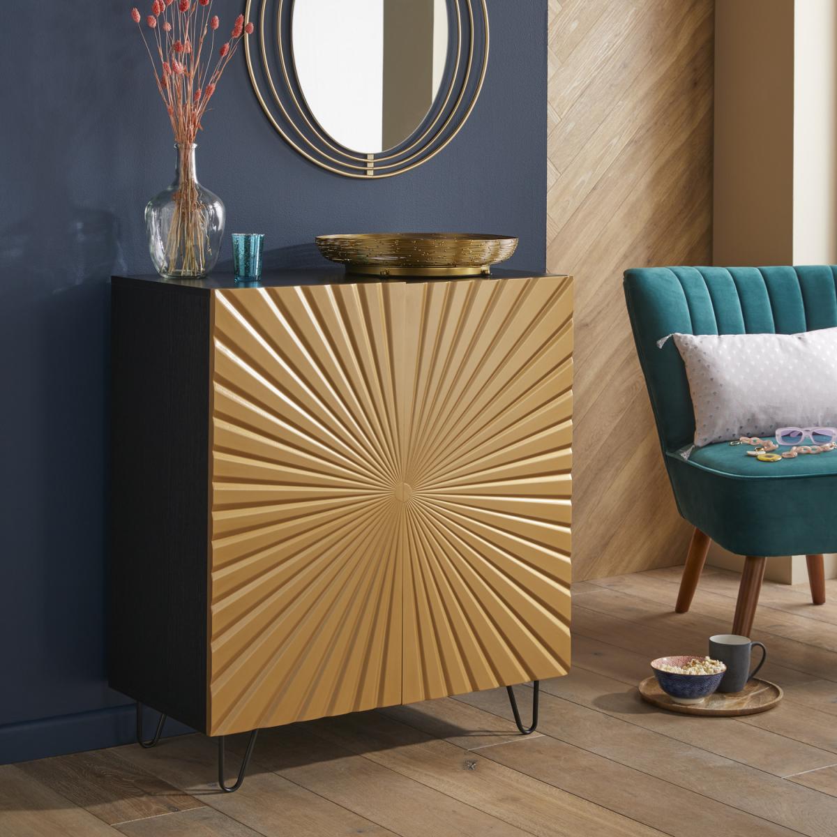 Inspired by on-trend vintage furniture, the black and gold collection features a radial sunbeam design to the front with metal u-shaped legs. This large cabinet has two sturdy doors to the front that opens to a set of internal storage compartments allowing you to store your belongings with ease in an organised fashion. Pair yours with the matching items in the range to create a stylish yet casual environment for any room.