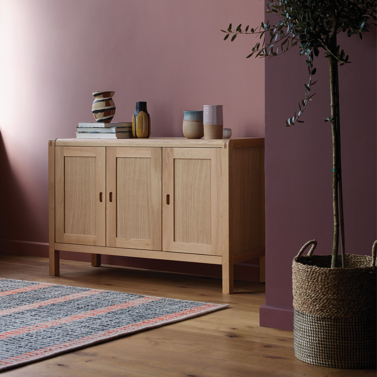 I love this sideboard’s clean lines and natural oak finish, making it a versatile piece that works well in both modern and traditional interiors. Its recessed handles give it a streamlined look, perfect for contemporary spaces, while the warm oak tone easily complements neutral palettes or adds warmth to more colourful schemes. Styling tips include using it to display minimal decorative items such as vases or books to keep the look uncluttered. It’s also practical for storage in dining rooms or living areas, providing a neat solution for tableware, linens, or media accessories. Pairing it with pairing with soft textiles or metallic accents can elevate its understated elegance and create a well-balanced, functional space.
