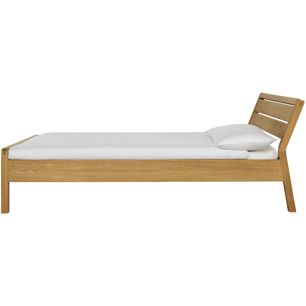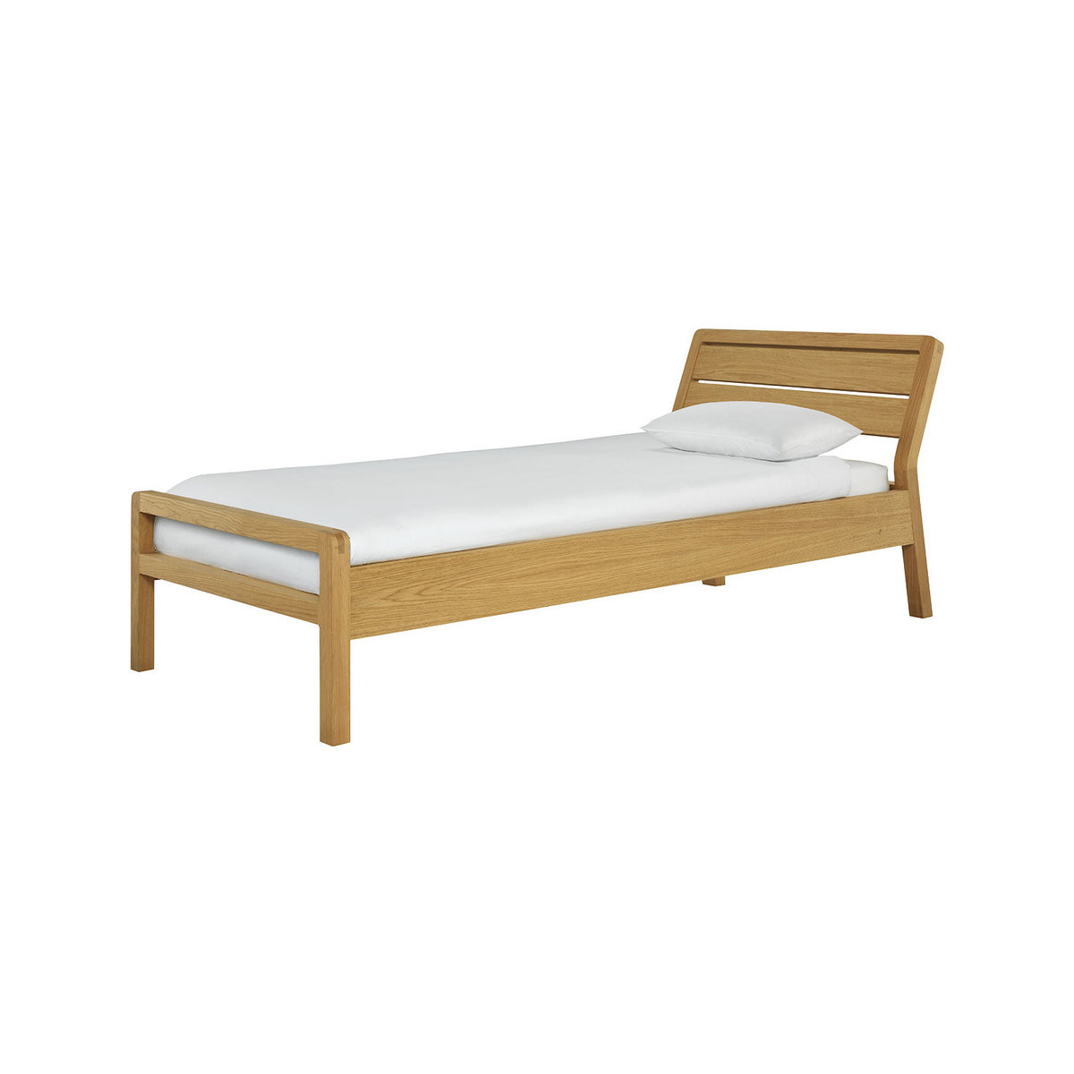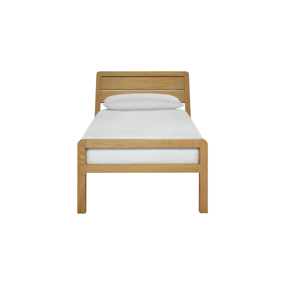 This understated and timeless Radius oak 90cm single bed frame is beautifully crafted from lacquered solid oak and oak veneer and features rounded corners, joined in traditional methods. The bridle joint construction is a carpenter's joint that allows for a corner connection that is very strong in all directions and needs no additional bracing. The Radius bed will fit a standard UK 90cm single mattress, shop our mattress collection to find a mattress that suits the way you sleep. The Radius bed comes with beech sprung slats which flex with movement to support your weight and provide a more comfortable sleeping experience as well as helping to extend the life of your mattress.