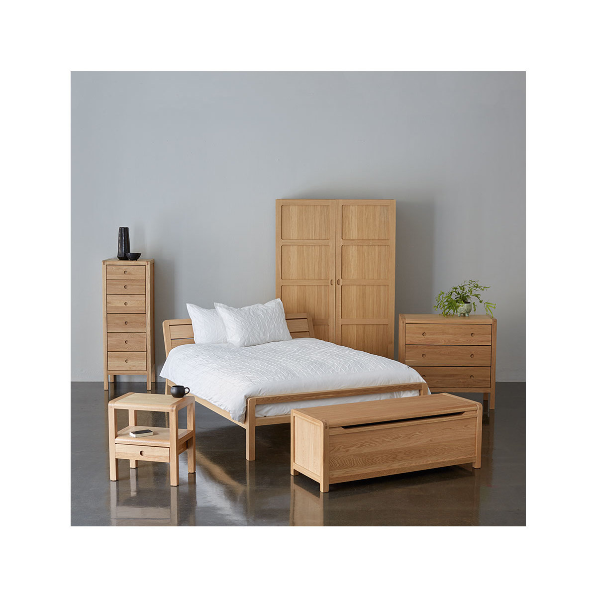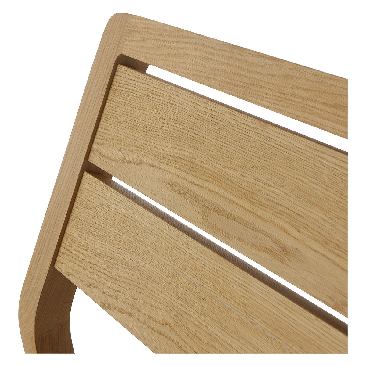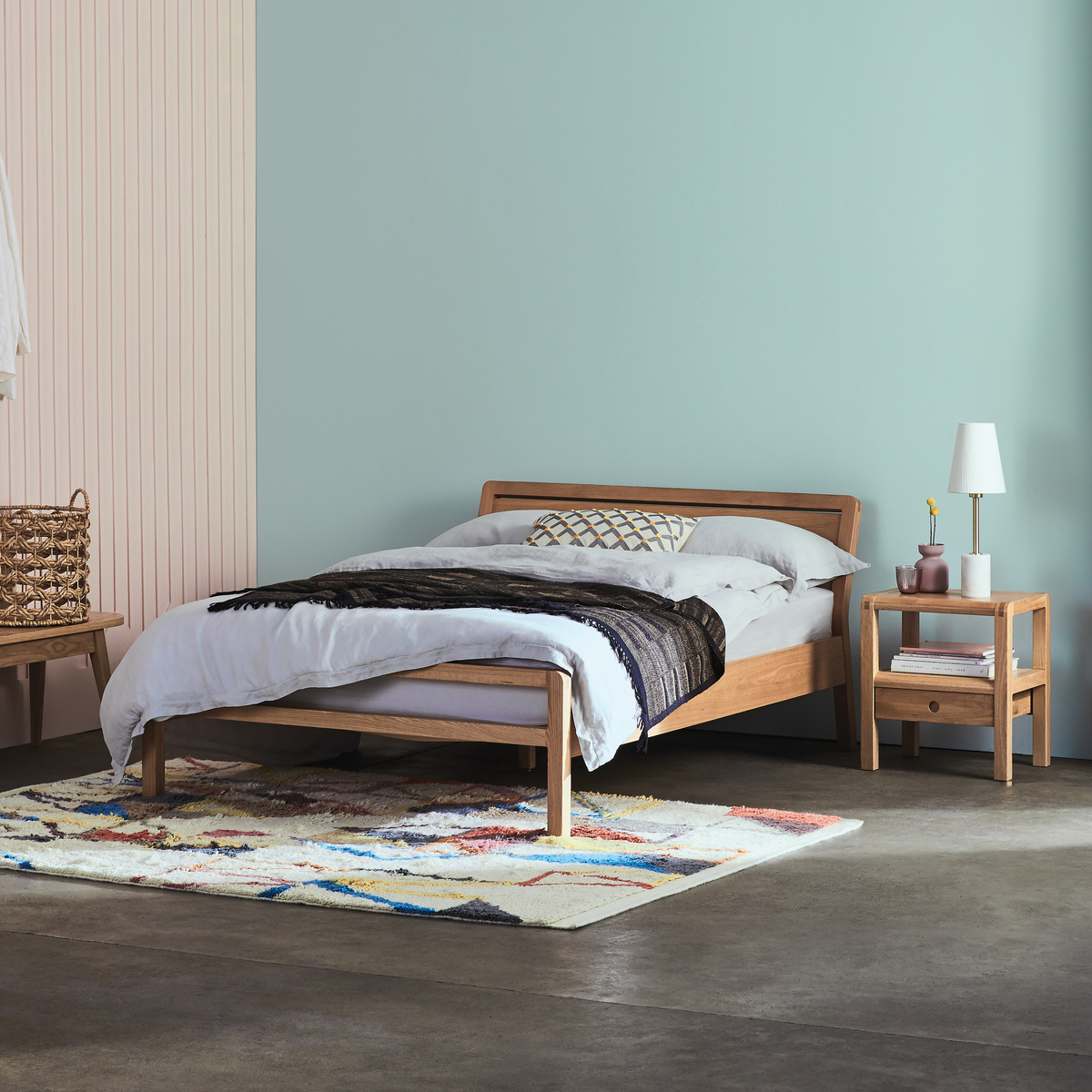 This understated and timeless Radius oak 90cm single bed frame is beautifully crafted from lacquered solid oak and oak veneer and features rounded corners, joined in traditional methods. The bridle joint construction is a carpenter's joint that allows for a corner connection that is very strong in all directions and needs no additional bracing. The Radius bed will fit a standard UK 90cm single mattress, shop our mattress collection to find a mattress that suits the way you sleep. The Radius bed comes with beech sprung slats which flex with movement to support your weight and provide a more comfortable sleeping experience as well as helping to extend the life of your mattress.