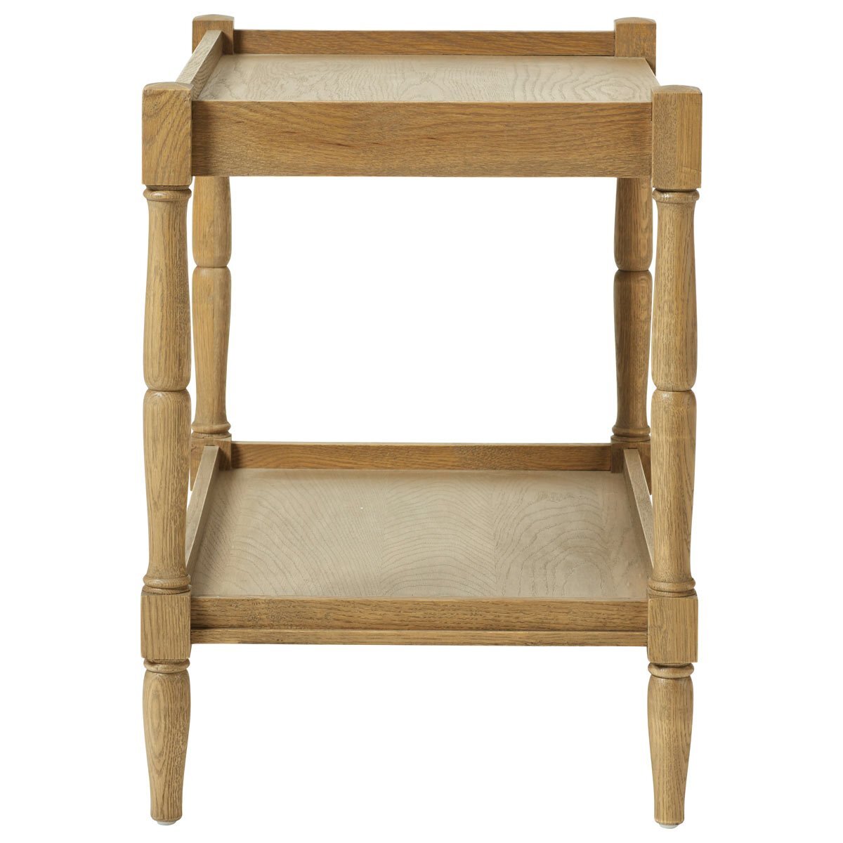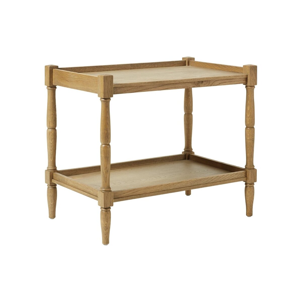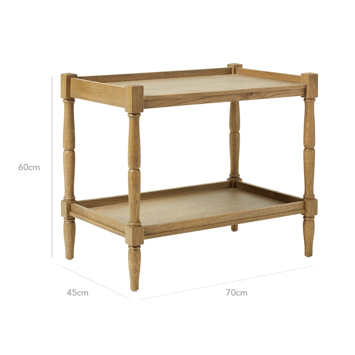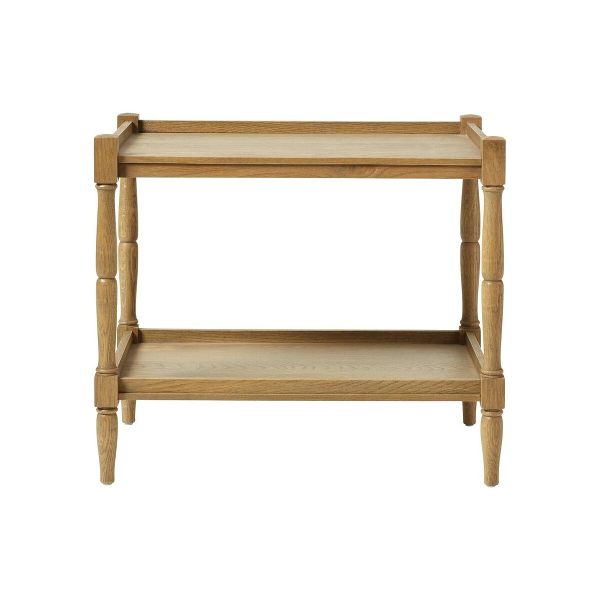 Crafted from handsome "weathered" oak, with neat turned legs and two useful lipped surfaces, this large wooden side table is the perfect size to sit beside a sofa. Two shelves – with a neat lipped edge – provide ample room for a lamp, books and anything else that needs to be kept close to hand. The soft grain of the wood blends with any colour scheme, while the style is a great fit for a traditional sitting room.