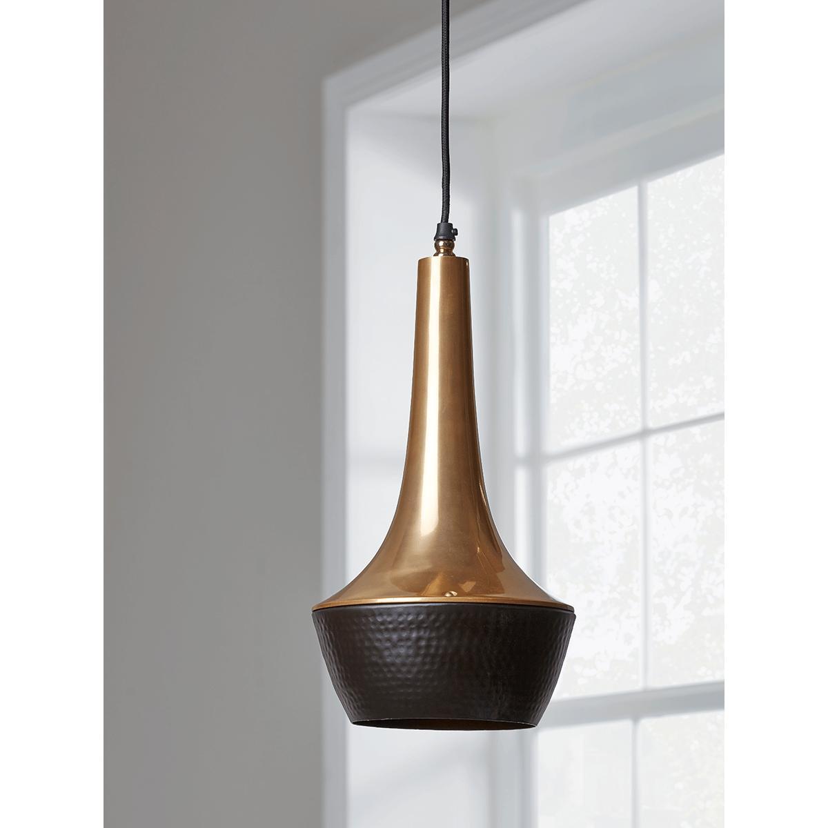 Make a bold statement with our impressive brushed brass and black pendant, with matching ceiling rose. Our industrial style pendant has been carefully crafted from aluminium and steel with a dimpled finish, and will add real character and style to your home. The metallic burnished gold finish reflects the light all around your space, creating a warm glow. Also available in a larger size with our. Rae Pendant.