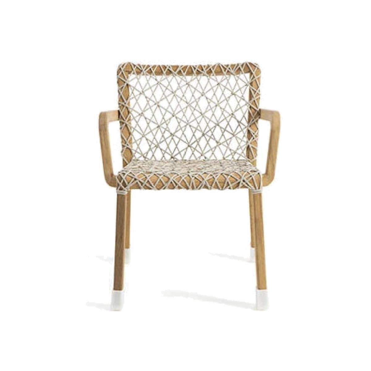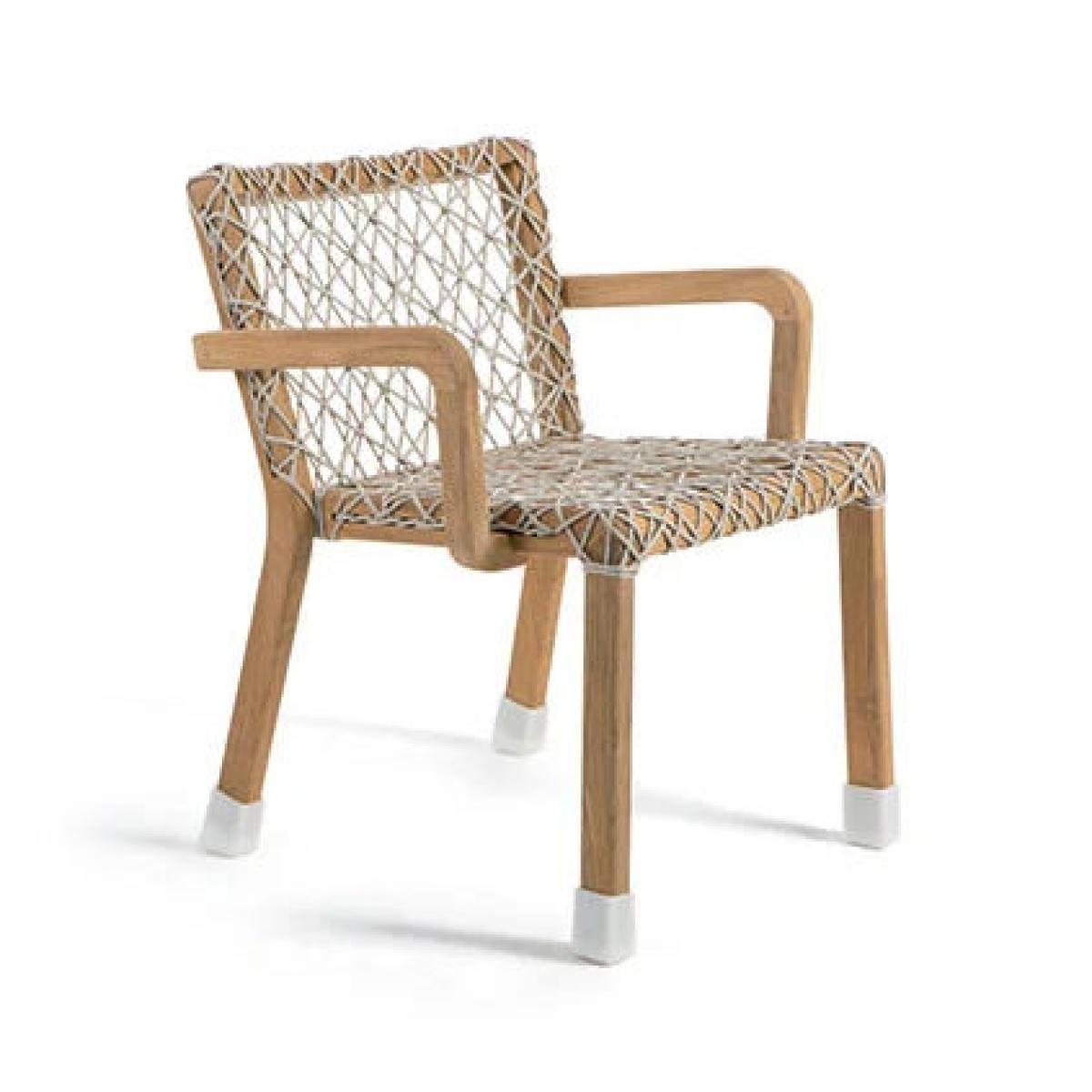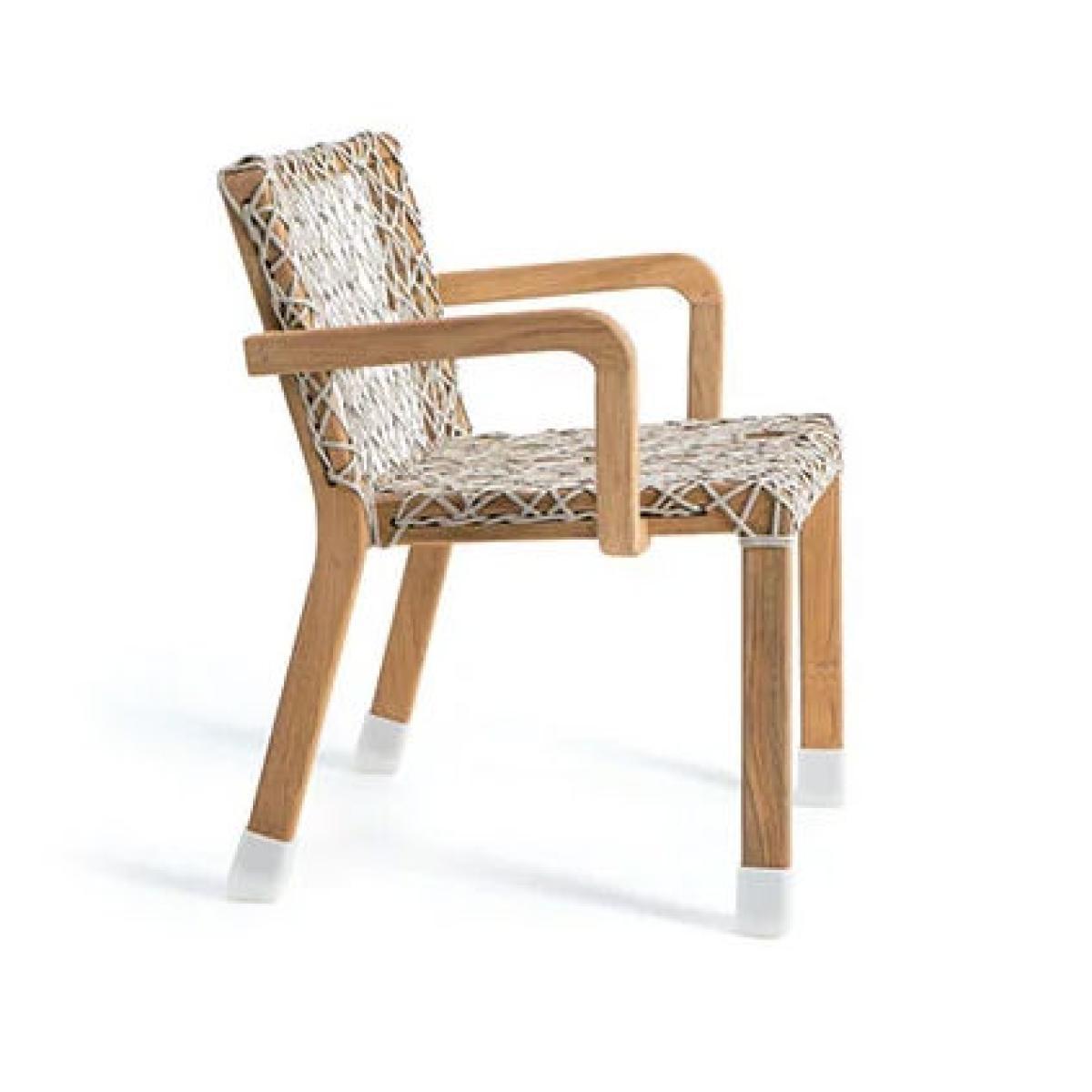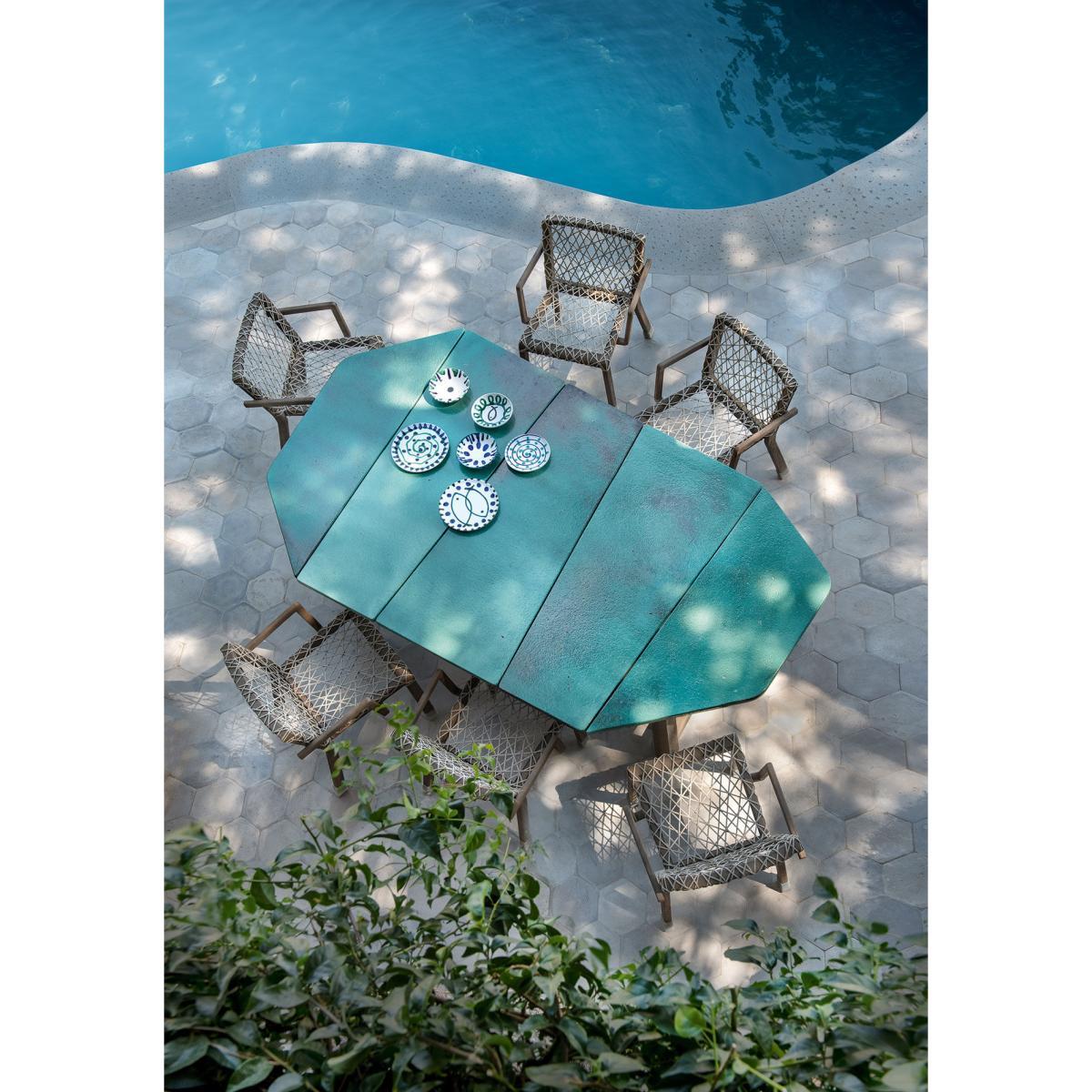 Famous around the world, designer Paola Navone draws her inspiration from her travels. Exotic, natural and unique: that’s the essence of the Rafael collection. This outdoor furniture is the result of the designer's exceptional ability to reinvent the aesthetic and formal thought of distant cultures and landscapes. The raw beauty of materials such as teak, marble and enamelled lava stone is enhanced by a sophisticated chromatic range. The natural, primitive forms are characterised by their deconstructed, solid lines that are a little tribal. Welcoming and organic, this collection exudes a comforting, vibrant charisma. This new collection tells of a philosophy of life in the open air, unexpected and exciting, where design is inspired by nature, and creativity becomes escape. This armchair combines a teak structure with incredible destructured synthetic ropework. Very ethereal, this openwork surface plays with transparency, creating a surprising interplay of graphic patterns. The taut cord is soft and comfortable. The ropes are specific for outdoor use and are made of a synthetic material that’s extremely resistant to UV rays, abrasion and atmospheric agents. FSC-certified teak is of the highest quality and comes exclusively from controlled regrowth plantations which observe strict reforestation processes. It offers excellent properties in terms of lifespan, durability and beauty, even when exposed to changes in temperature, water, humidity and salinity. The sanded teak version has a certain charm of yesteryear.
