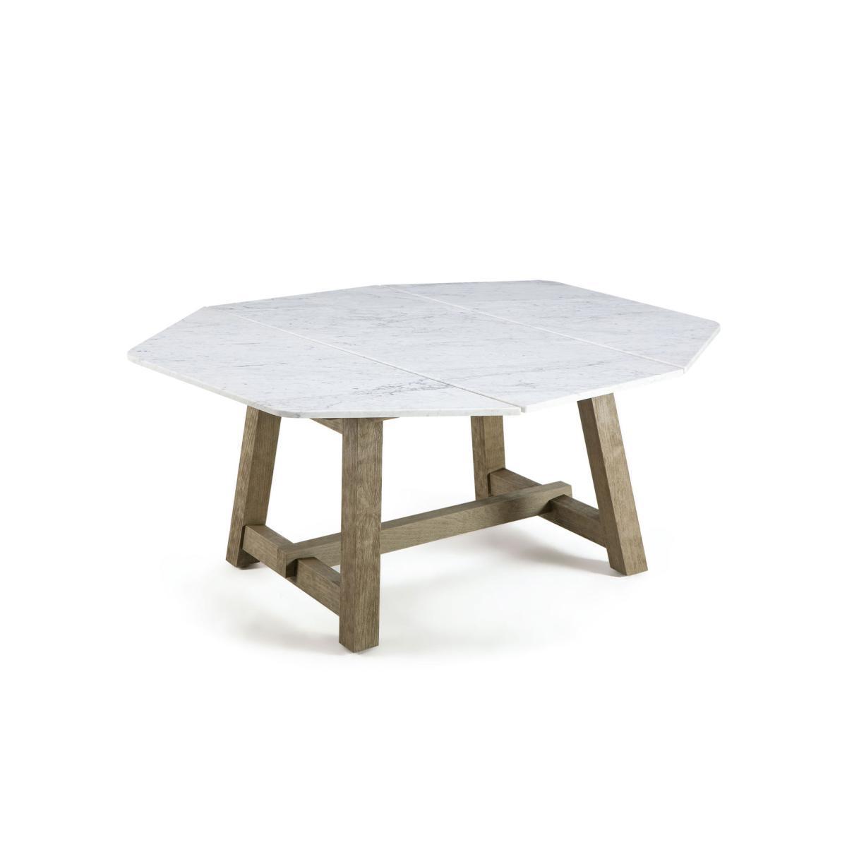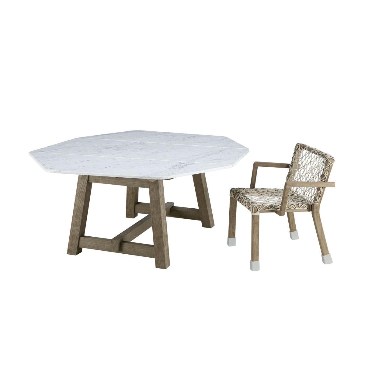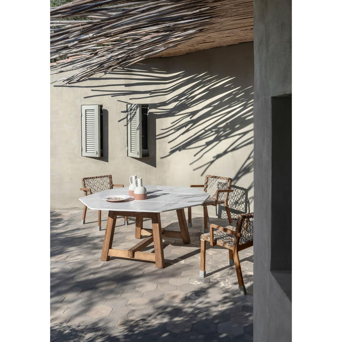 Famous around the world, designer Paola Navone draws her inspiration from her travels. Exotic, natural and unique: that’s the essence of the Rafael collection. This outdoor furniture is the result of the designer's exceptional ability to reinvent the aesthetic and formal thought of distant cultures and landscapes. The raw beauty of materials such as teak, marble or enamelled lava rock is combined with natural, primitive, welcoming forms. Paola Navone defines these destructured, solid lines as "tribal". The Rafael collection takes on an organic dimension, exuding comforting, vibrant charisma. This new collection tells of a philosophy of life in the open air, unexpected and exciting, where design is inspired by nature, and creativity becomes escape. This octagonal table stands out with its fragmented, destructured design. The rough forms seem to have been carved into the rock. The marble top consists of three parts with faceted geometric lines, assembled to form a graphic composition. The marble is subjected to a treatment that, on the one hand, protects the surface and, on the other, gives a matt finish. The marble surface has exceptional characteristics in terms of hygiene, resistance to atmospheric agents, stains, scratches, and low water absorption. FSC-certified teak is of the highest quality and comes exclusively from controlled regrowth plantations which observe strict reforestation processes. It offers excellent properties in terms of lifespan, durability and beauty, even when exposed to changes in temperature, water, humidity and salinity. The sanded teak version has a certain charm of yesteryear.