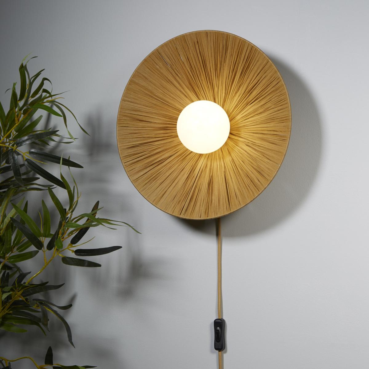 This modern wall light will elevate any room. The raffia circular style has a central opal ball which is the light source. The stylish wall light looks like art, making a stylish as well as functional light, ideal for any living room, bedroom or entrance way. The on off switch sits under the main light for ease of functionality.