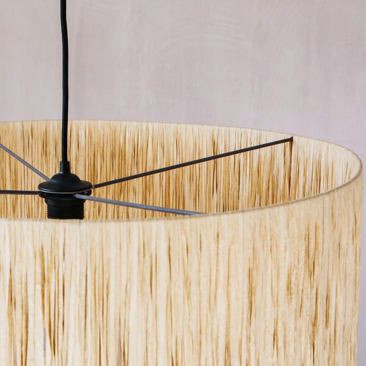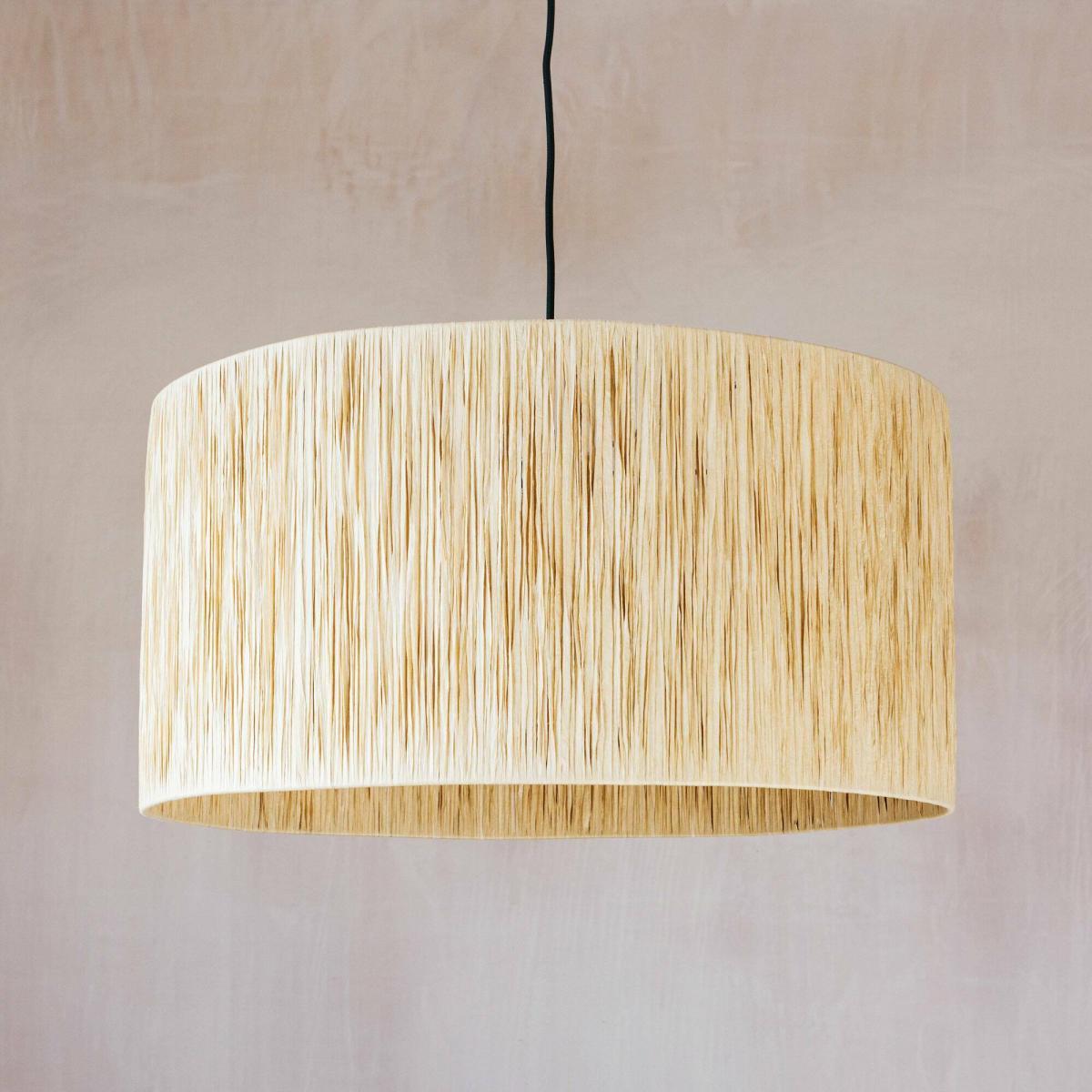 Honey coloured raffia is wrapped around a simple metal frame for a natural and textured pendant light, perfect for bohemian or tropical inspired interiors.