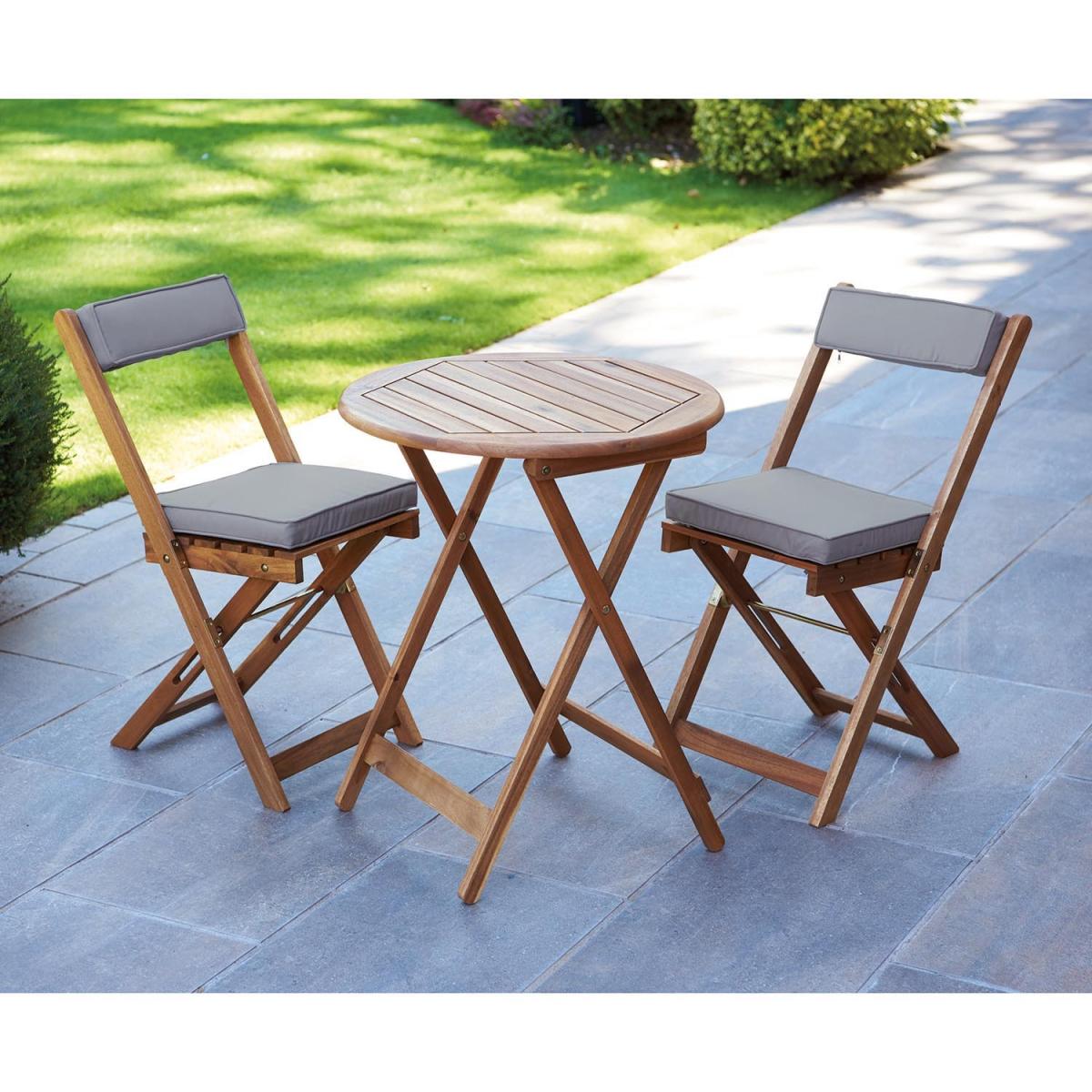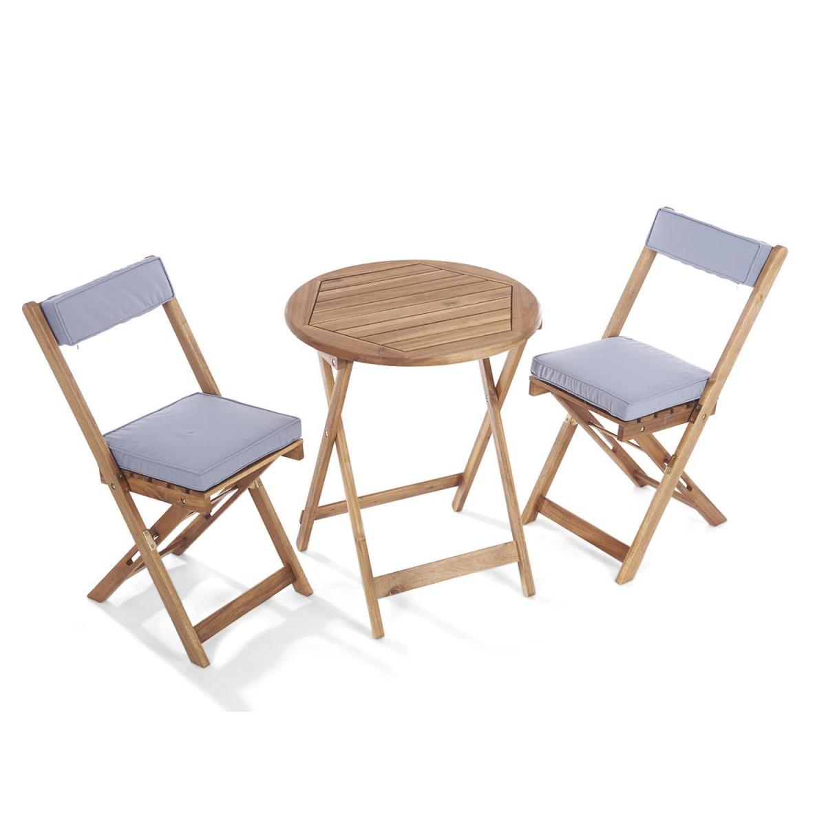 The high-quality Raffles Bistro Set is crafted from solid Acacia, a smooth natural hardwood with very few knots and renowned for its extreme hardness and resilience to weathering. The Bistro Set makes a perfect addition to any garden so you can enjoy lazy days relaxing in the garden or catching up with friends. It is hand-oiled in a forest white or natural finish. Chairs come with attractive and detachable colour-coordinated grey 5cm deep padded cushions. Cushion covers are polyester, weather-resistant and removable for washing. Round folding table with two folding chairs. Table Size: H72 x 60cm diameter. Folds flat for storage to 98 x 5.5cm.