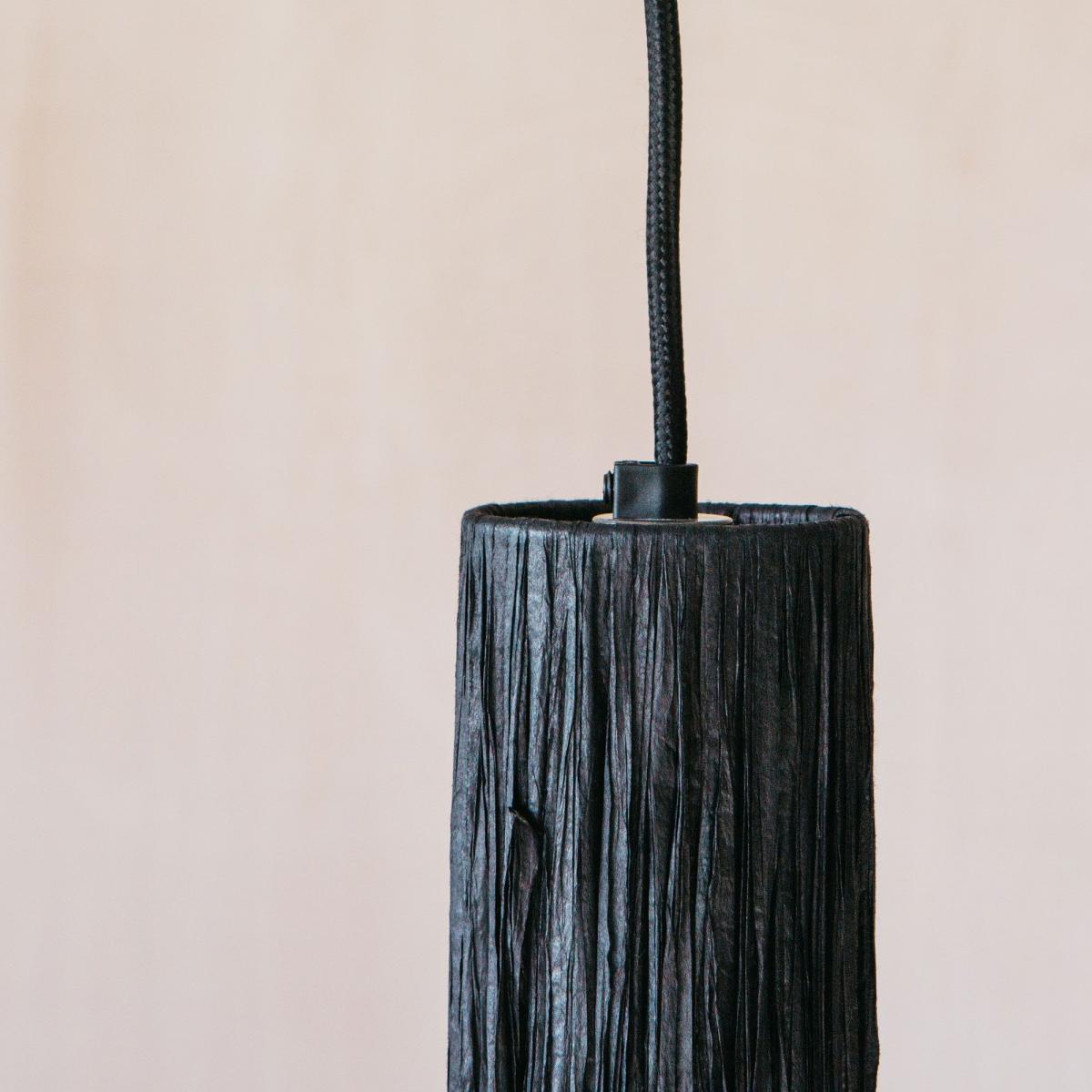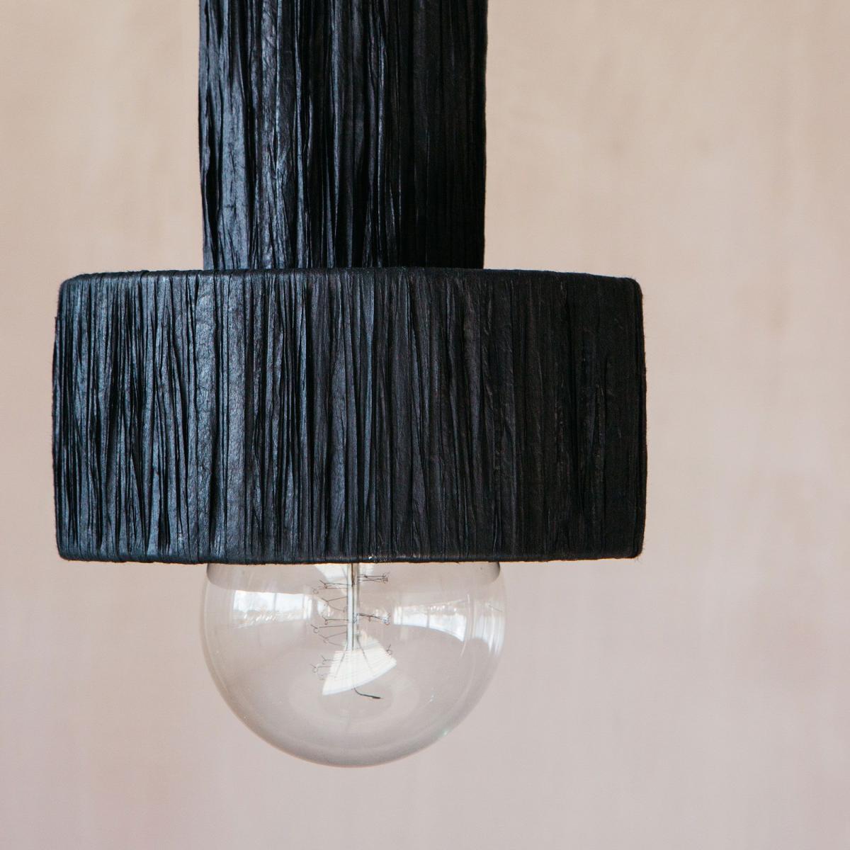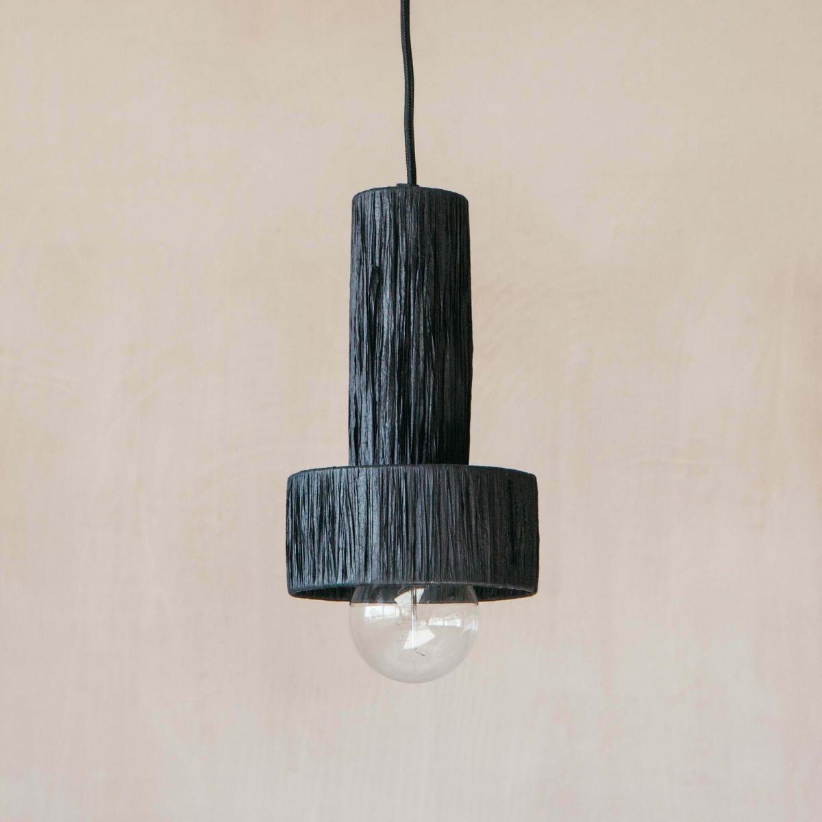 An unusually shaped pendant light handcrafted from natural raffia and metal with a contemporary black finish, perfect for adding an organic texture to your space.