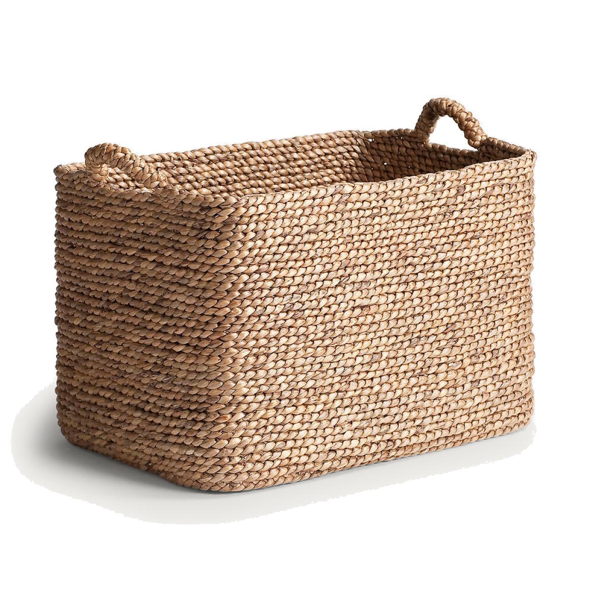 Both aesthetic and functional, this rectangular braided basket will be perfect in a living room to store magazines or in a room for linen or toys. Product Details • Made from woven water hyacinth. • Artisanal craftsmanship. Each piece is unique. Dimensions • L.48 x D.H30/40cm • 43cm with handles