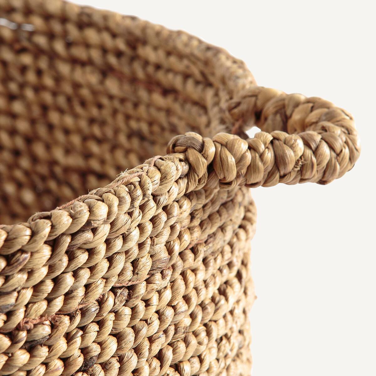 Raga round woven basket. As lovely in a living room to store magazines as it is in a bedroom to store toys. Product Details • Made from supple, woven water hyacinth • 4 handles • Artisanal craftsmanship. Dimensions • Diameter: 50cm • Height: 31cm • Height with handles: 37cm