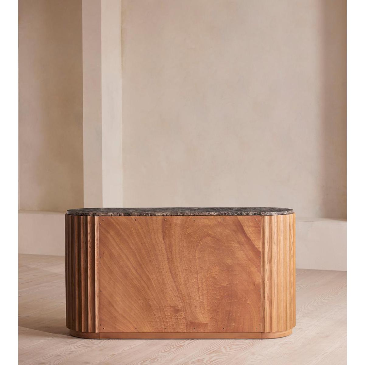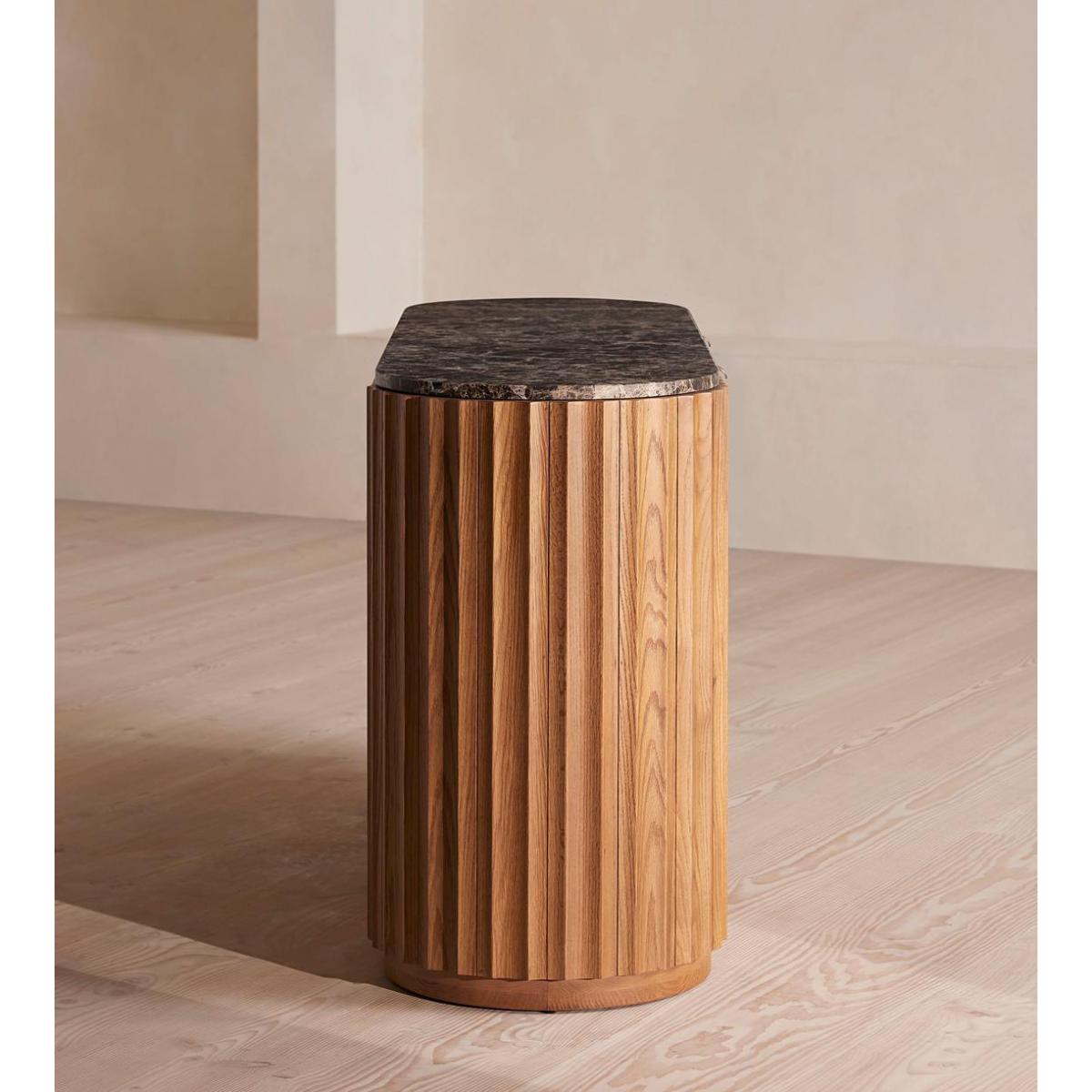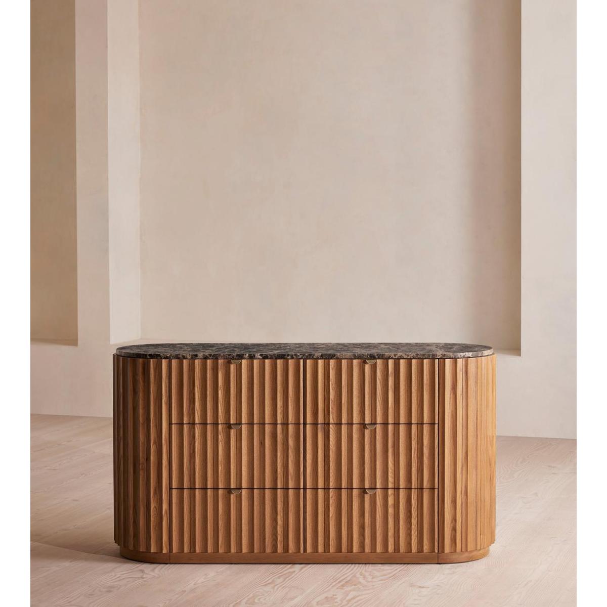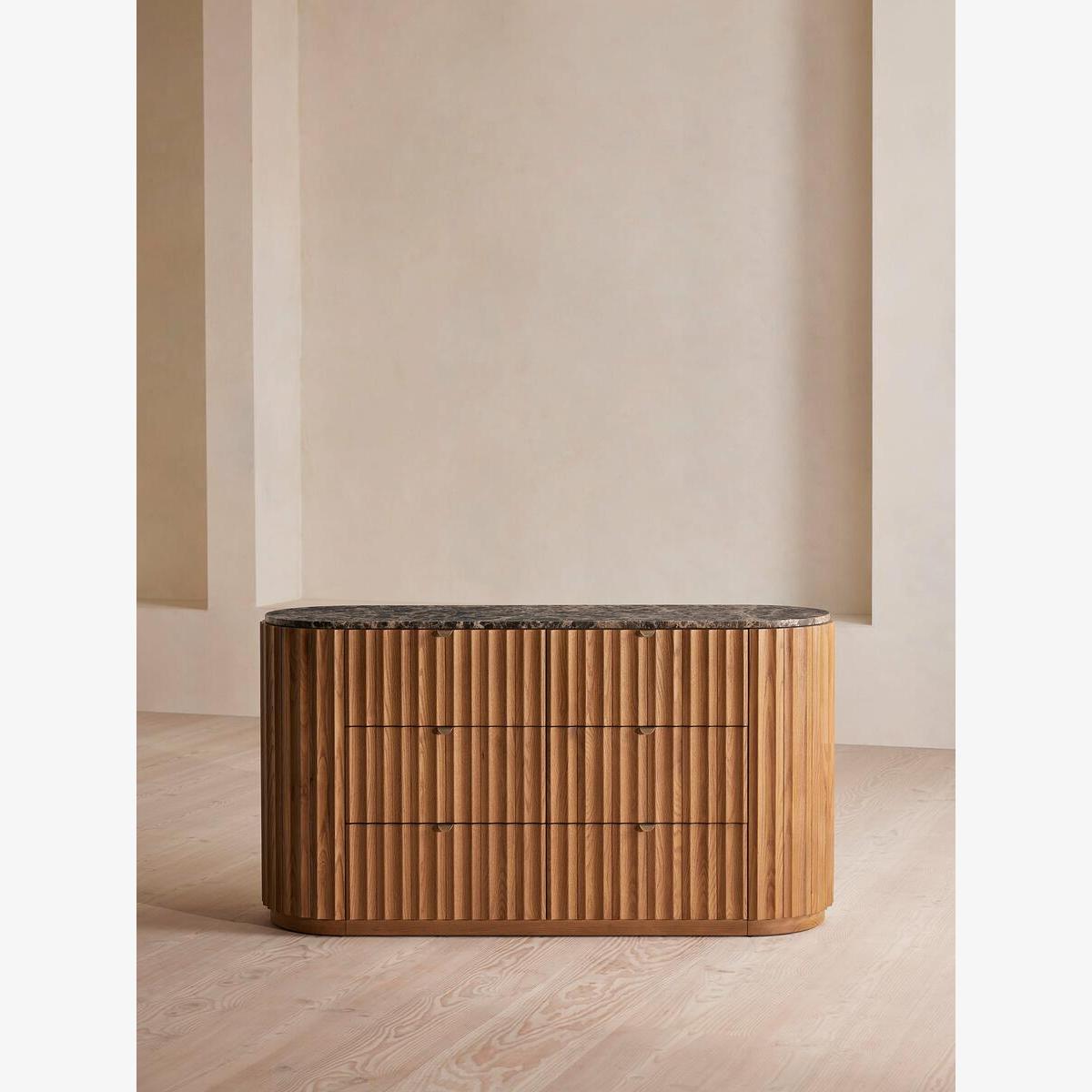 Our Railton dresser has been crafted with a solid oak-clad frontage to echo the Brutalist exterior of Soho House Rome with sculptural, curved lines. A honed Spanish Emperador marble top creates a rich contrast against the oak's warm wood tones. The wraparound shape is defined with sculptural ridges to create depth and dimension in the bedroom, living room or hallway. Six-drawer oak dresser Solid oak-clad frontage Mid-tone finish Dark Emperador marble top Marble sourced from Spain Antique brass finish handles Inspired by Soho House Rome