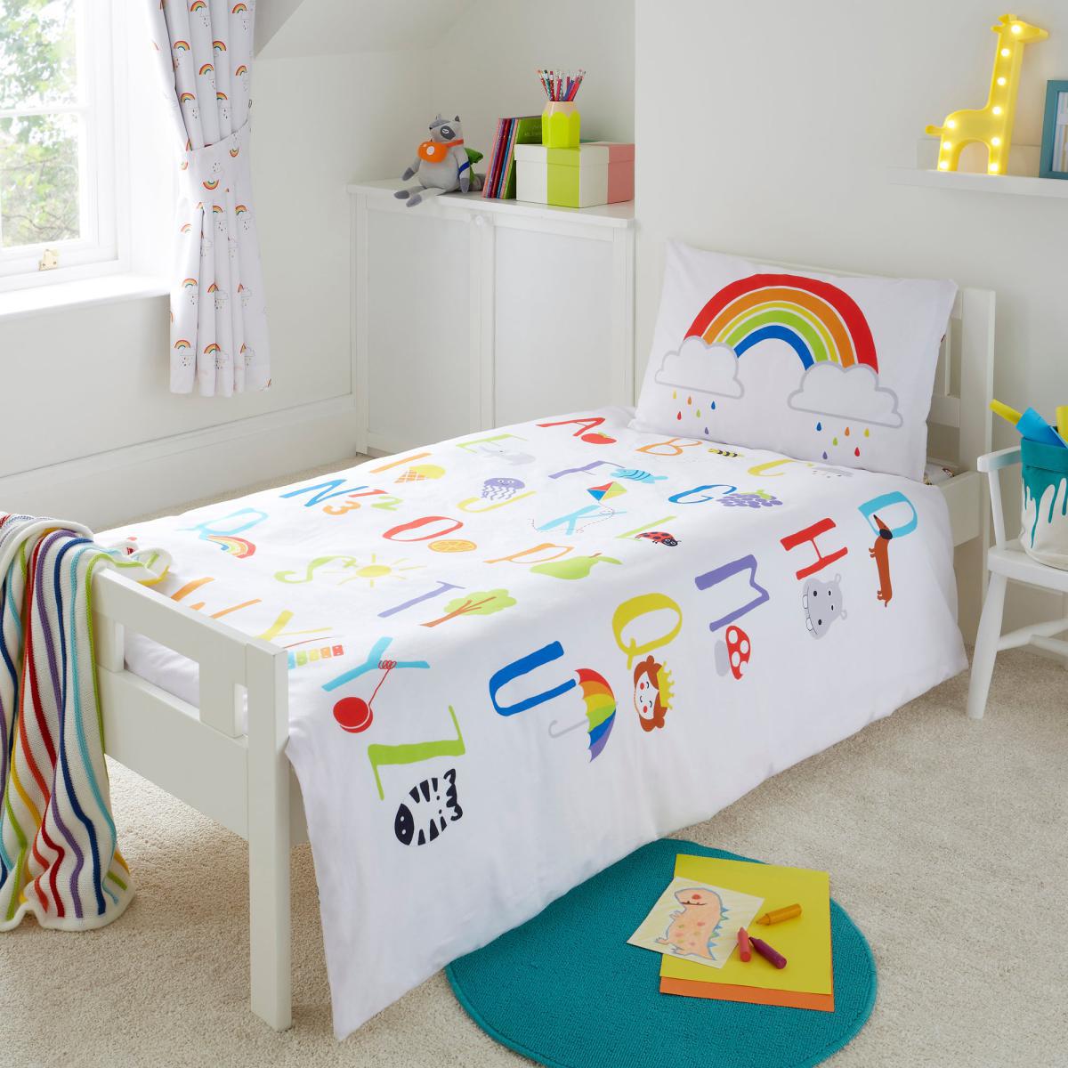 I love the rainbow cotton bedding - it’s a bright, cheerful choice that adds a playful touch to any child's room. The colourful alphabet and whimsical illustrations are perfect for fostering a learning environment while being fun and inviting. It works well in modern, Scandinavian-inspired interiors where clean lines and light colours dominate, creating a fresh backdrop for the vibrant print. For practical styling, pair it with neutral or pastel accessories to keep the focus on the bedding, and consider adding colourful cushions or throws to tie the look together. Its 100% cotton fabric ensures softness and breathability, making it a practical yet stylish choice for everyday use.