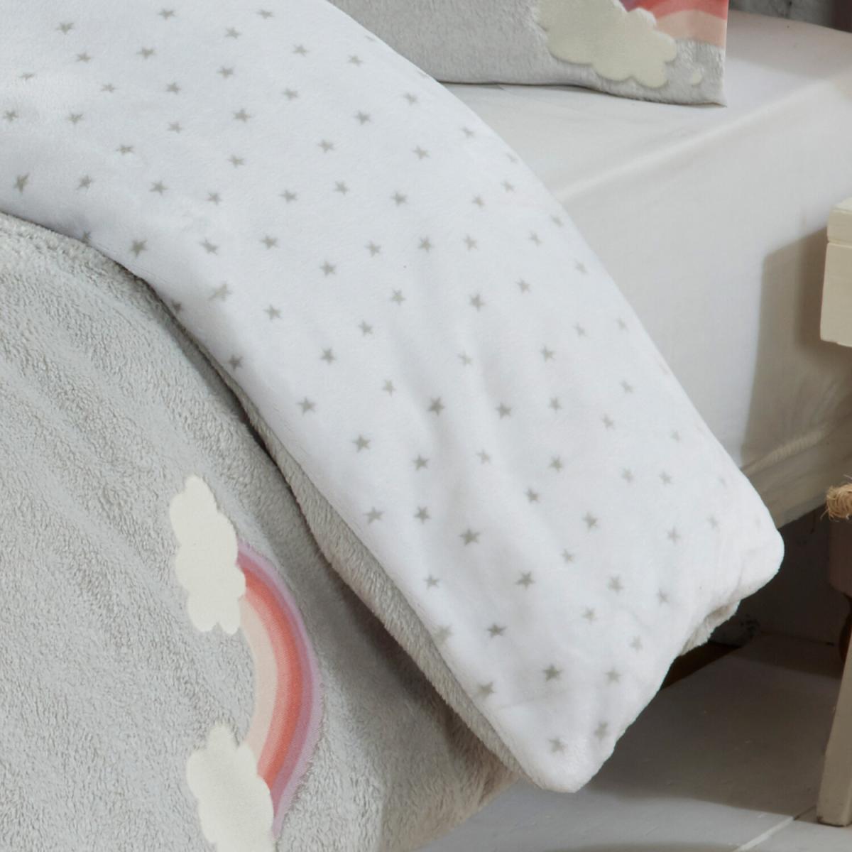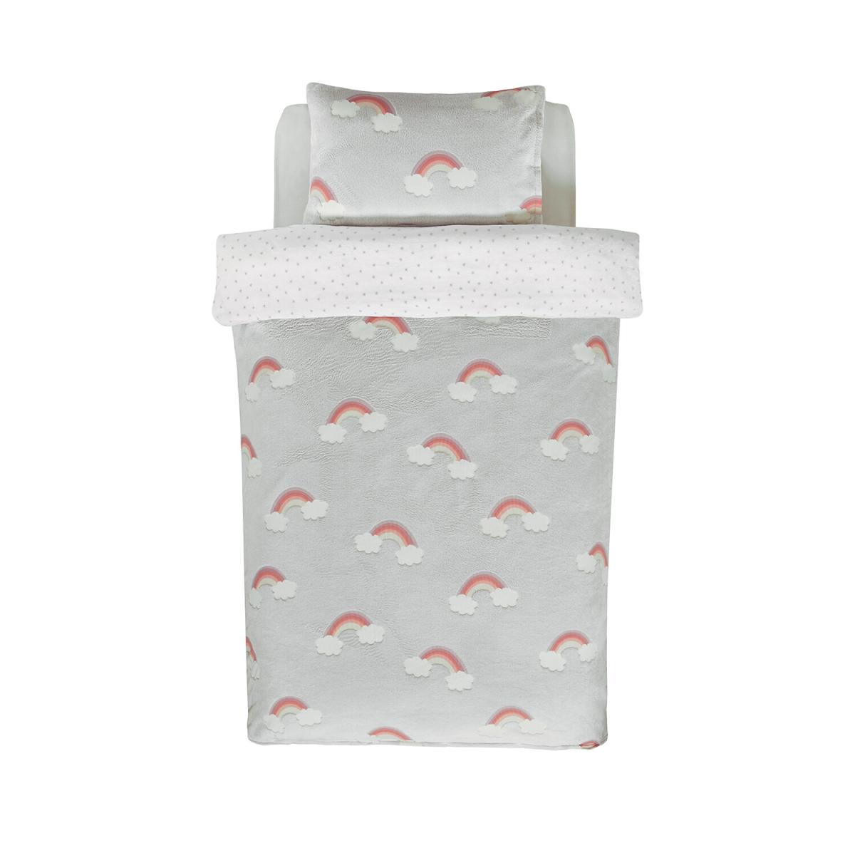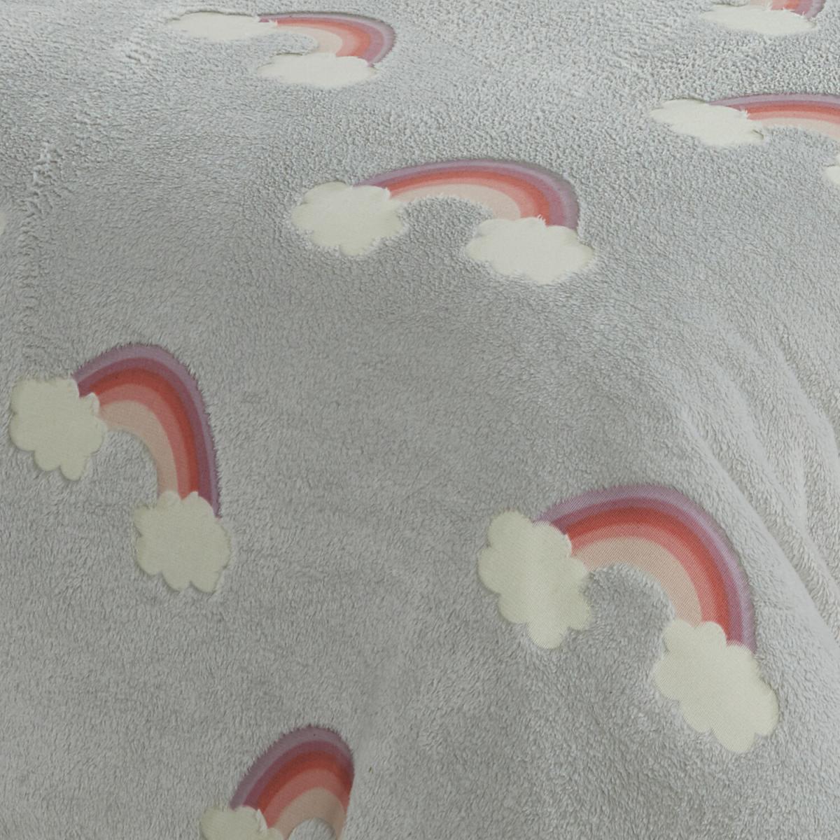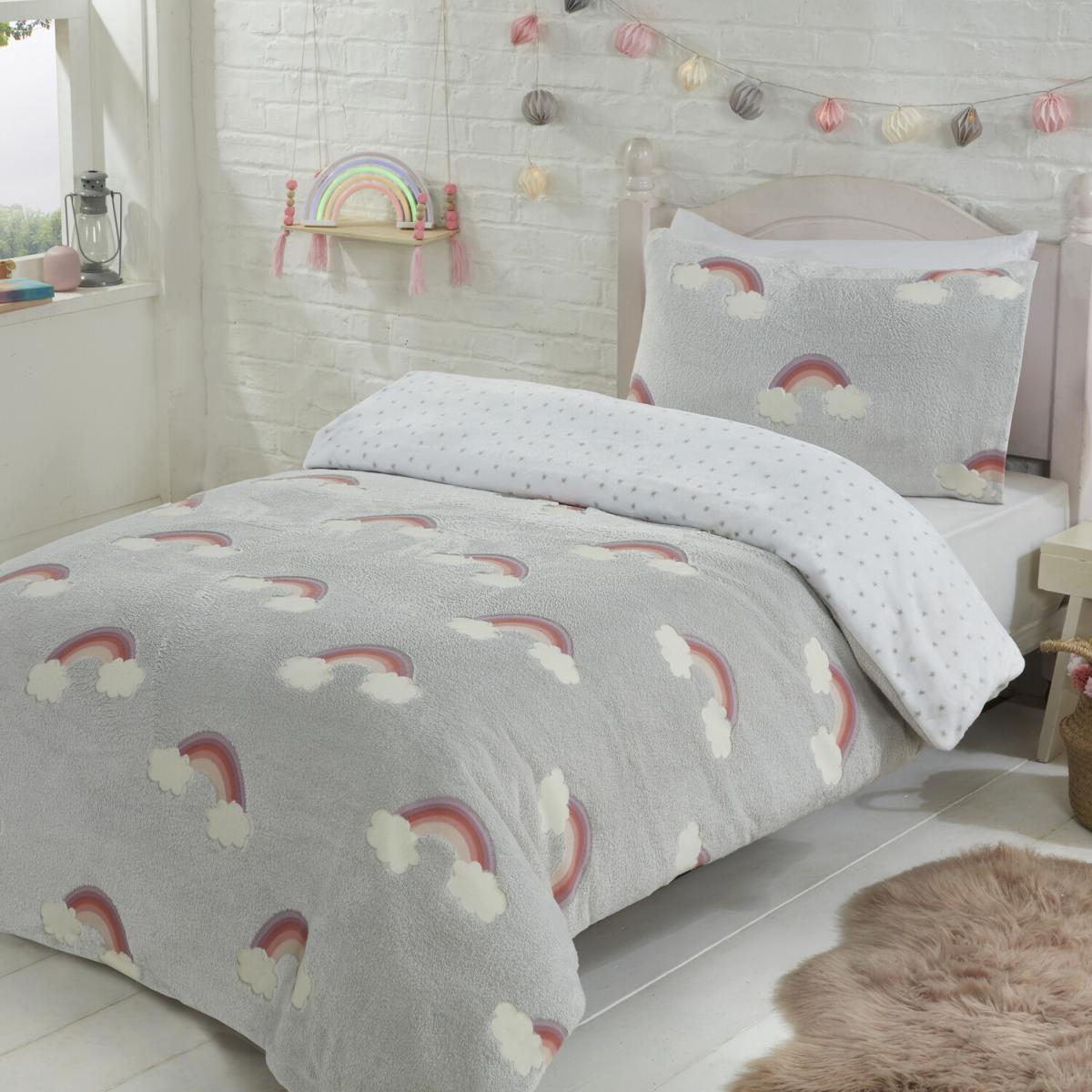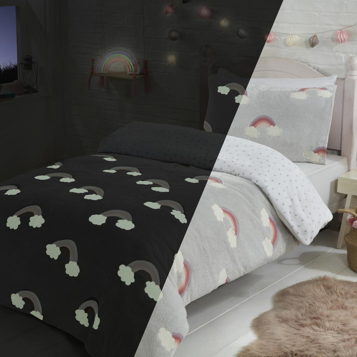 A beautifully fun way to dress your bed, this Rainbow Glow in the Dark Duvet Cover and Pillowcase Set is sure to bring a smile to anyone's face. Featuring a super-soft fleece-effect cover, this duvet is decorated with gorgeous pink rainbows and clouds that glow in the dark, making it an ideal choice for children. Great for keeping out the cold, this reversible set is sure to make your space stand out whilst keeping you warm.