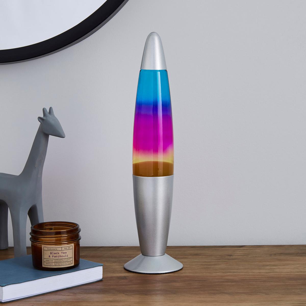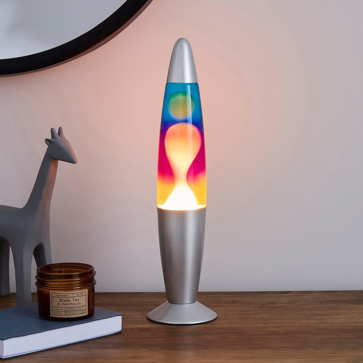 Introduce a retro lamp to your home décor with this Rainbow Lava Lamp, filled with white liquid wax which moves once the lamp is switched on. Beautifully crafted with a modern silver design with rainbow coloured glass that beams a relaxing soft light. A perfect way to add a fun, novelty element to any living space. This table lamp comes with a 2 year guarantee. Click. Here. To view our Terms and Conditions.