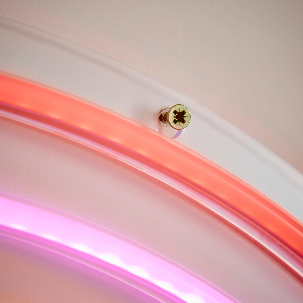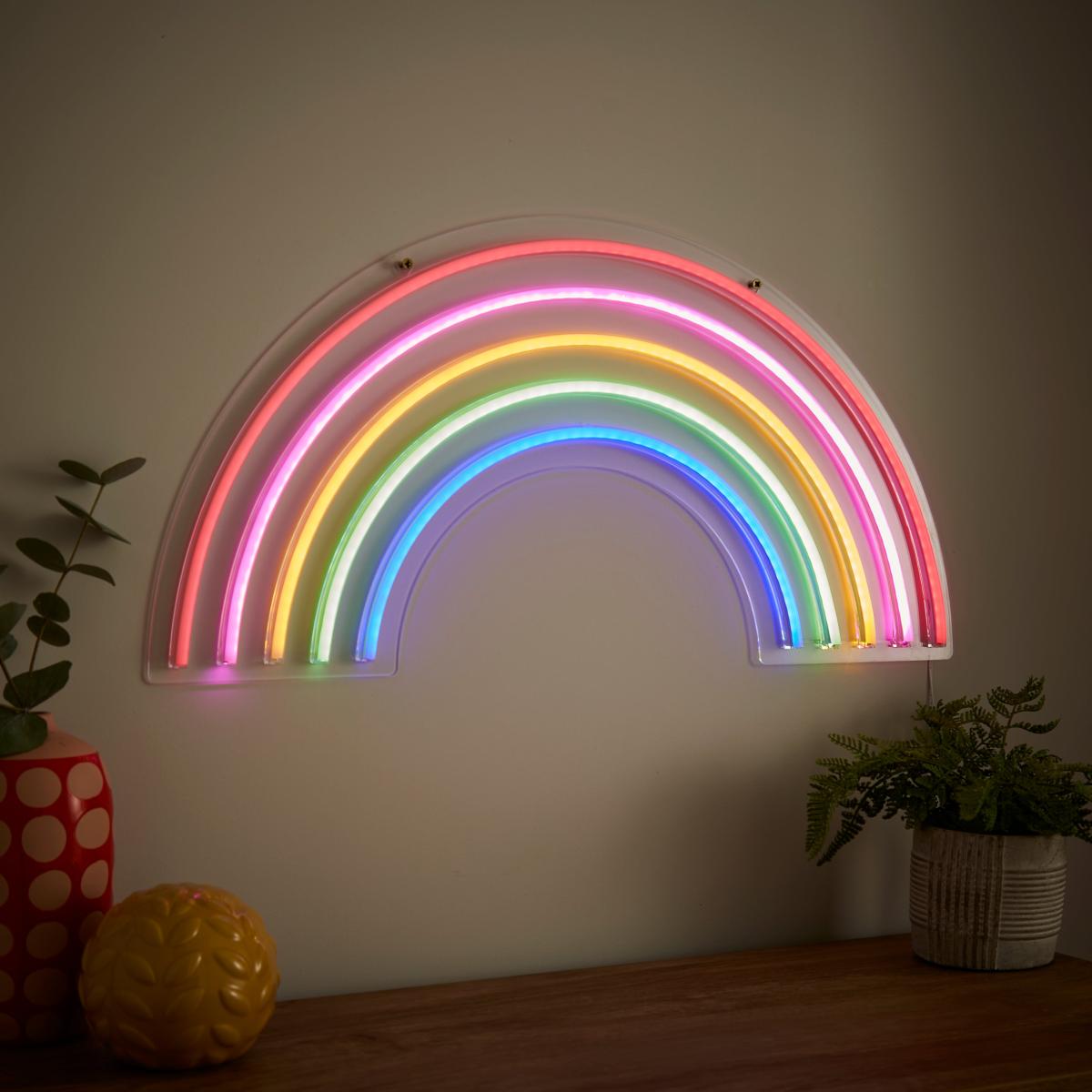 * Rainbow Design* Multicoloured LE Ds* USB Operated - Multi-Room Use Add a burst of colour to your space with the Rainbow Neon Wall Light. The stunning, vibrant rainbow-coloured LED light instantly brightens your room. Stylish and USB operated for multi-room use, it can be easily fixed on the wall or leaned against it for a playful touch.