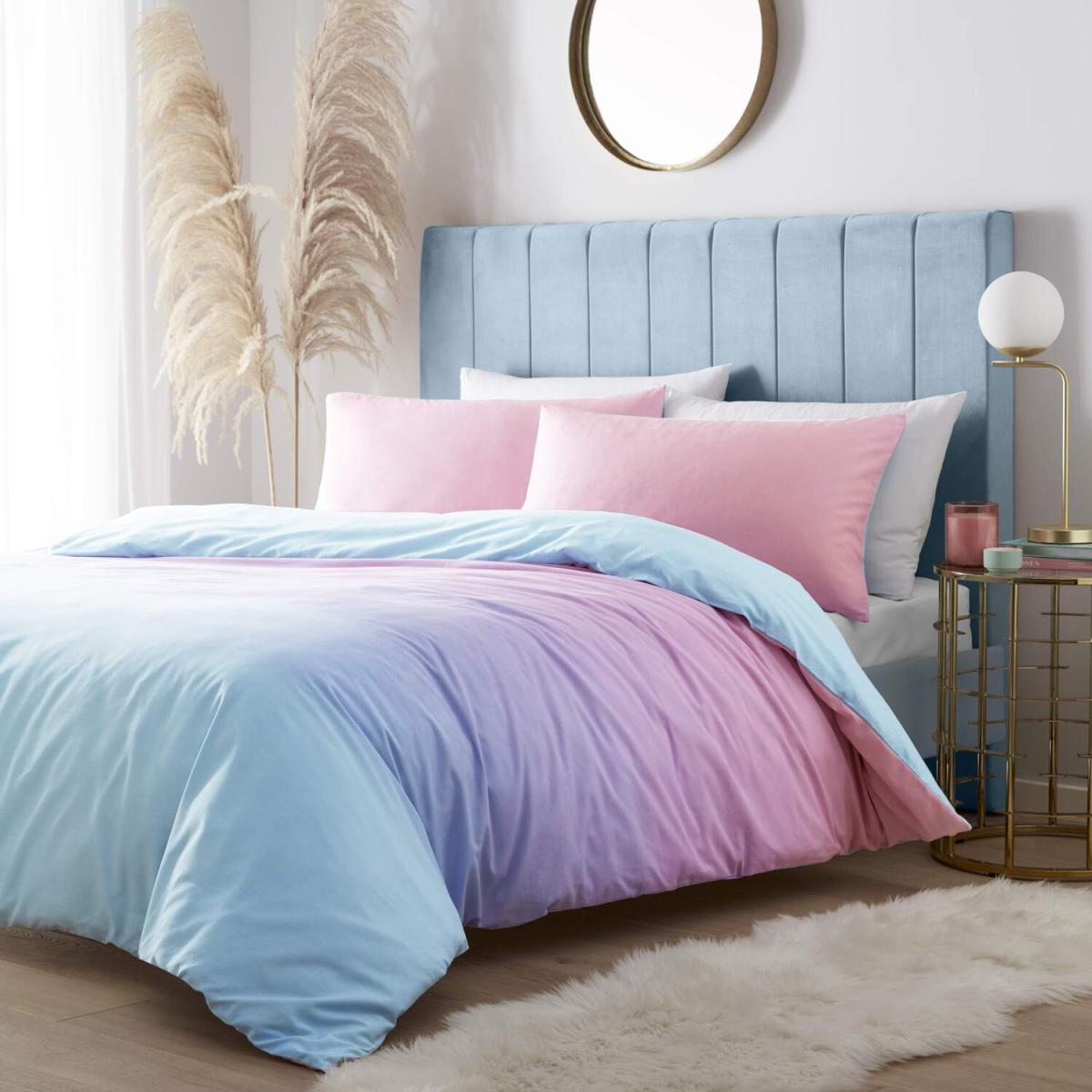 A truly stylish rainbow ombre duvet cover set with gradual shades of blue pink that allows you to express your colourful character and playful side. This uniquely blended watercolour-effect bed linen fits perfectly into any modern home and offers an eye-catching contemporary style to revitalise your bedroom. Made for soft, easy-care polycotton which requires minimal ironing. Proudly designed and developed in the UK. This bed linen set has been ethically produced in accordance with STANDARD 100 by OEKO-TEX.