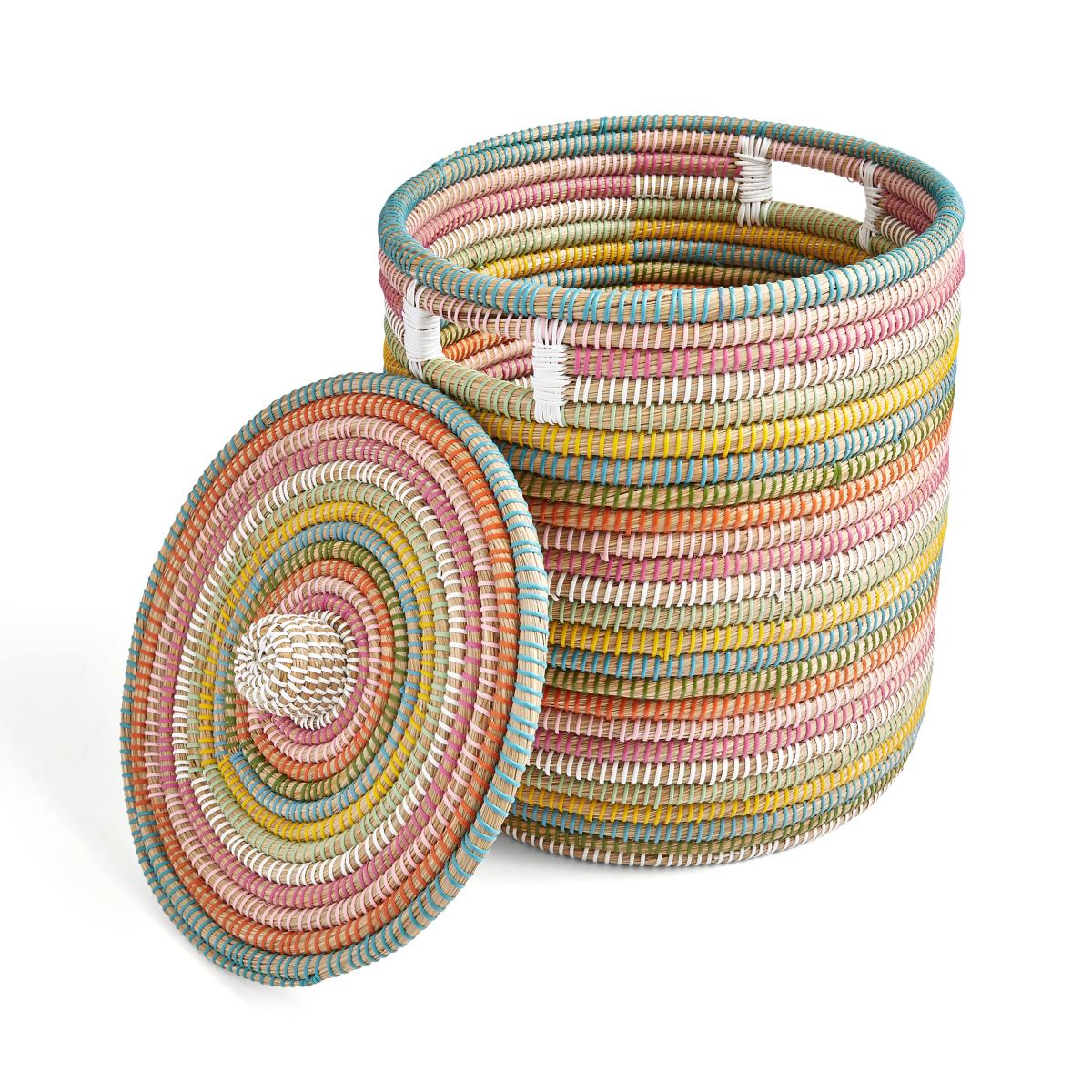 * Handmade* Made from straw* Wipe clean with a soft cloth* Includes matching lid Store laundry, toys or blankets in this round straw basket for a stylish storage solution to your home. With an included lid and beautiful multicoloured design this basket is great for hiding unwanted messes.